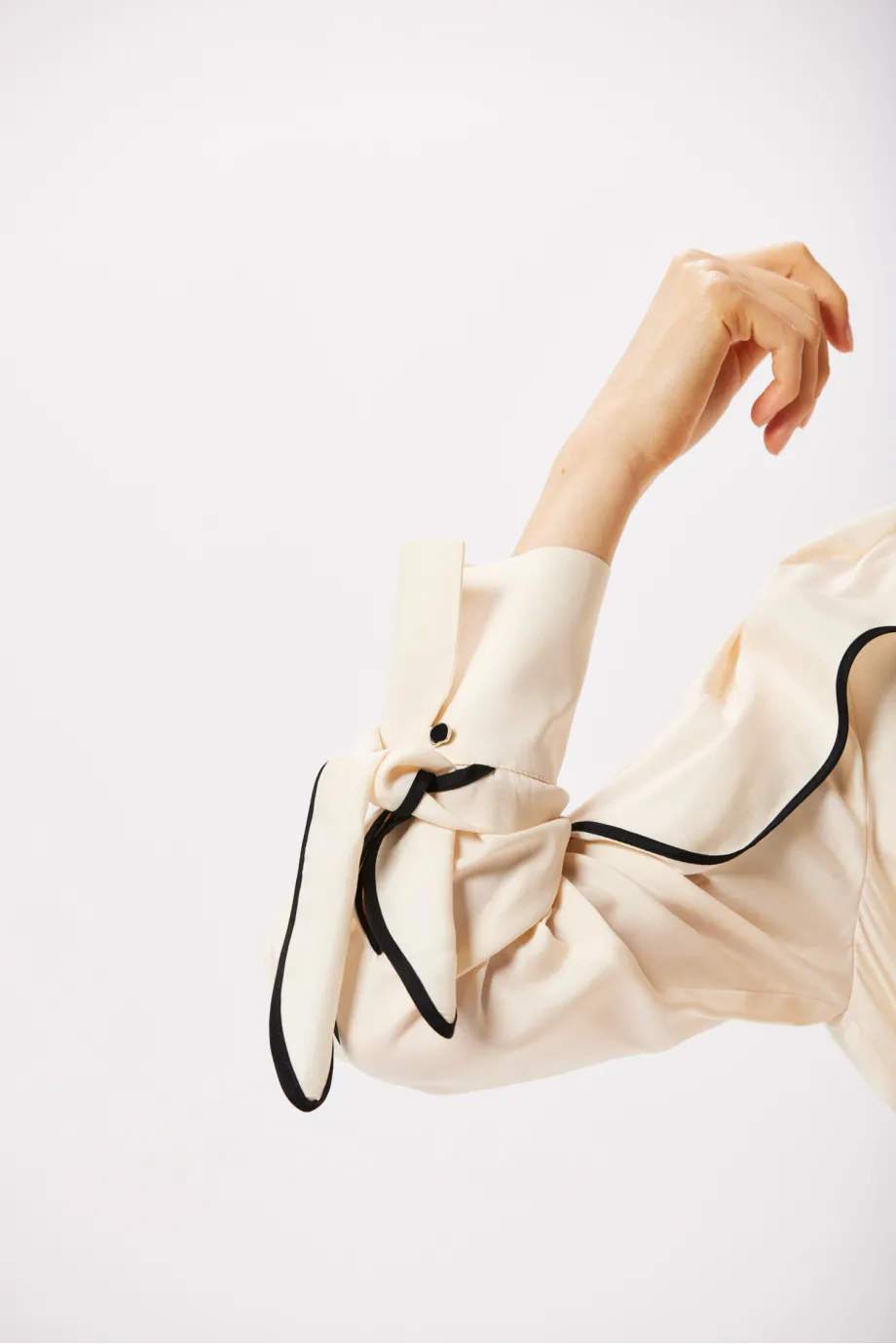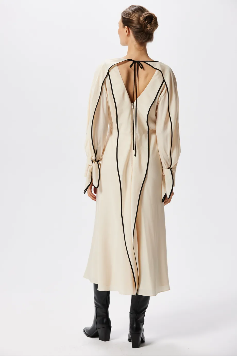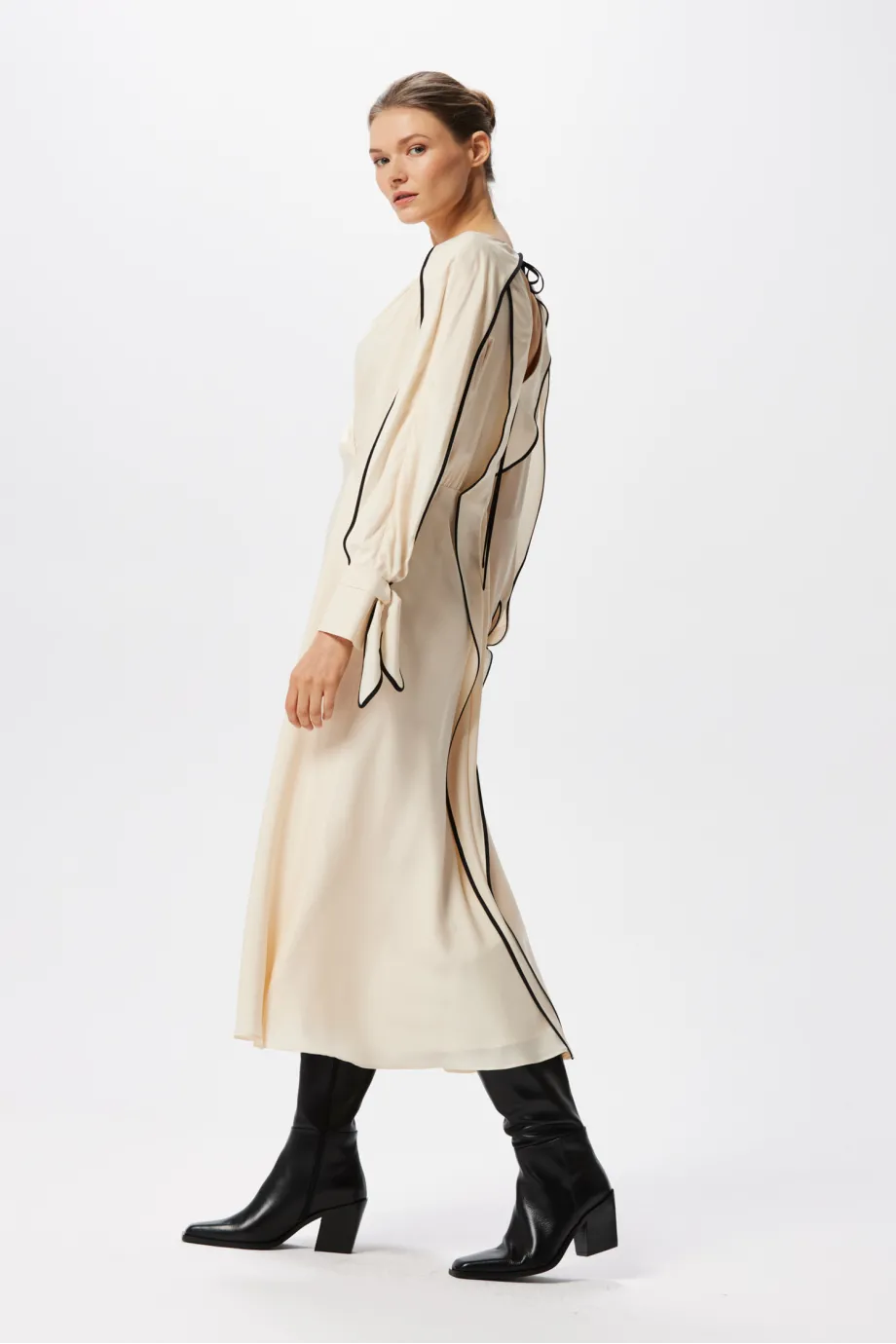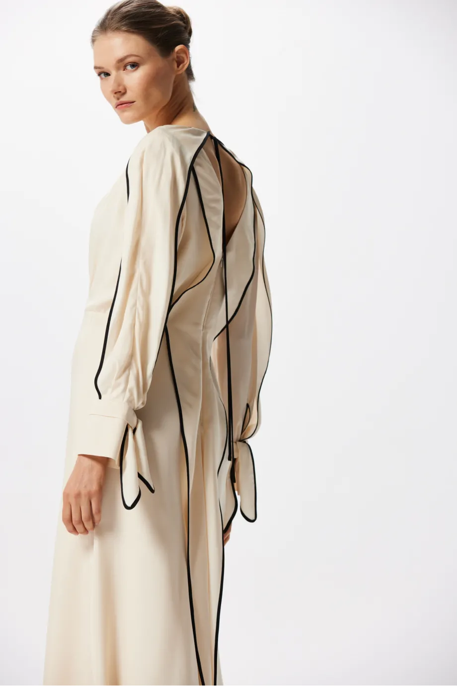 Jednak najmocniej rzucają się w oczy czarne lamówki, wykańczające ozdobne, luźne fale materiału wzdłuż rękawów oraz całego stroju z tyłu. Sukienka z jedwabiu Patrizia Aryton na plecach ma dekolt i wiązanie pod karkiem cienką tasiemką, uformowaną bezpośrednio z lamówki. Zastosowana tutaj, supermodna w tym sezonie, linearność jest przemyślana i niezwykle spójna. Czarne elementy sprawiają wrażenie przepływających przez całe ubranie, dlatego mimo swojej kontrastowości nadają mu przyjemną lekkość.
