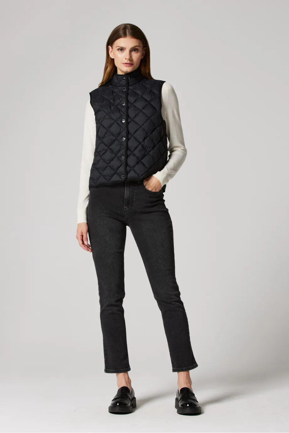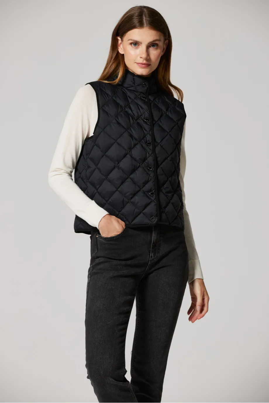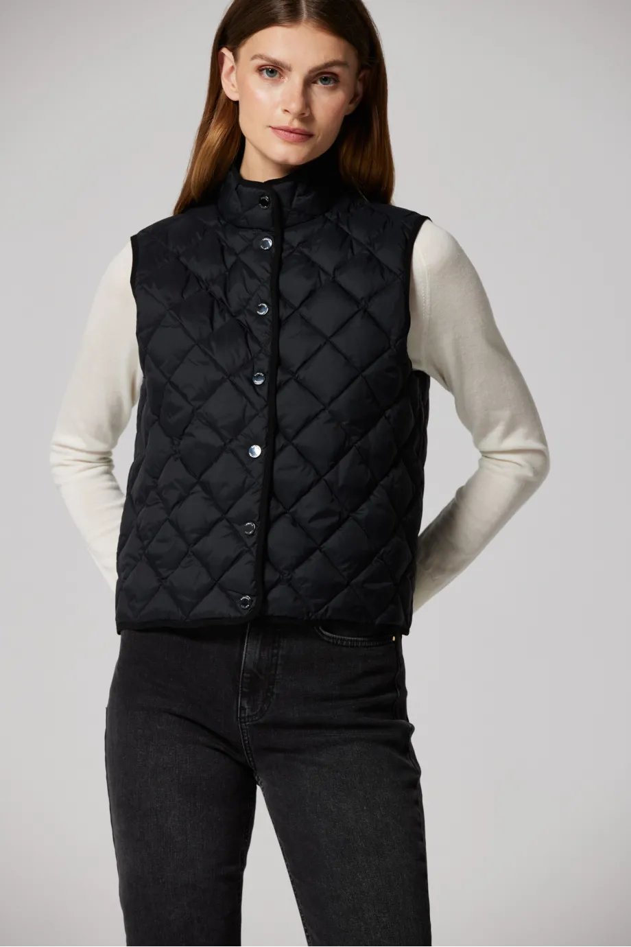 Ta cienka kamizelka pikowana damska, krótka ale dobrze chroniąca przed wiatrem i chłodem, posiada zewnętrzną warstwę w romby i naturalne wypełnienie. Napy pozwalają regulować stopień jej zapięcia. Praktyczną stójkę, która zastąpi Ci golf, szal lub komin, możesz zamknąć do samej góry lub rozłożyć jak kołnierz.