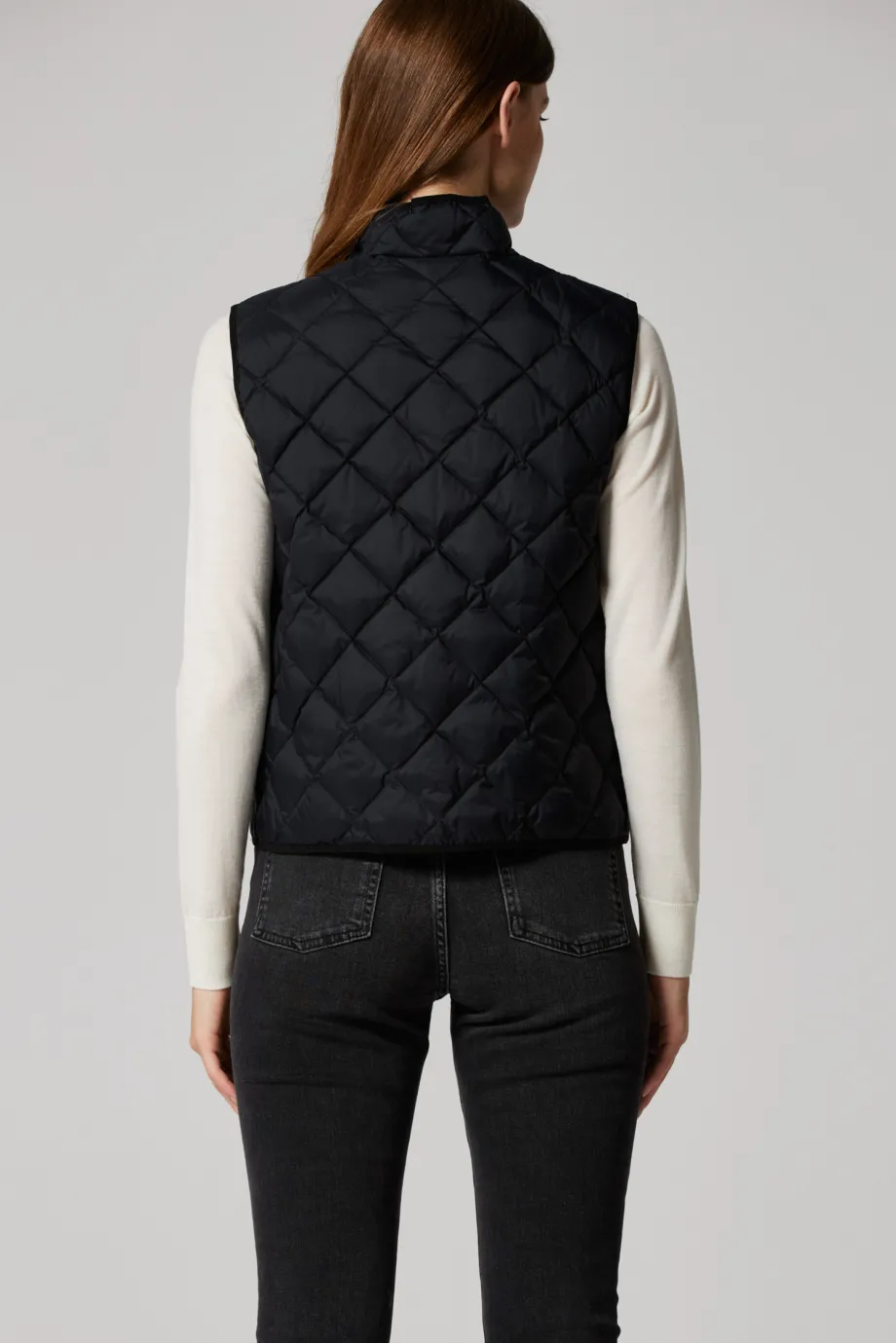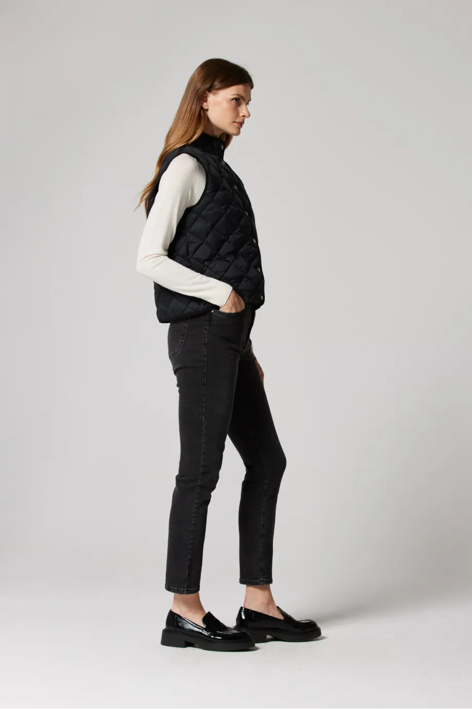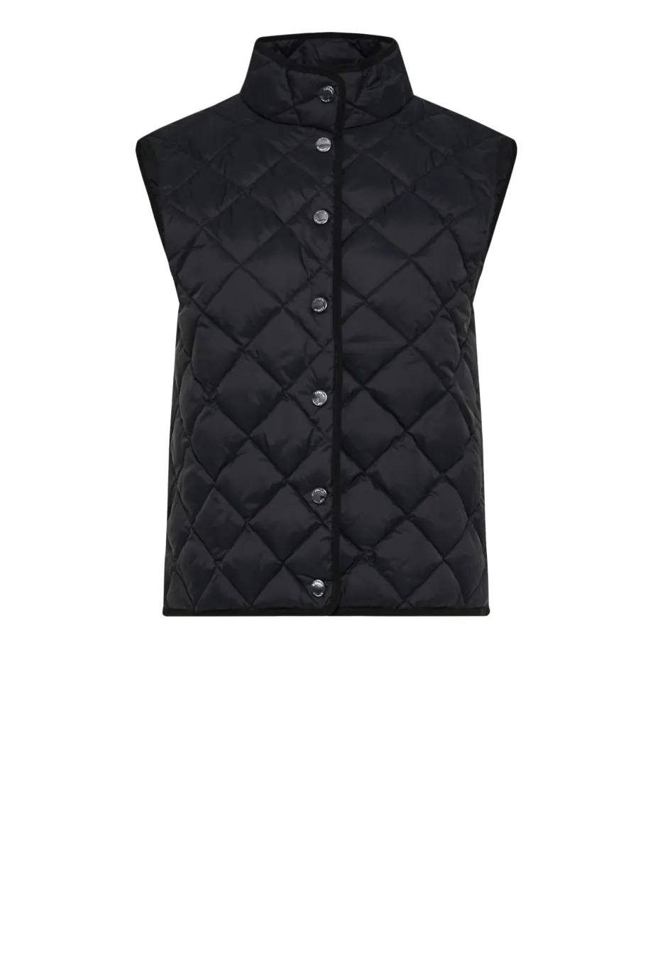 Ta cienka kamizelka pikowana damska, krótka ale dobrze chroniąca przed wiatrem i chłodem, posiada zewnętrzną warstwę w romby i naturalne wypełnienie. Napy pozwalają regulować stopień jej zapięcia. Praktyczną stójkę, która zastąpi Ci golf, szal lub komin, możesz zamknąć do samej góry lub rozłożyć jak kołnierz.
