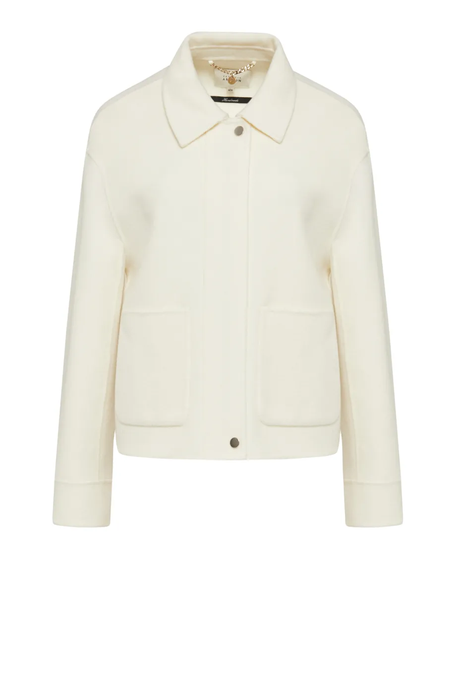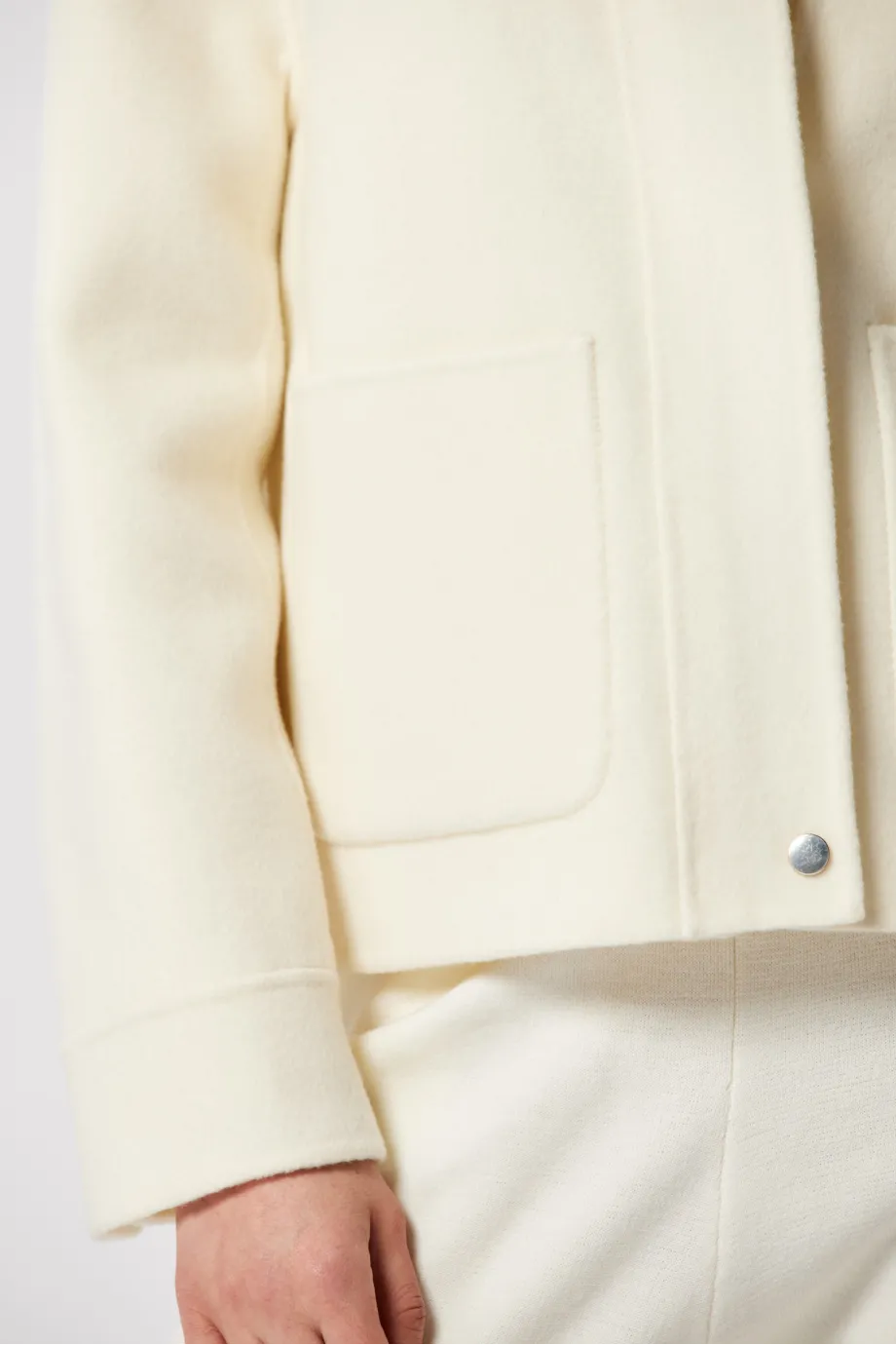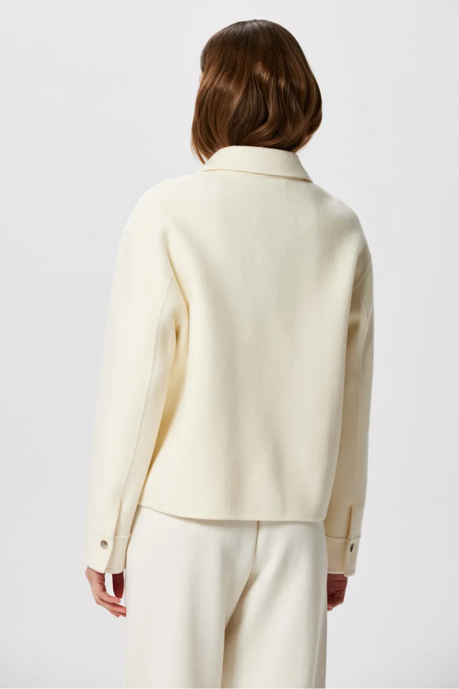 Materiał, z którego wykonano kurtkę, to doubleface, czyli tkanina o dwóch prawych stronach. Jest miękka w dotyku i ma lejącą fakturę, dlatego nie wymaga zastosowania podszewki. Wytworzono ją ze 100% wełny owczej, pochodzącej od sprawdzonego dostawcy, legitymującego się certyfikatem Responsible Wool Standard.