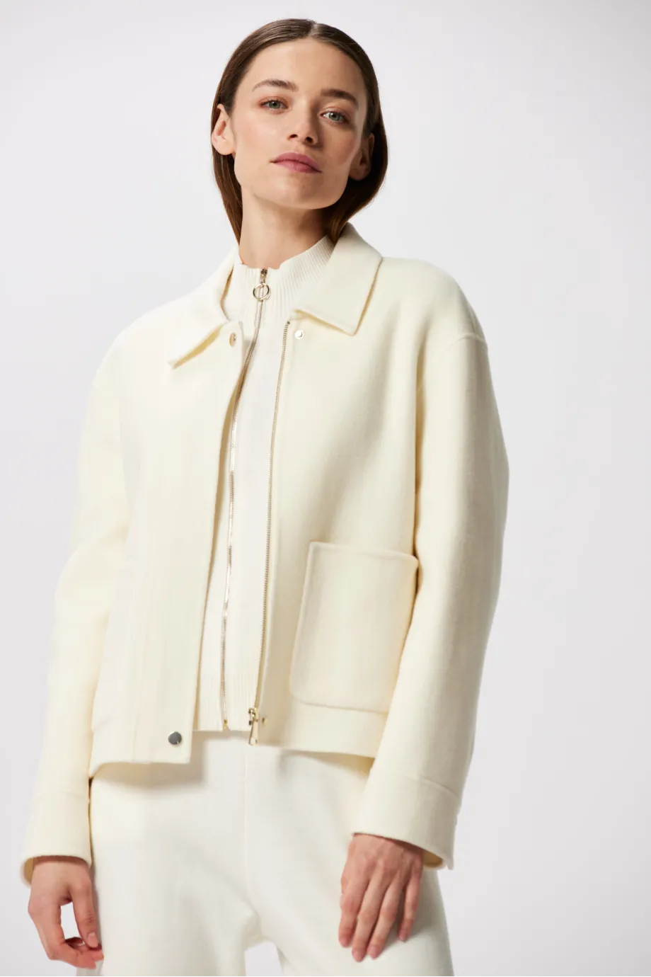 Krótka kurtka wełniana, damska, reprezentuje proste, luźne formy, sięgające delikatnie pod talię. Długie rękawy z rozcięciem wykończono zapięciem na zatrzask. Cała kurtka zapinana jest na zamek błyskawiczny i zatrzaski na samym dole oraz tuż pod kołnierzem.