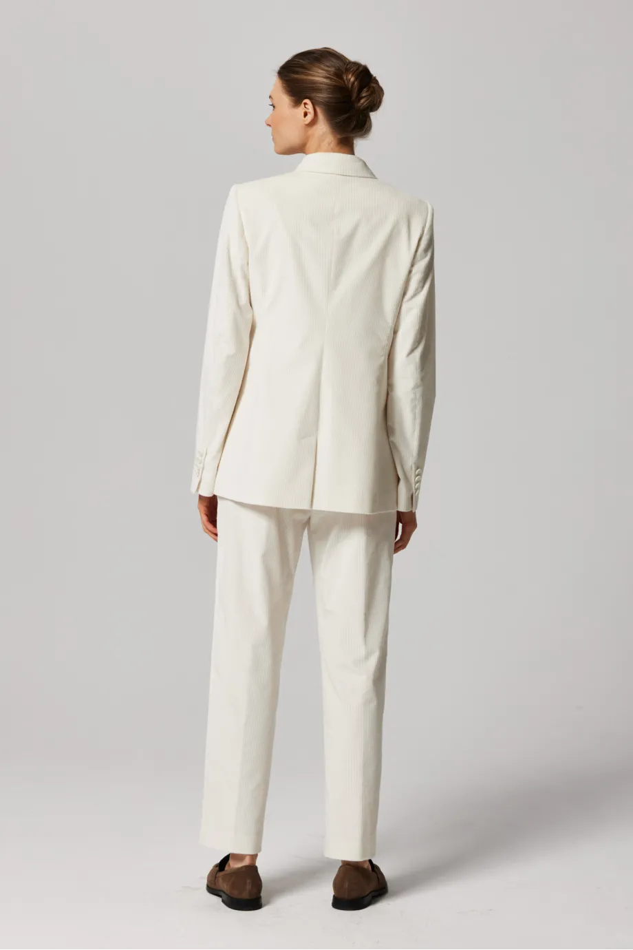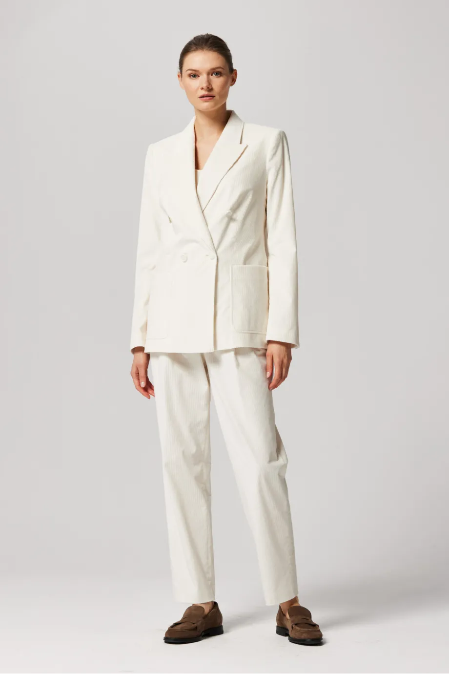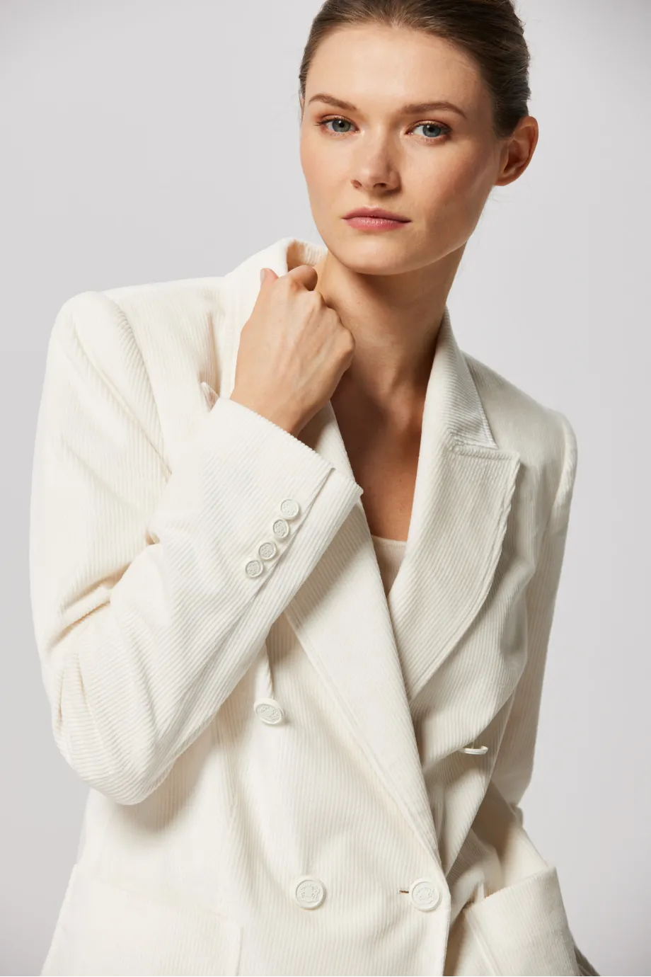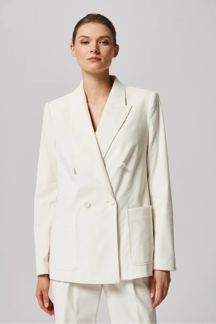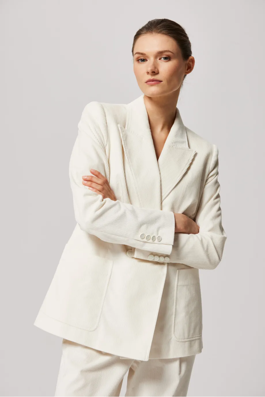 Tkanina welwet, lepiej znana jako sztruks, kojarzy się przede wszystkim z trwałością. Biały żakiet dwurzędowy z naszej kolekcji jest jednak nie tylko wytrzymały, ale przede wszystkim genialnie skrojony i uszyty z mistrzowską precyzją. Nadaj outfitom w stylu business casual i smart casual odrobinę wyrazistości w rozświetlającej odsłonie. Koniecznie poznaj bliżej prosty żakiet dwurzędowy Patrizia Aryton o najmodniejszej w tym sezonie śmietankowej barwie!