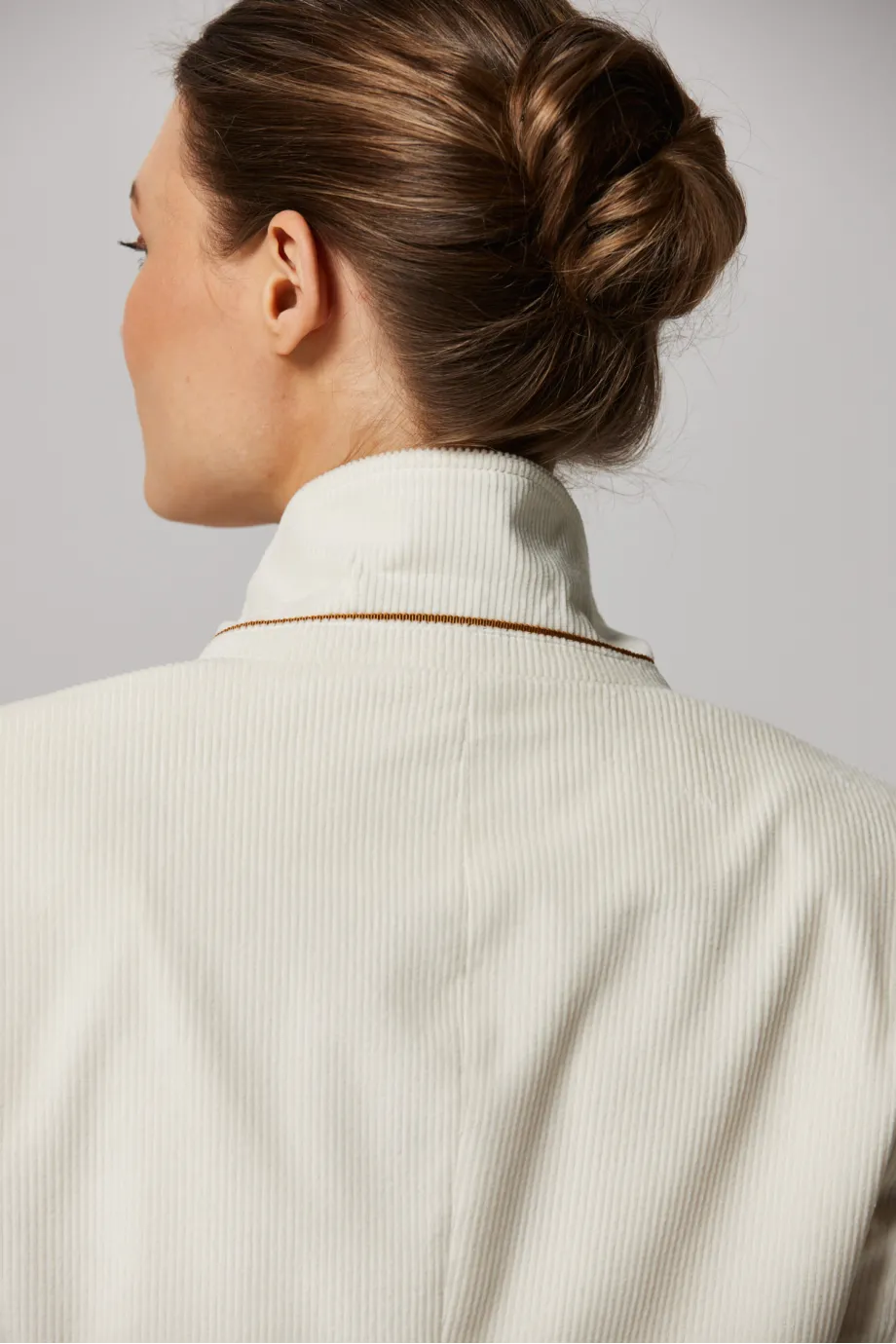 Ten żakiet sztruksowy damski mimo swojej prostej formy jest mistrzem w rysowaniu korzystnych proporcji sylwetki. Wszystko za sprawą pionowych trójwymiarowych prążków, a także dużych otwartych kieszeni w strefie bioder, podkreślenia ramion przez odpowiedni sposób wszycia rękawów, kołnierza w szpic oraz rzędów guzików rozszerzających się ku górze. Wnętrze marynarki ozdobiono pipingiem. Model posiada zapięcie na guzik z emblematem. Od środka wszyto dodatkowy guzik dla lepszego pozycjonowania ubrania na ciele.