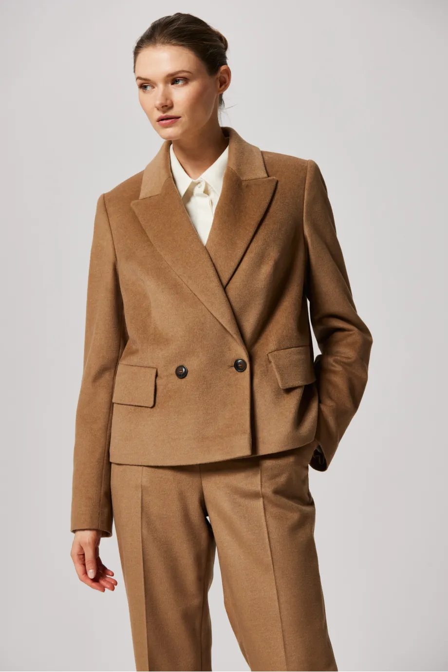 Krótka kurtka wełniana damska camel świetnie odnajduje się w towarzystwie spodni z tej samej tkaniny w identycznym kolorze, tworząc wysmakowany komplet. Równie dobrze gra solo w zestawach z jeansem, ciemną zielenią, czerwienią czy modną czekoladą. Kapitalnie sprawdzi się też jako składnik tonalnych looków z wszelkimi beżami.