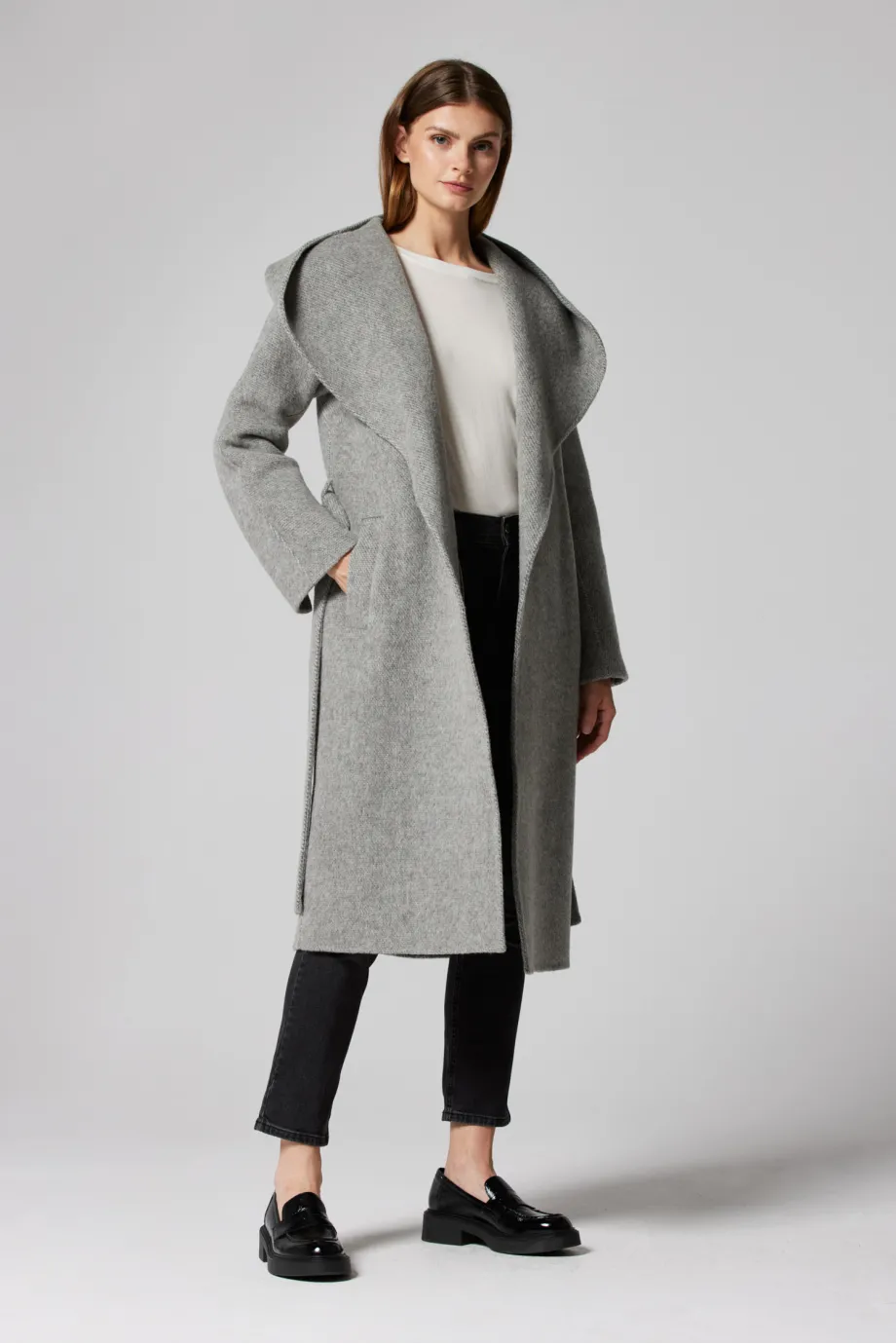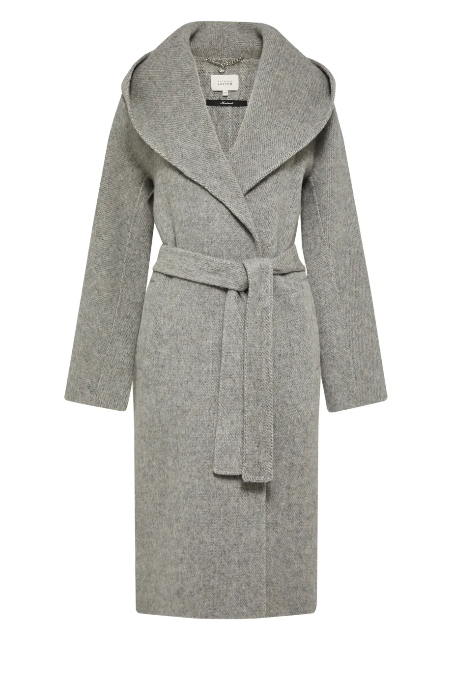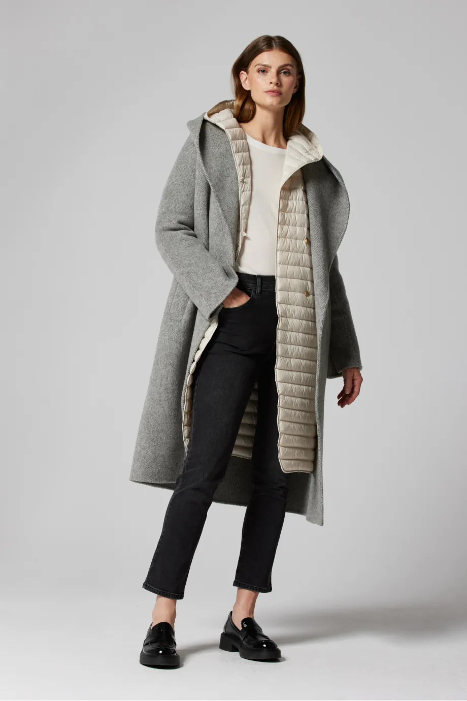 Płaszcz wełniany z kapturem damski, doubleface, kupisz w czterech podwójnych rozmiarach, od 32/34 do 44/46. Model powstał z doskonałej wełny owczej o niezrównanych właściwościach termoregulacyjnych, trwałej i plamoodpornej. Domieszka wełny z alpaki nadaje mu subtelny jedwabisty połysk i wyjątkową delikatność. Elegancki szary płaszcz damski Patrizia Aryton cechuje nadzwyczajna lekkość i miękkość.