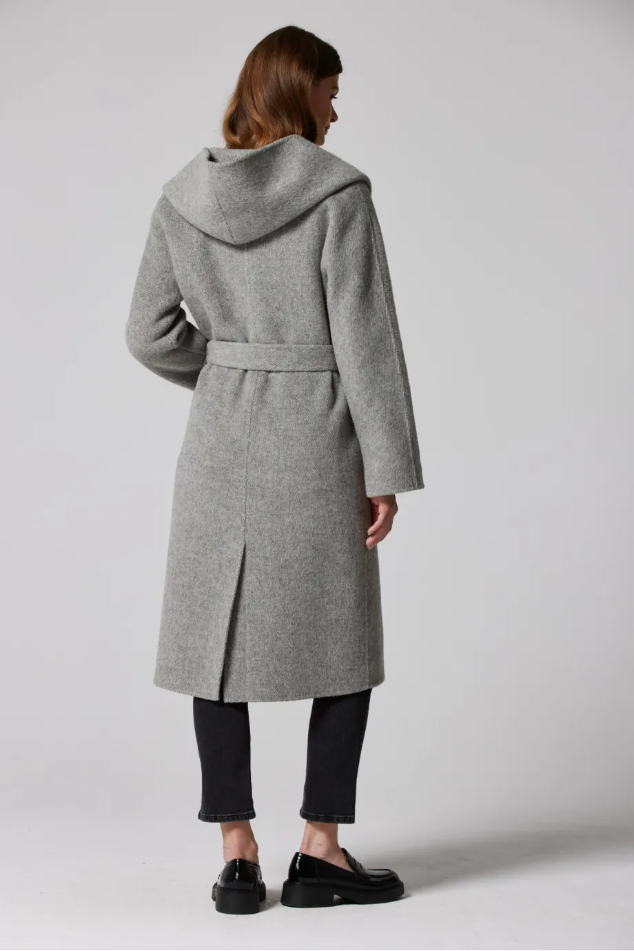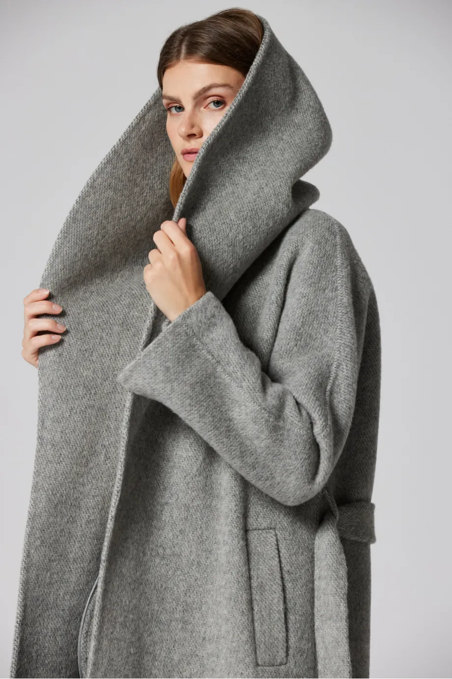 Długi szary płaszcz z paskiem, kieszeniami i kapturem