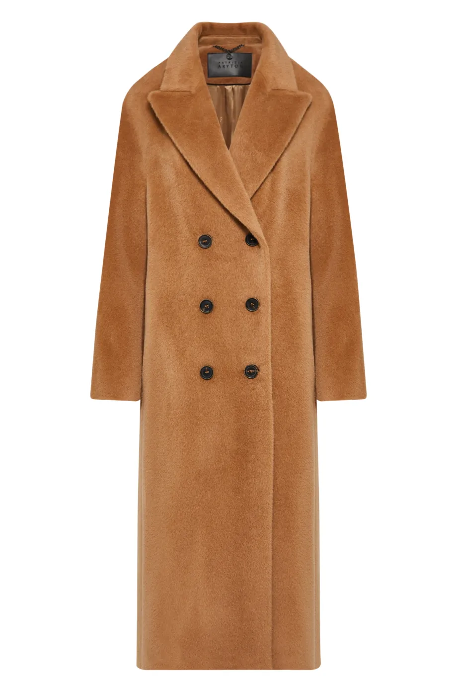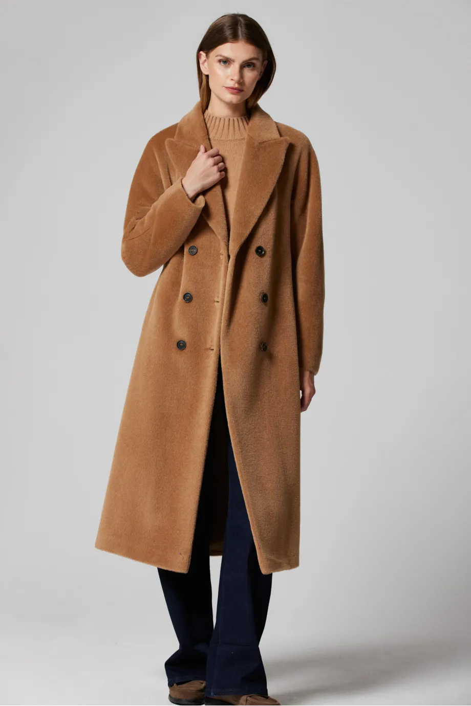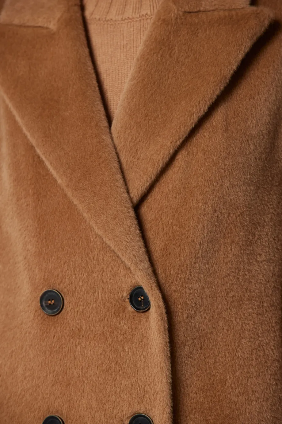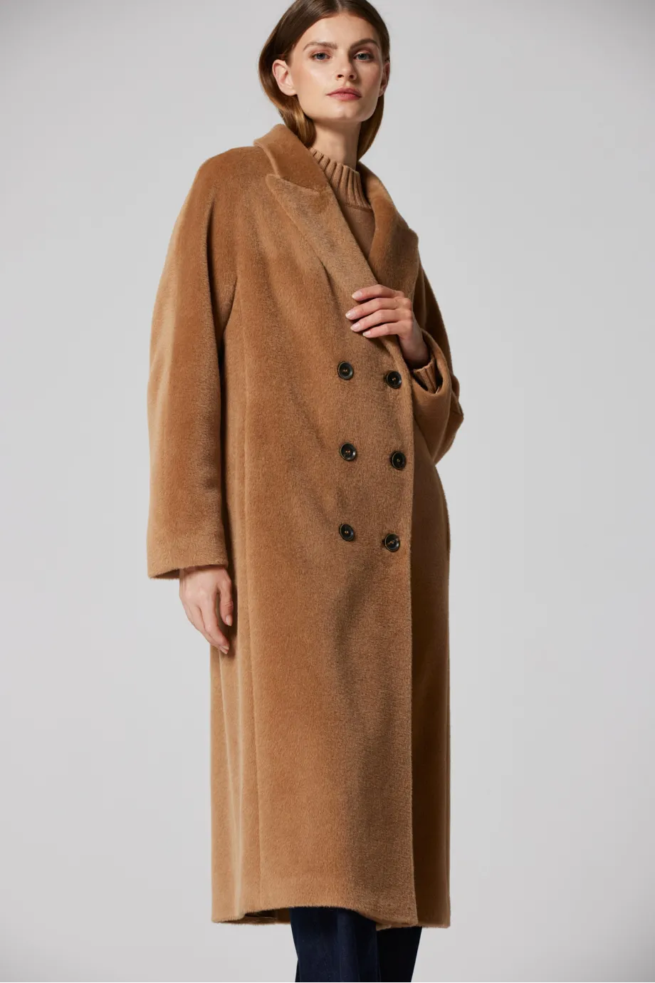 Camelowy płaszcz dwurzędowy z suri alpaką