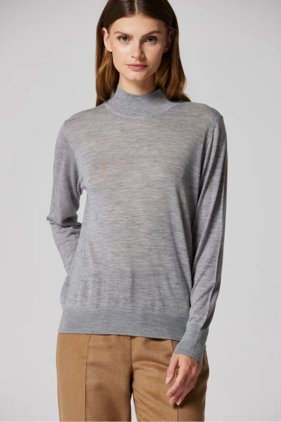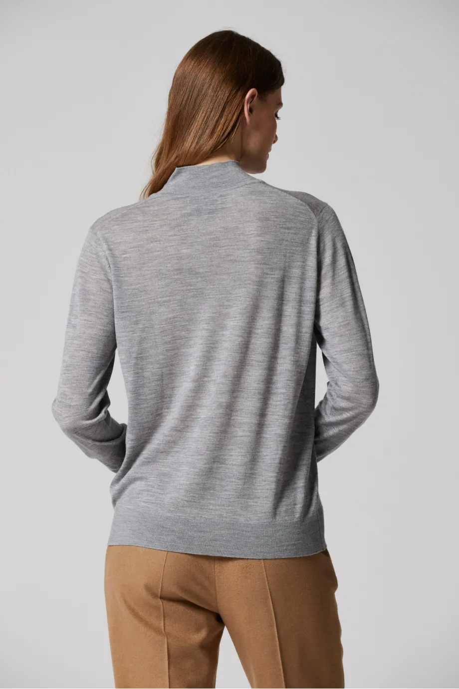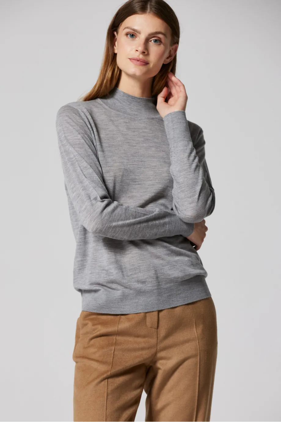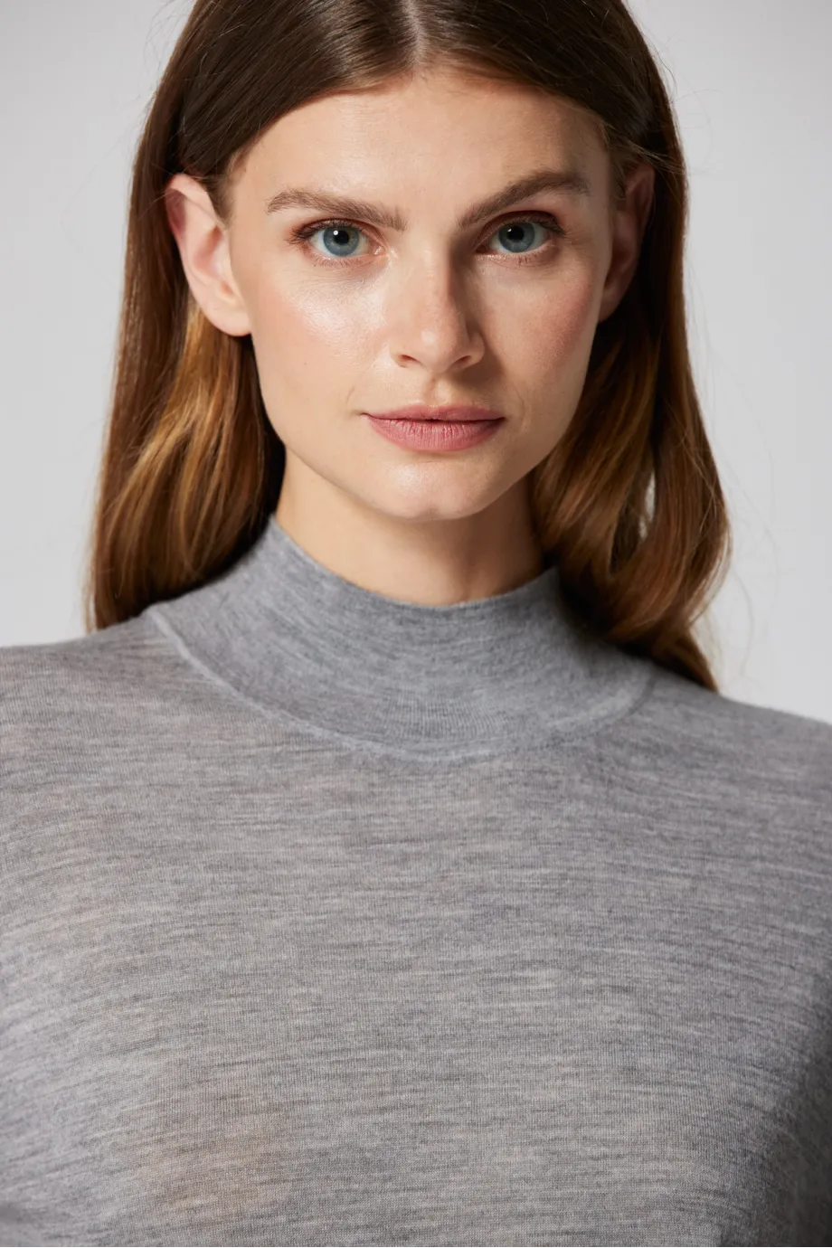 Szara bluzka z długim rękawem z wełny merino to kwintesencja klasy i komfortu, idealna dla kobiet, które cenią luksus w codziennej garderobie. Wykonana z niezwykle miękkiej i otulającej dzianiny, doskonale łączy funkcjonalność z wyrafinowanym stylem. Minimalistyczny półgolf dodaje jej szyku i sprawia, że jest idealnym wyborem zarówno na formalne spotkania, jak i mniej zobowiązujące okazje. To model, który harmonijnie wpisuje się w potrzeby współczesnych kobiet, stawiających na jakość i ponadczasowe kroje.