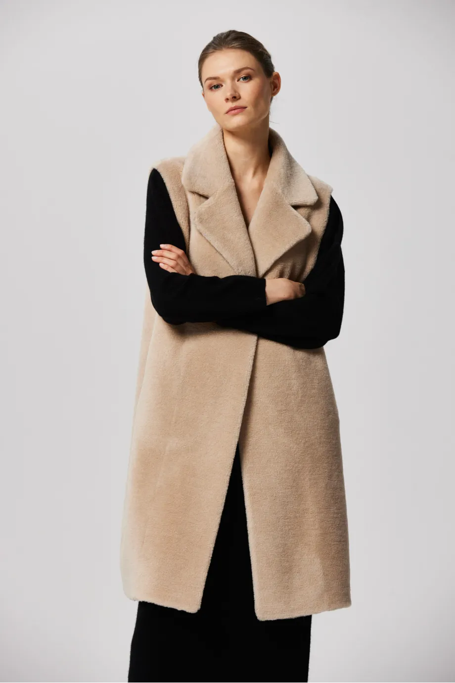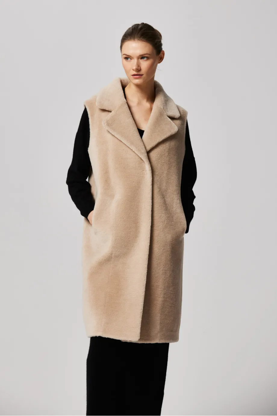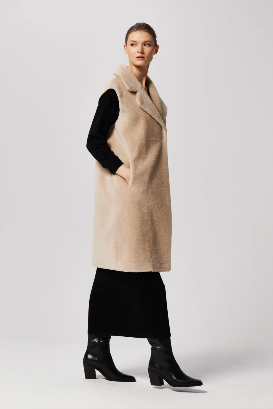 Charakterystyczne elementy tego modelu to elegancki kołnierz i kryte, wygodne zapięcie na napę. Jednak bezrękawnik świetnie wygląda także rozpięty. Wsuwane kieszenie to dyskretny i bardzo funkcjonalny detal. Tym, co nadaje wyrazistość prostej, minimalistycznej formie, jest jedyna w swoim rodzaju trójwymiarowa faktura materiału, czyli wełny teddy oraz szykowny kolor.