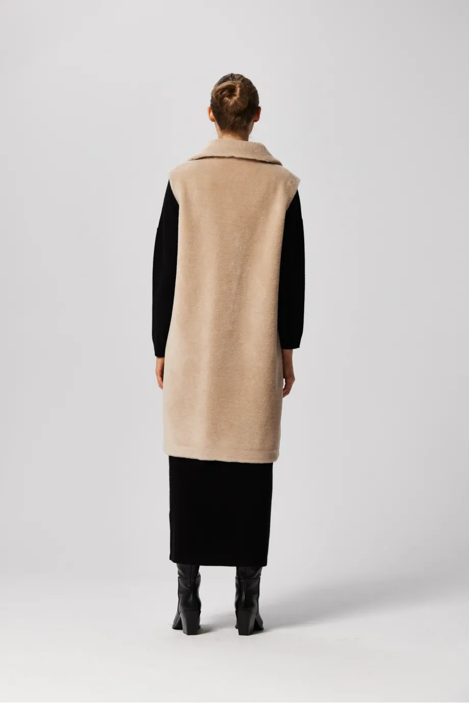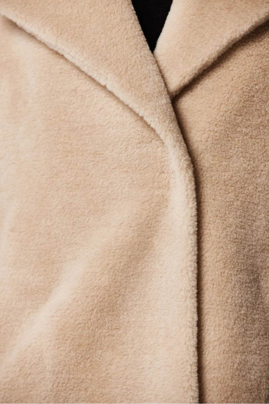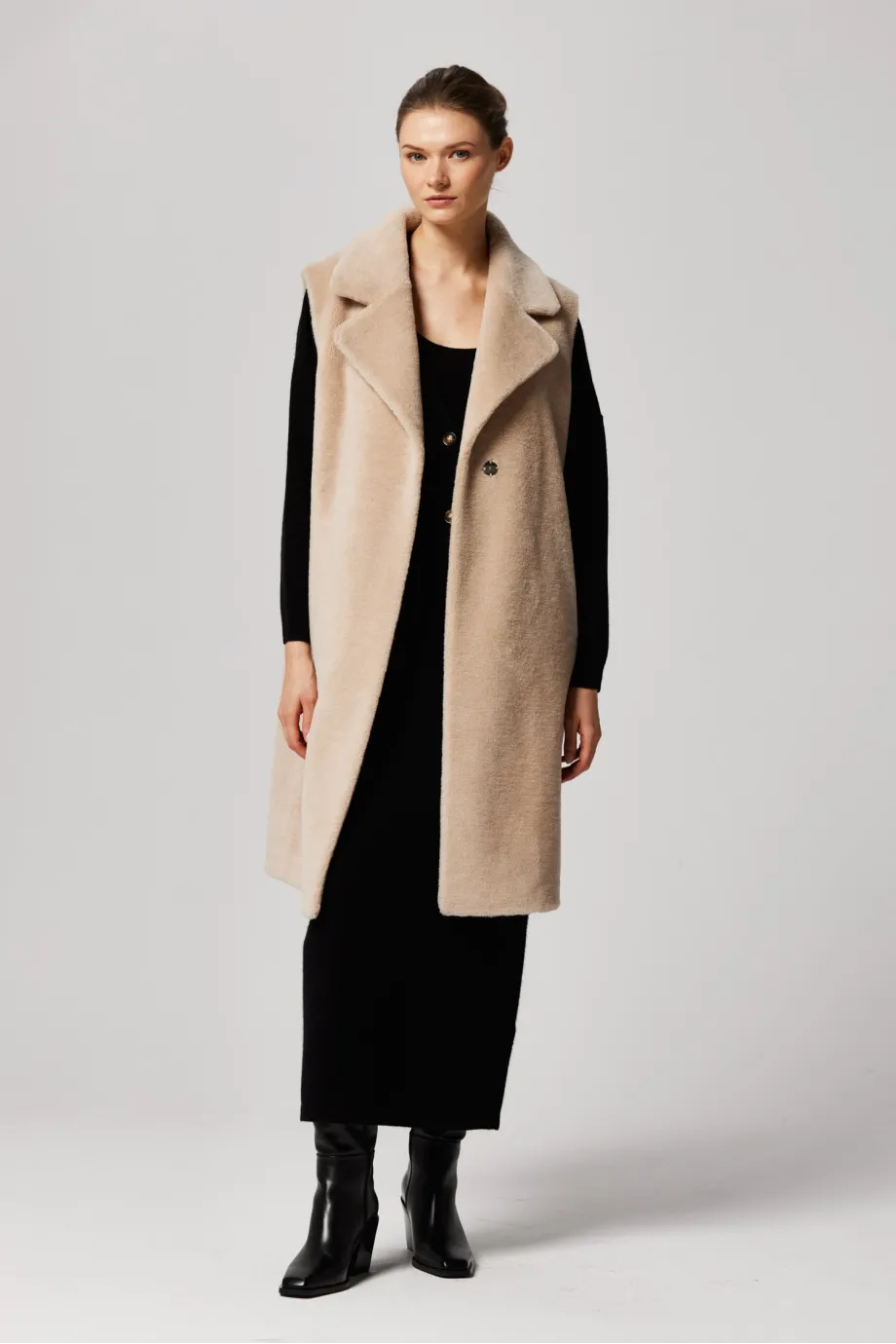 Charakterystyczne elementy tego modelu to elegancki kołnierz i kryte, wygodne zapięcie na napę. Jednak bezrękawnik świetnie wygląda także rozpięty. Wsuwane kieszenie to dyskretny i bardzo funkcjonalny detal. Tym, co nadaje wyrazistość prostej, minimalistycznej formie, jest jedyna w swoim rodzaju trójwymiarowa faktura materiału, czyli wełny teddy oraz szykowny kolor.