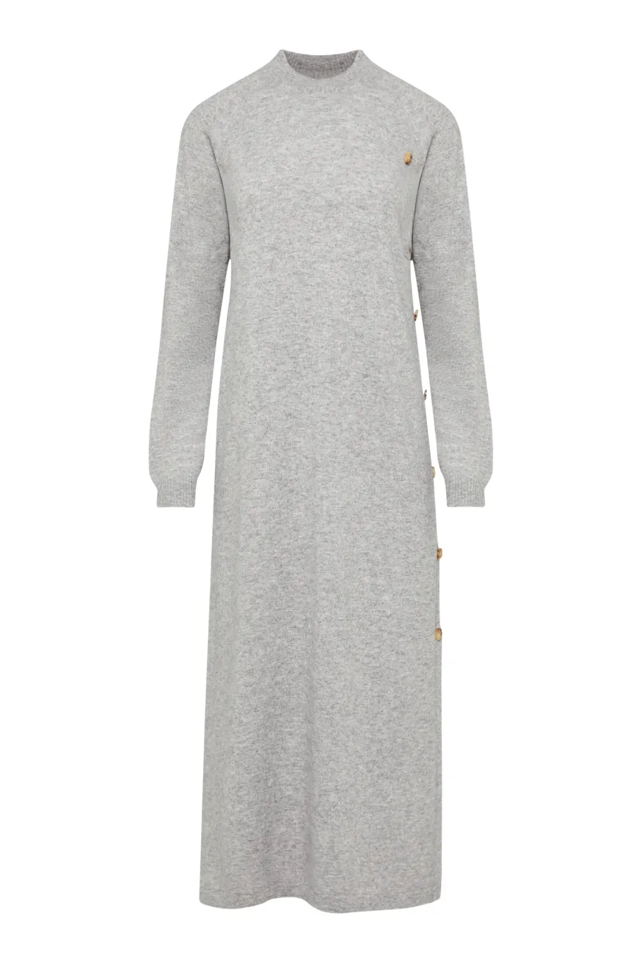 Ten element garderoby to sukienka półgolf z mięsistej, lekkiej dzianiny wykonanej splotem jersey knit na maszynie o uigleniu 12 GG. Prosta forma sprawia, że jest odpowiednia dla wszystkich sylwetek, a twarzowy, platynowo szary odcień podkreśla walory urody każdej pani, niezależnie od typu kolorystycznego. Popielata sukienka midi z długim rękawem będzie pasować do okryć, żakietów, butów i akcesoriów o każdej barwie basic, a także czerwieni, zieleni, taupe i czekolady.