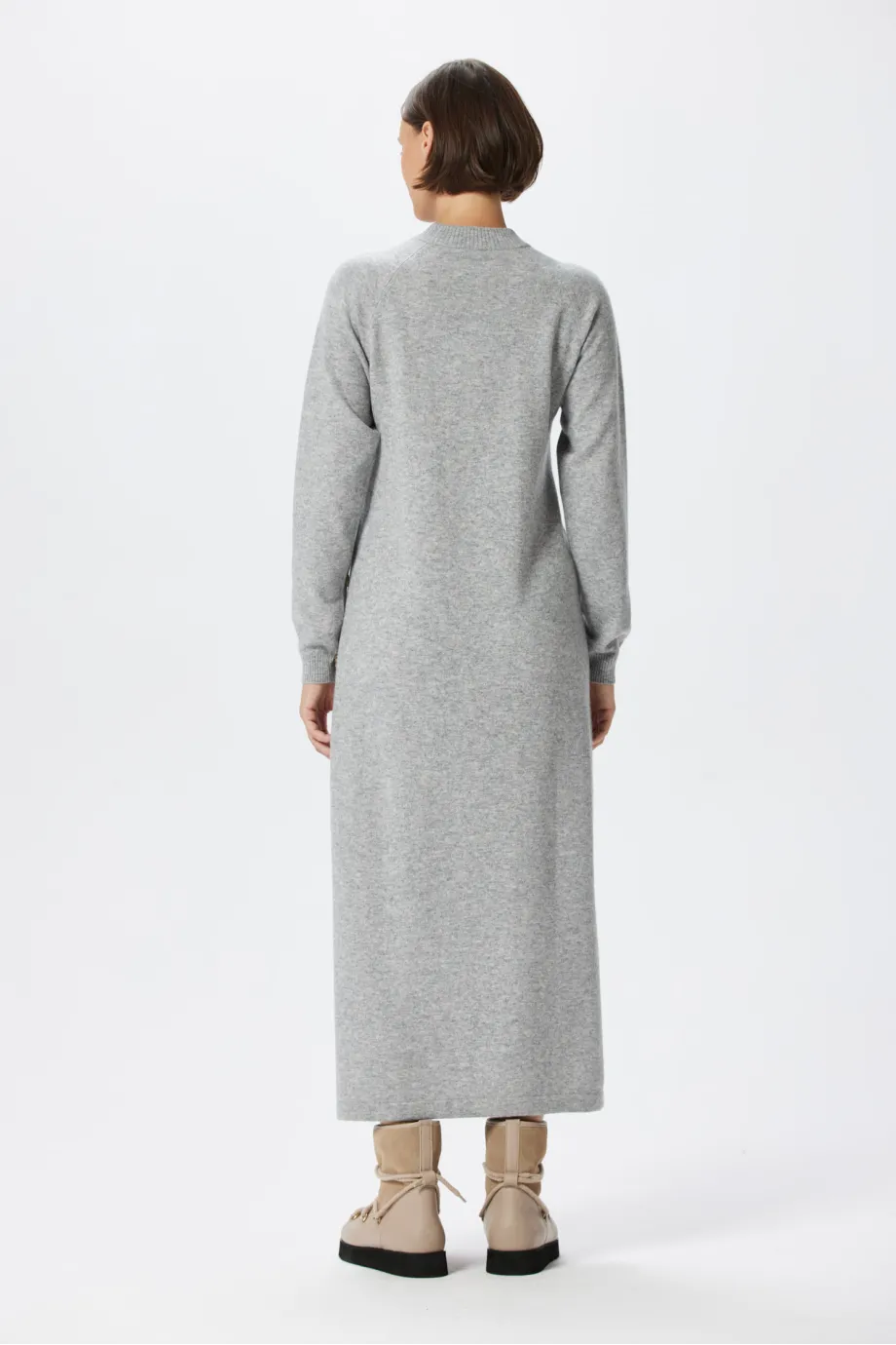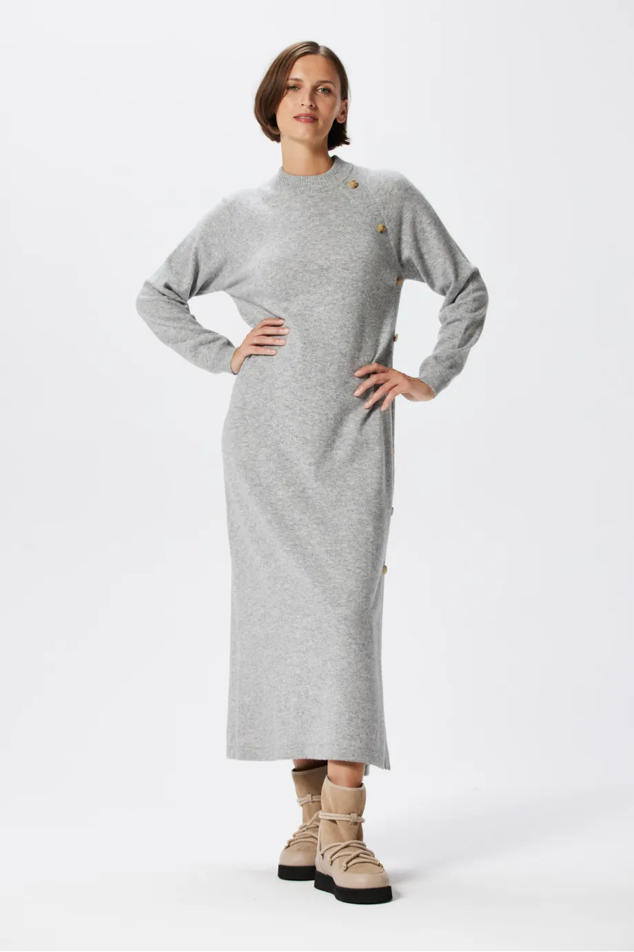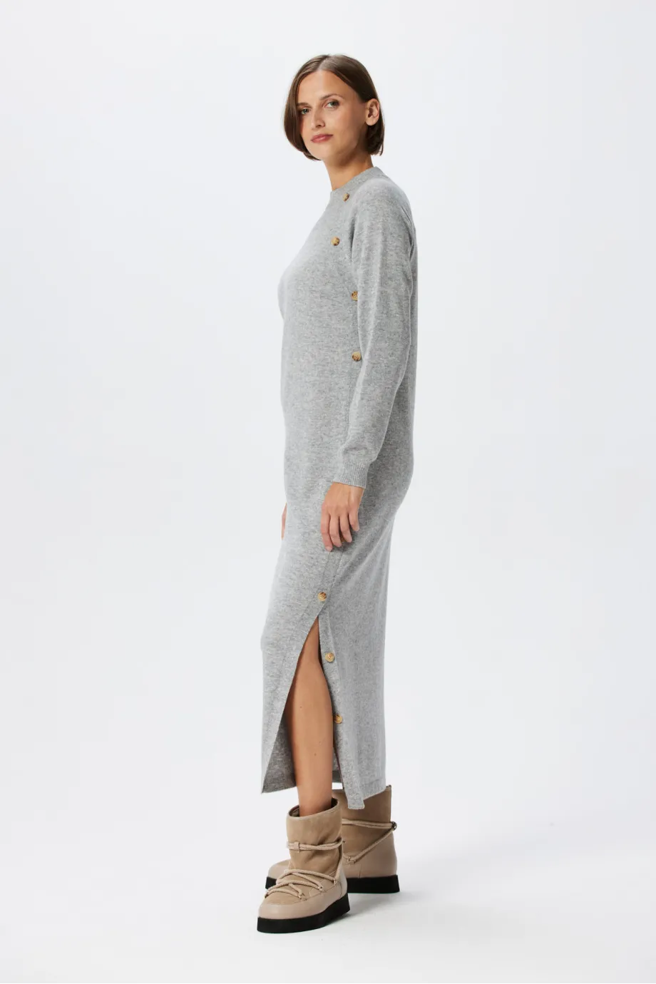 Minimalizm fasonu przełamuje boczne rozcięcie do wysokości kolana, wykończone rzędem dekoracyjnych guzików, poprowadzonych aż do dekoltu. Taka pionowa linia sprzyja optycznemu wydłużeniu figury i nadaje ciekawy, nietuzinkowy efekt. Dzięki długości midi ta sukienka z kaszmirem dobrze chroni nogi przed zimnem i fantastycznie prezentuje się zarówno w kontekście wysokich kozaków, średnich botków czy puchatych śniegowców, jak i wszelkich półbutów, tenisówek lub balerin, które zakładasz po przyjściu do biura.