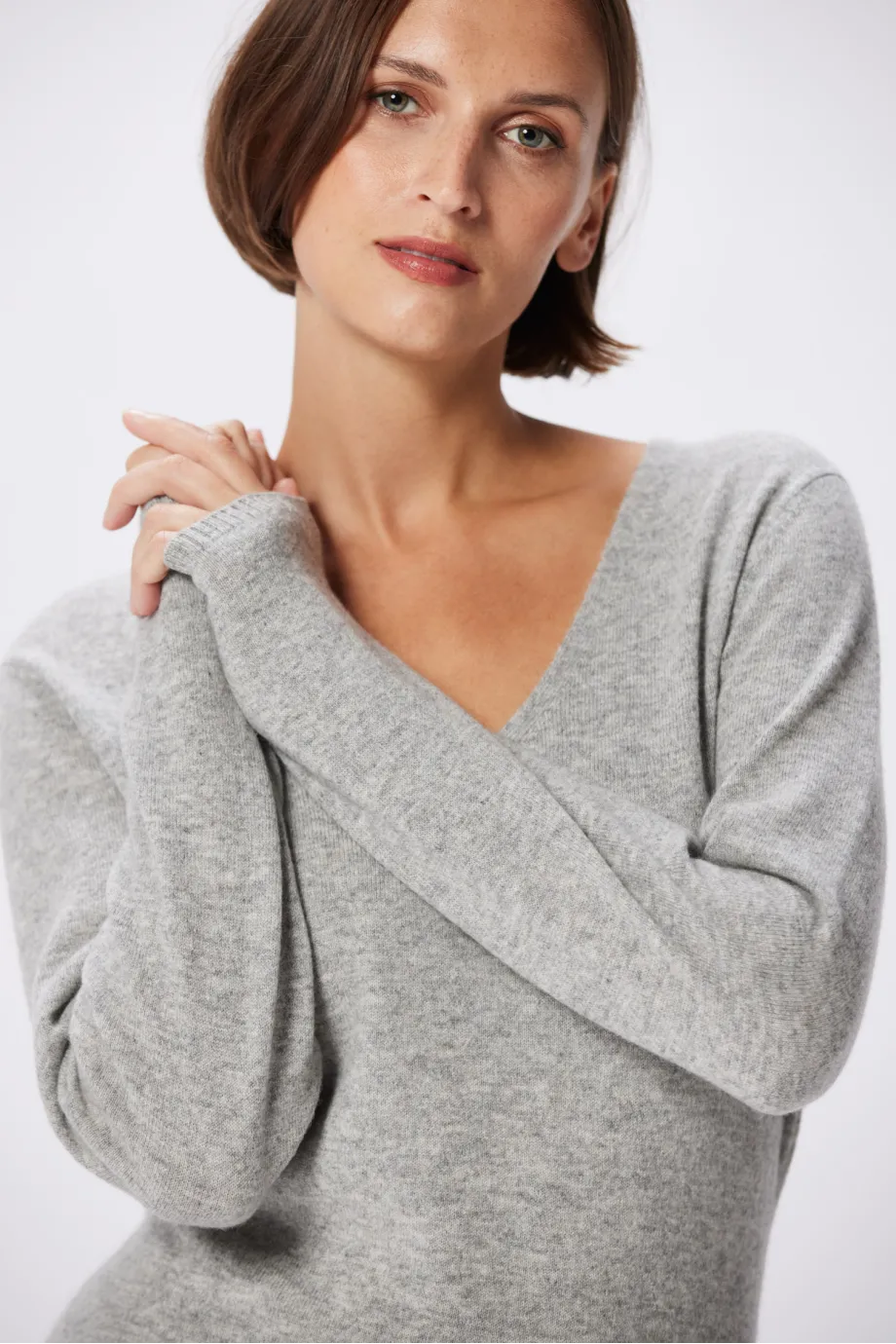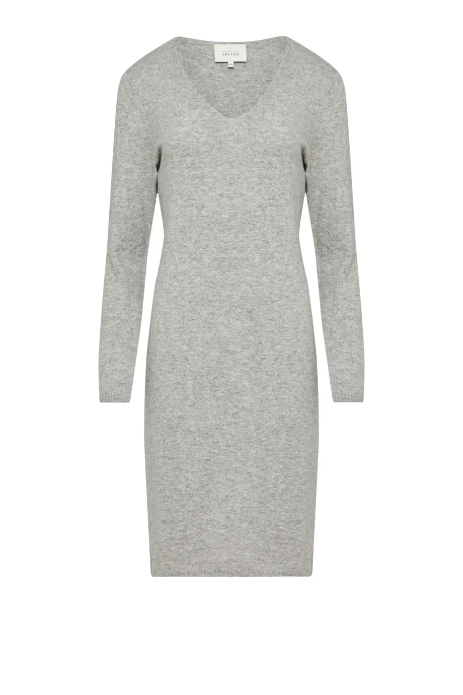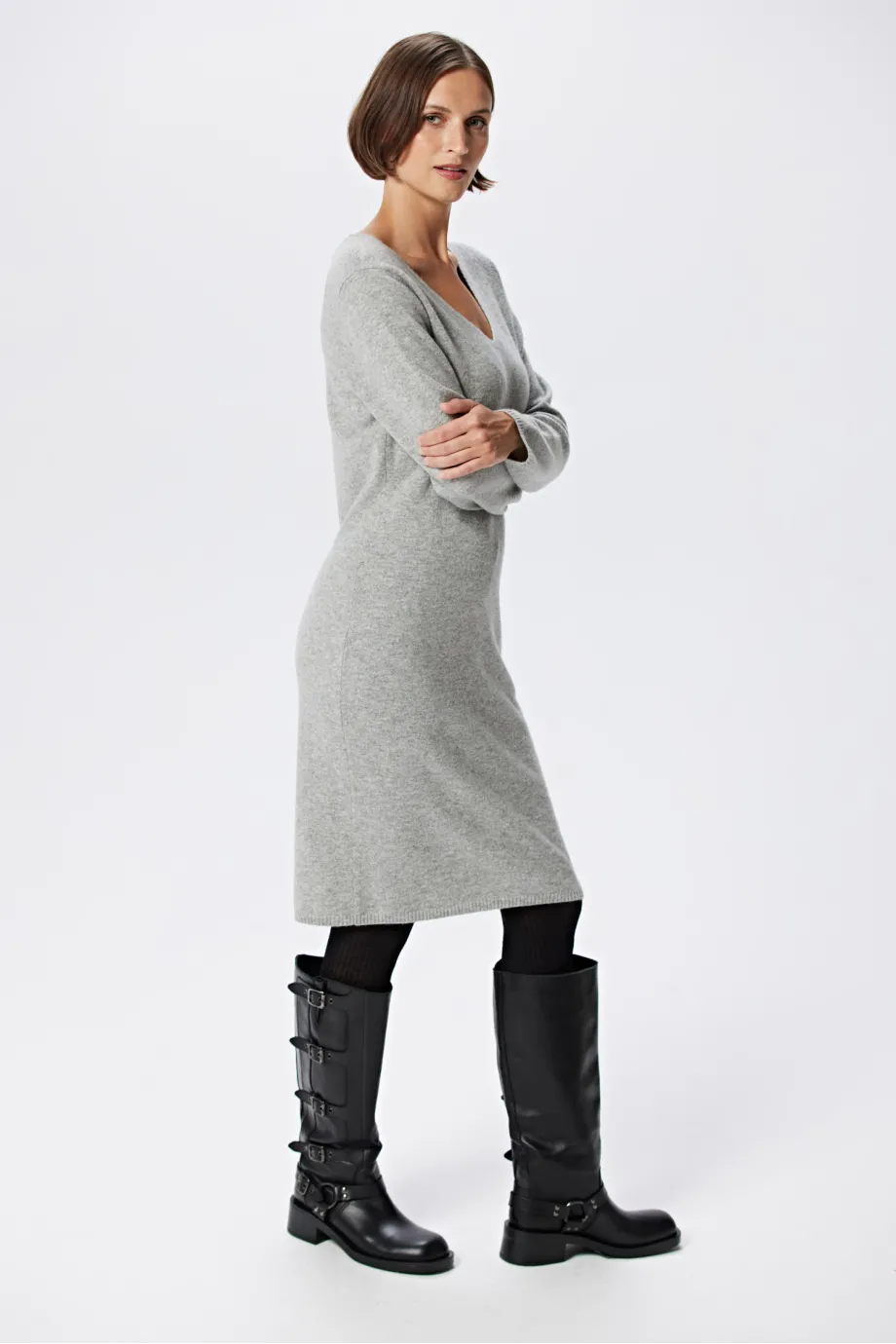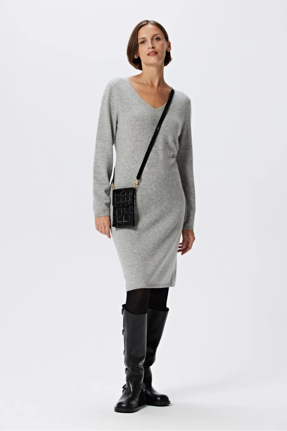 Dopasowana sukienka z długim rękawem została uszyta w 100% z kaszmiru. Dzianina powstała na maszynie o uigleniu 12 GG, dzięki czemu jest miękka i zarazem lekka. Splot jersey knit w dużym przybliżeniu ukazuje cienkie pionowe prążki, a takie ukształtowanie struktury nadaje materiałowi doskonałą rozciągliwość. Dlatego nasza sukienka z dekoltem V, który optycznie wysmukla figurę, dobrze dopasowuje się do ciała, ale go nie opina.