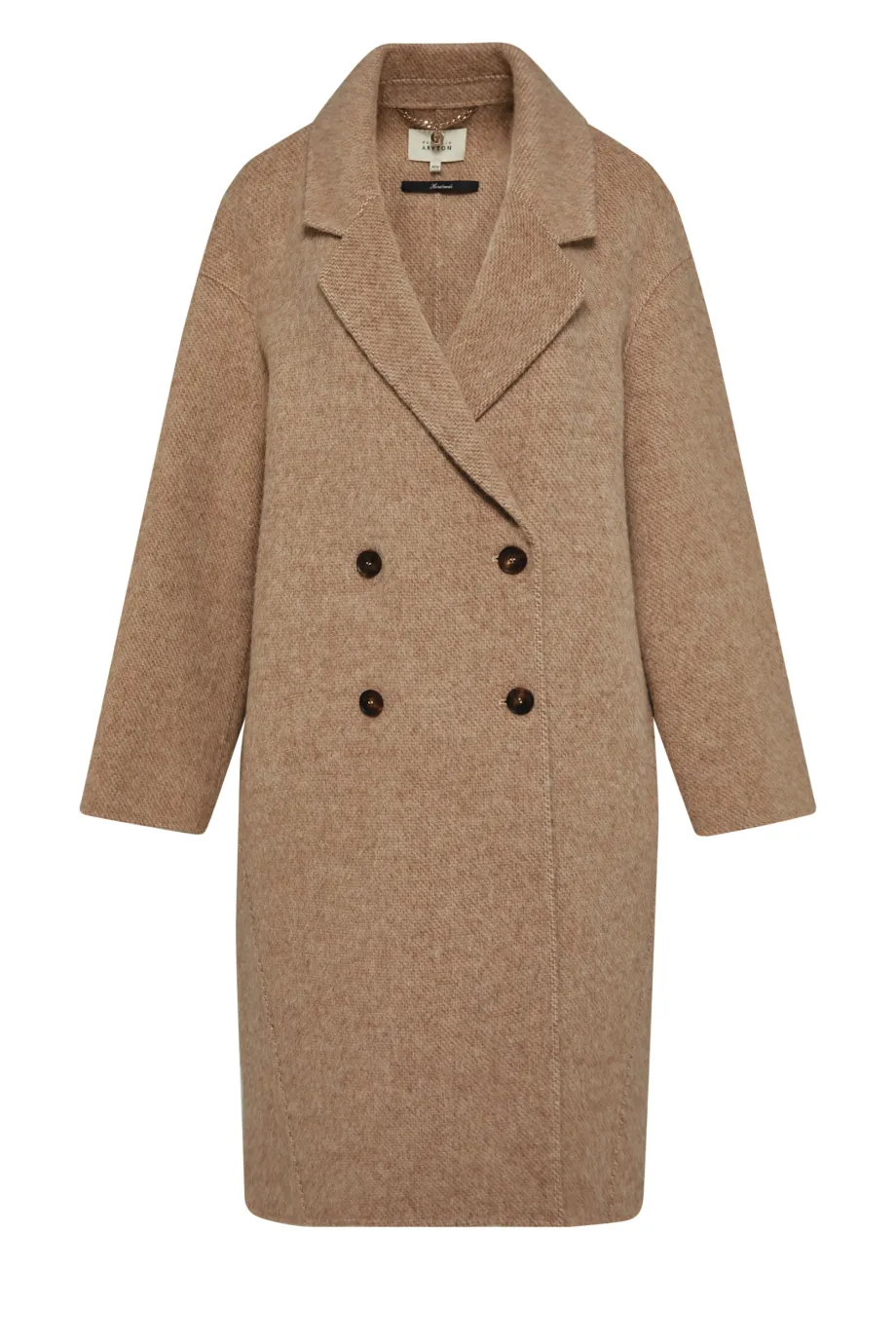 Bardzo długie rękawy, idealnie do wywijania i podwijania, luźny i regularny fason, głęboko wcięty kołnierz i dwurzędowe zapięcie na guziki z rogu bawolego to najbardziej charakterystyczne cechy tego modelu. Delikatnie opadające rękawy są nawiązaniem do aktualnych trendów, zgodnie z którymi odzież wierzchnia inspirowana modą męską ma wyglądać jak odrobinę za duża. Dyskretne, wsuwane kieszenie ukryte w bocznym szwie harmonizują z nowoczesną prostotą płaszcza.