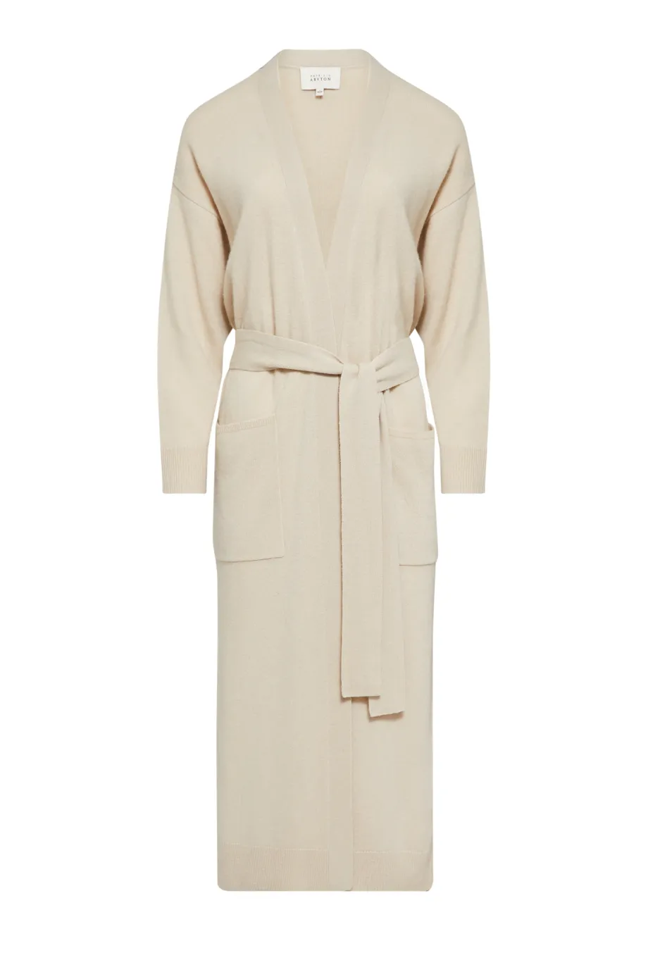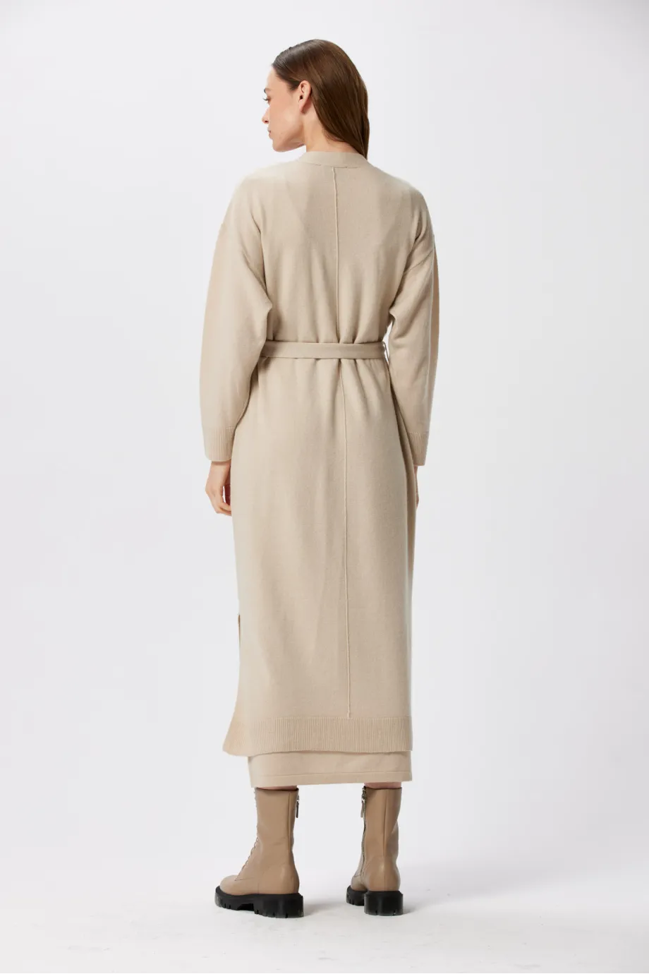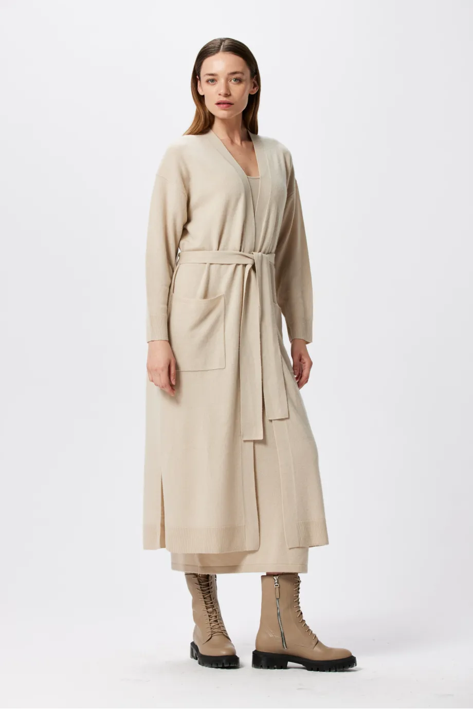 Dołączony pasek służy do przewiązywania w pasie i akcentowania wcięcia, ale ten długi kardigan z kieszeniami kapitalnie wygląda także z paskiem zebranym z tyłu lub puszczonym luźno wzdłuż ciała. Sweter sięga mniej-więcej do wysokości ⅓ łydki, czyli jest to dłuższy wariant kroju midi, który fantastycznie współgra z każdym rodzajem obuwia, w tym botkami, traperami i kozakami.