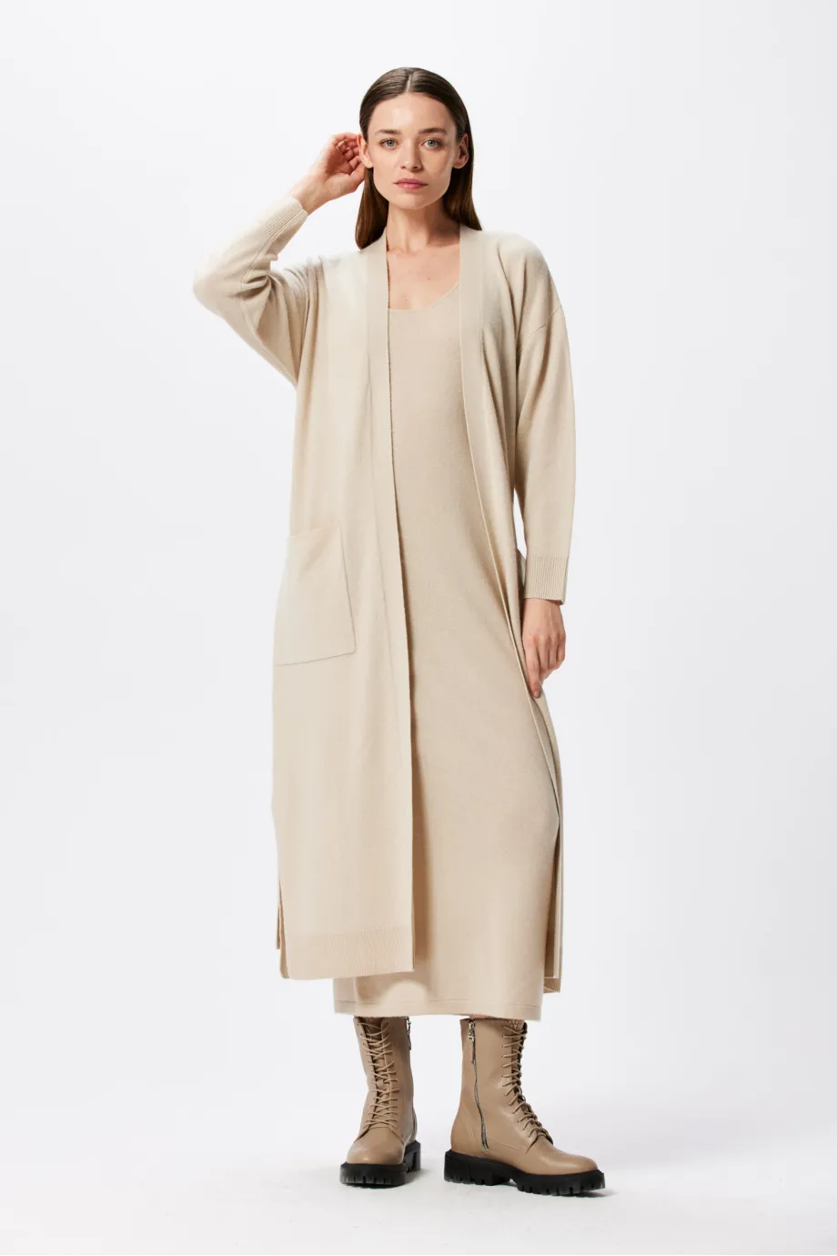 Długi beżowy kardigan z kieszeniami