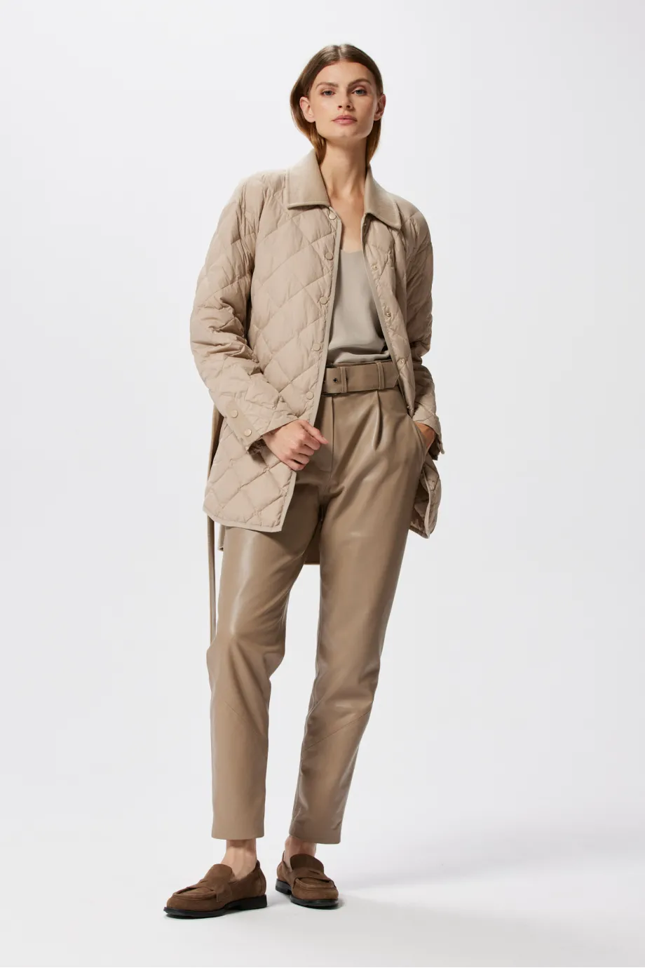 Ta kurtka puchowa beżowa ma powierzchnię przodu i rękawów w pikowany wzór - kwadraty obrócone o 45 stopni. Należy do kategorii okryć, które nie obciążają wizualnie sylwetki i są lekkie także w sensie dosłownym. Mimo tego, że jest cienka, kurtka z kieszeniami Patrizia Aryton doskonale chroni przed zimnem i chłodem.