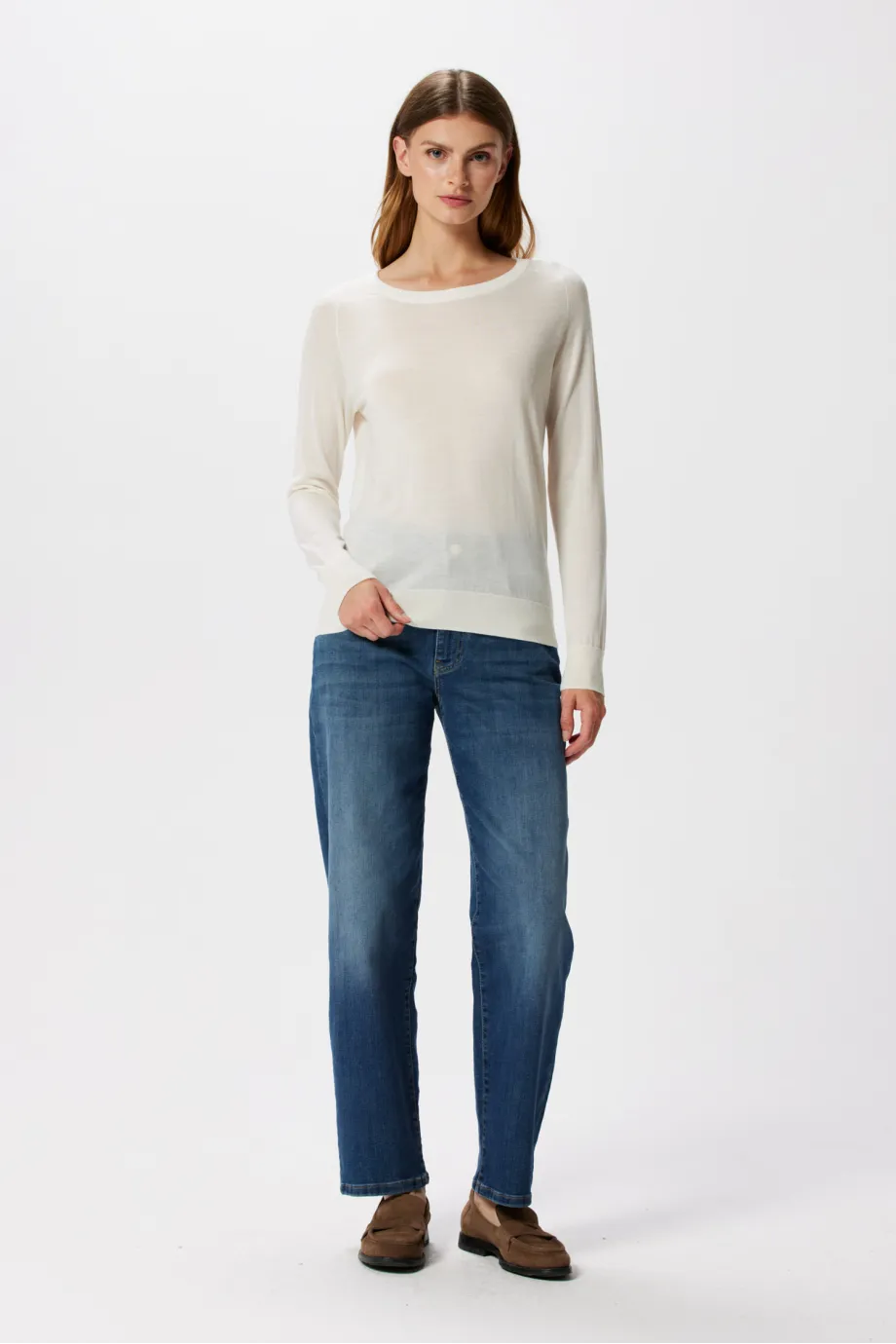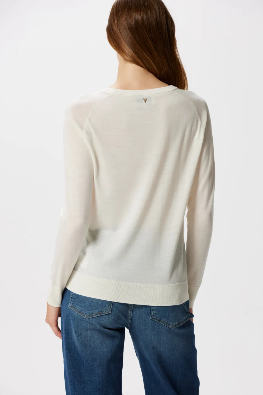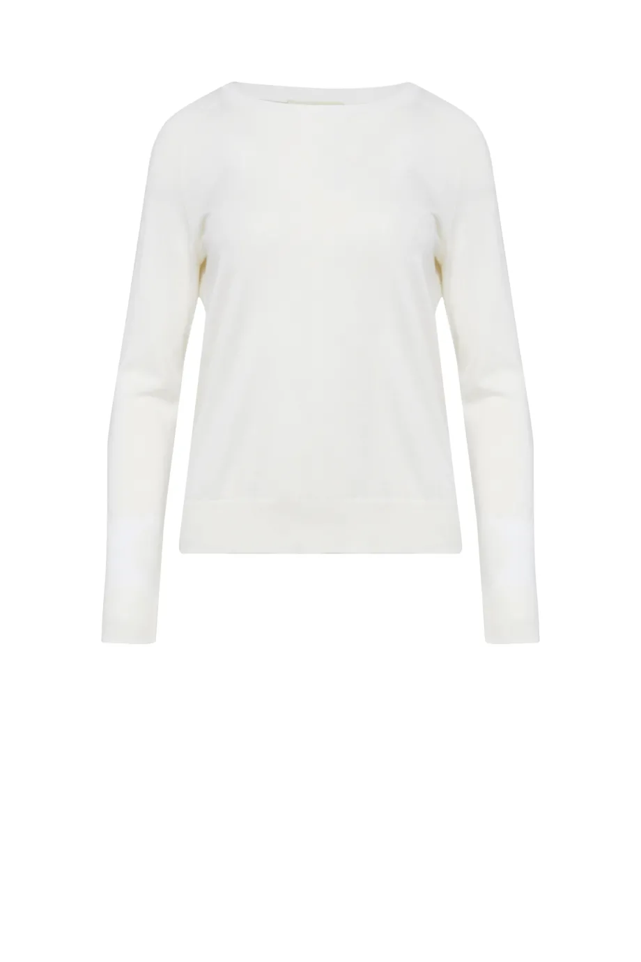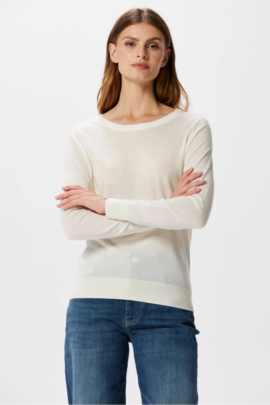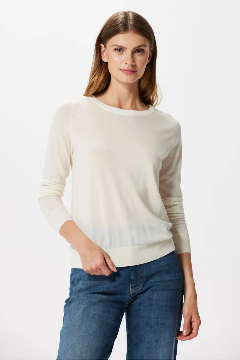 Bluzka z wełny merino Patrizia Aryton ma barwę złamanej bieli, doskonałą szczególnie dla pań, dla których czysta biel nie jest pierwszym odcieniem. Długie rękawy i okrągły dekolt to cechy, które czynią ją uniwersalną, do noszenia solo lub pod żakiet czy kardigan. Raglanowe rękawy subtelnie zmiękczają rysunek ramion.
