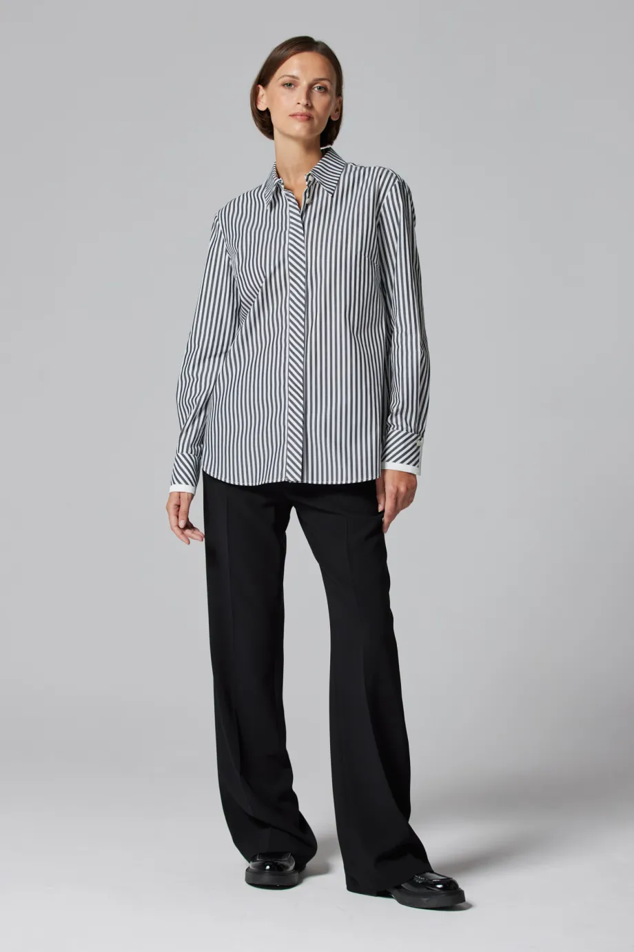 Pierwszym charakterystycznym elementem tego modelu jest ułożenie pasków. Na rękawach i w części tułowia są one pionowe, a na mankietach oraz listwie materiału, skrywającej guziki, ustawiono je po skosie. Taki asymetryczny detal, wbrew pozorom, pomaga rysować korzystne proporcje sylwetki i zarazem budzi skojarzenia z krawatem. Na karczku paski przebiegają w sposób horyzontalny, podkreślając ramiona. Kontrafałda i kołnierzyk to detale, które są obowiązkowe dla wszystkich tradycyjnych biznesowych koszul.