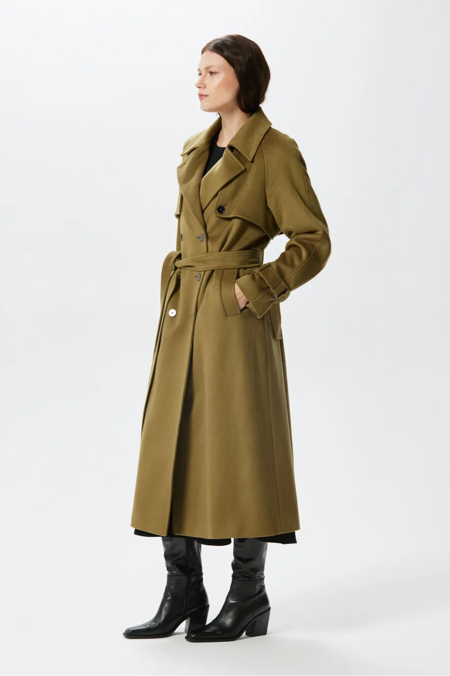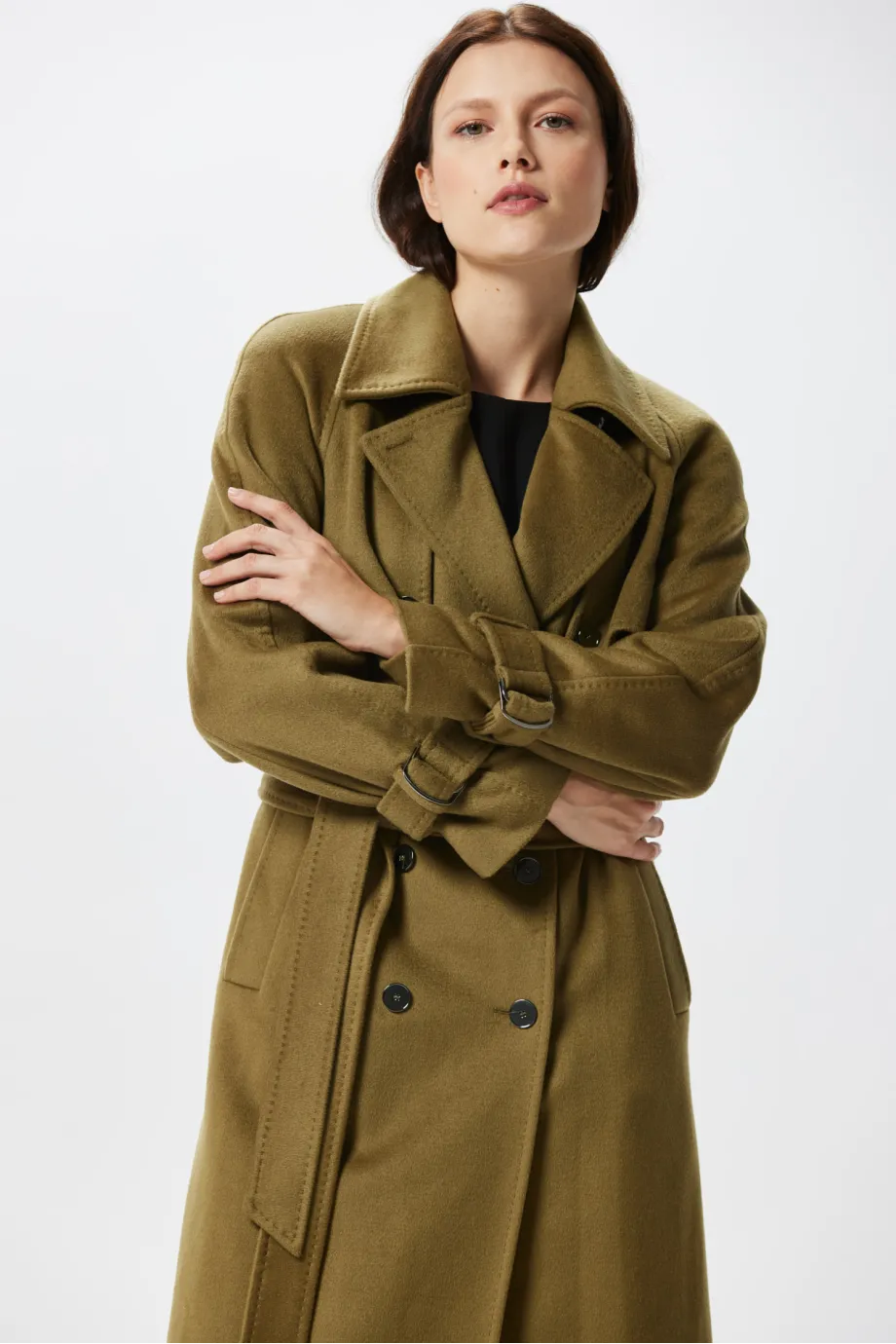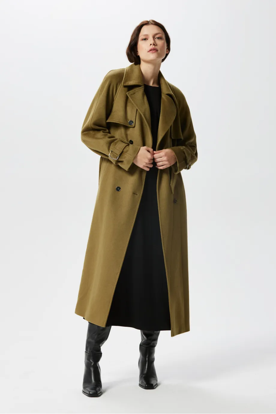 Zielony wełniany trencz z jedwabiem i kaszmirem