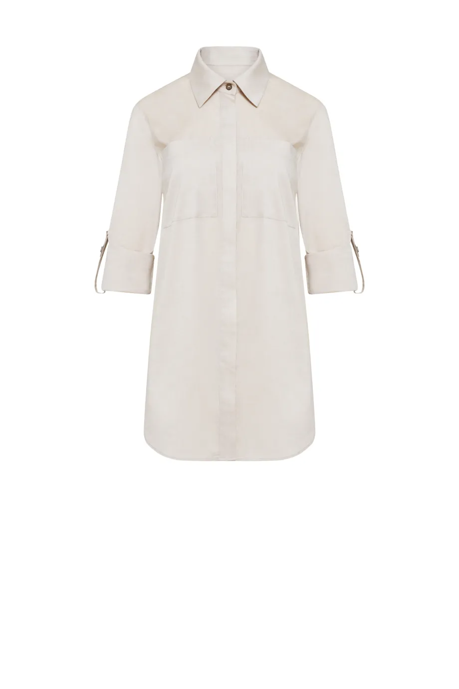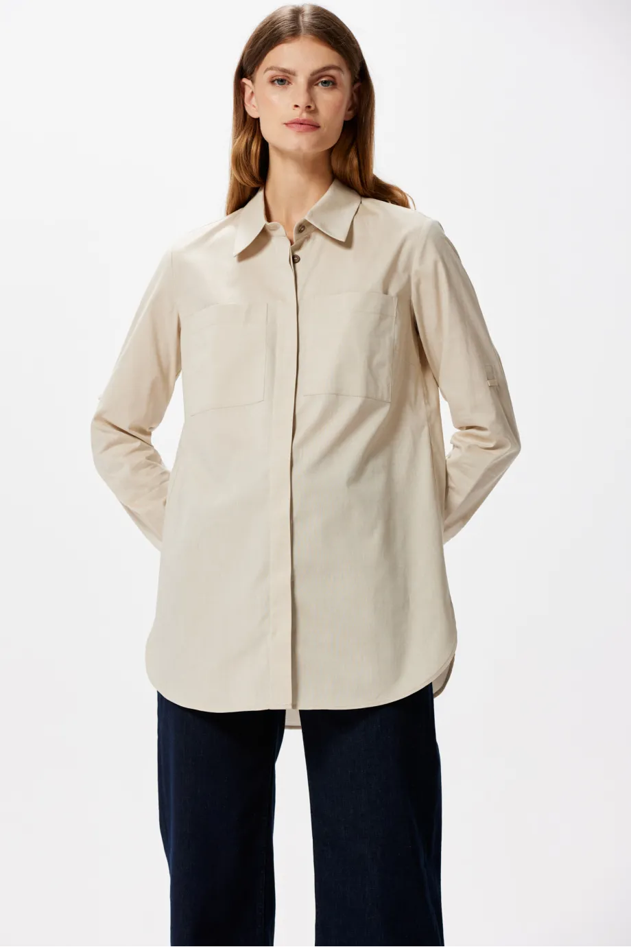 Ta koszula damska bawełniana, długa i prosta w kroju, ma zaokrąglony dół, dodający jej lekkości. Świetnie wygląda w kontekście ołówkowych spódnic oraz wszelkich spodni, pomagając wysmuklić optycznie figurę. Na plecach wszyto kontrafałdę, a na piersiach duże otwarte kieszenie. Przemyślany w każdym szczególe fason pracuje na korzyść rysowania atrakcyjnych proporcji sylwetki.