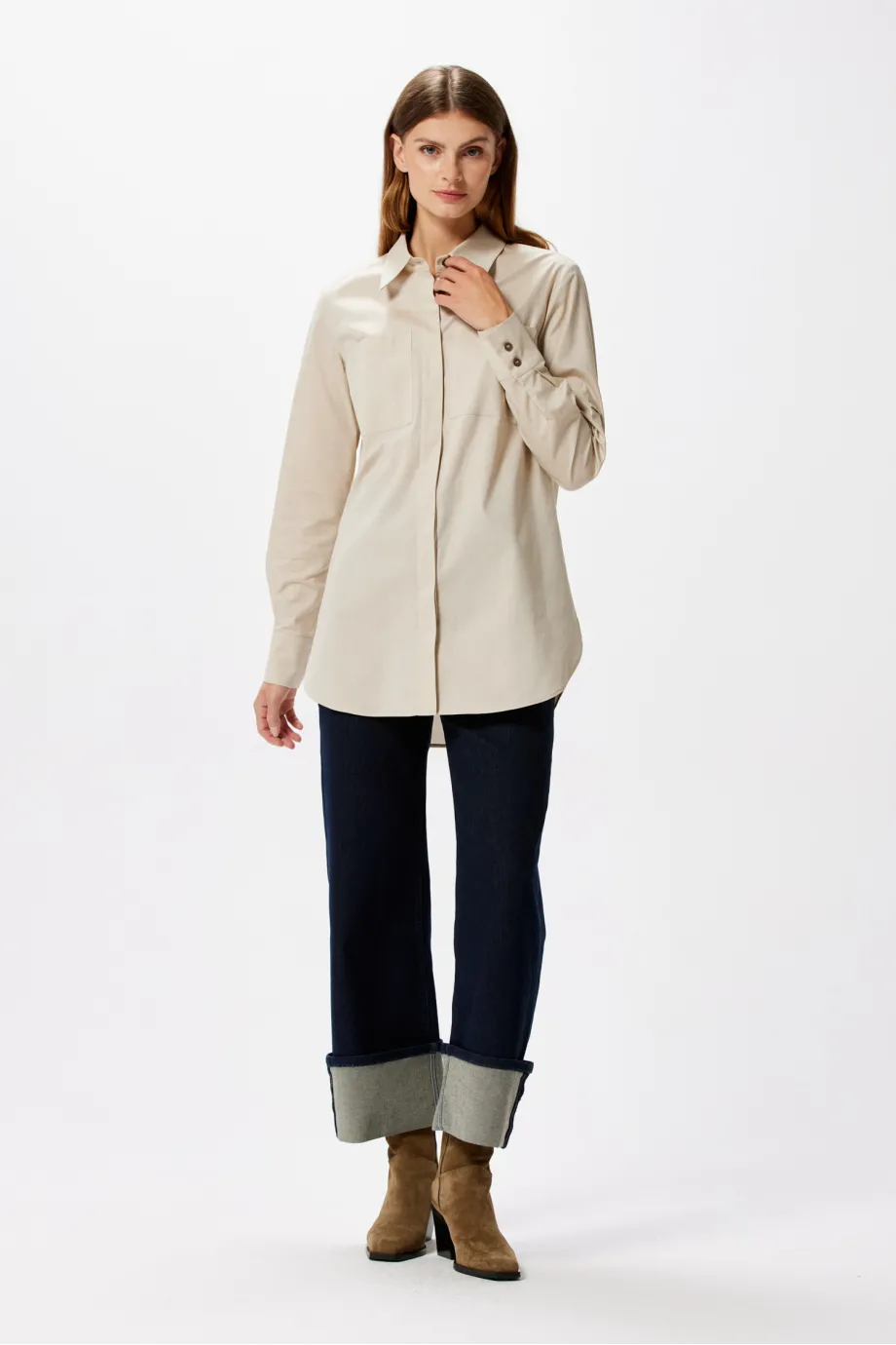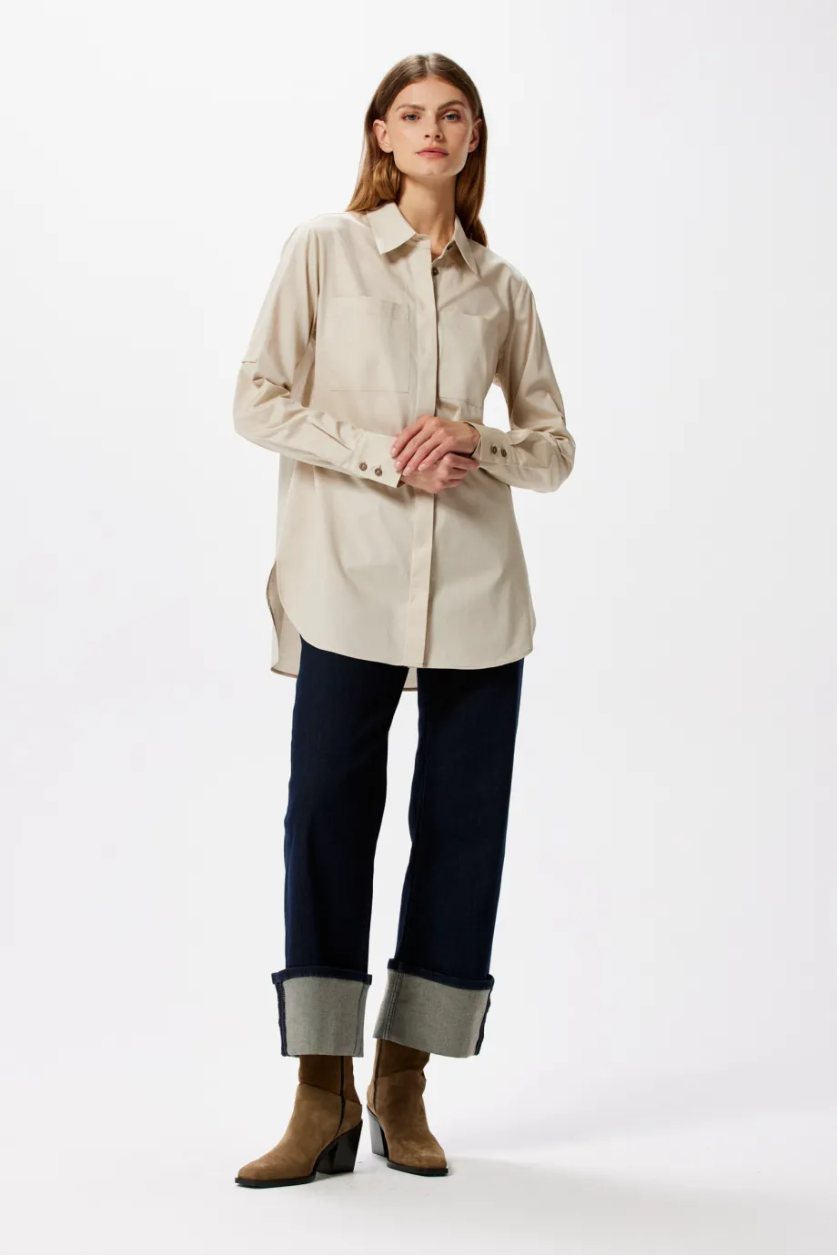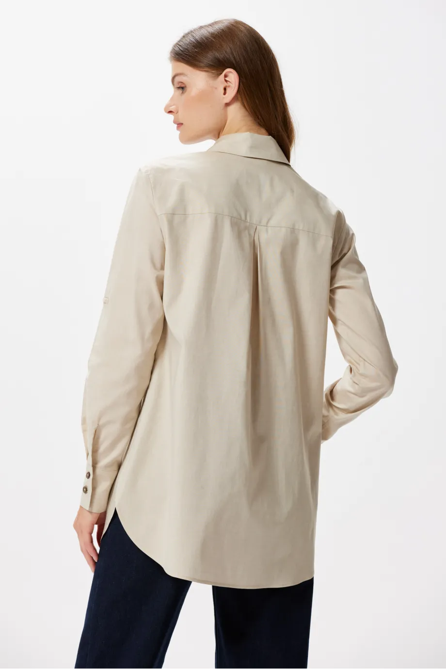 Beżowa luźna koszula z długim rękawem i kieszeniami