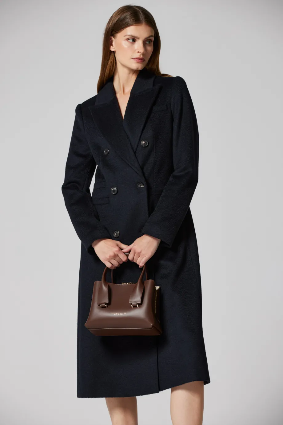 Długi granatowy płaszcz Patrizia Aryton powstał ze 100% wełny wielbłądziej (baby camel hair), która oprócz tradycyjnych właściwości charakterystycznych dla wełny odznacza się też jedyną w swoim rodzaju fakturą i subtelnym połyskiem. Do uszycia podszewki wykorzystano oddychające włókna wiskozy i acetatu. Ten płaszcz wełniany dwurzędowy kupisz w rozmiarach 34-46.