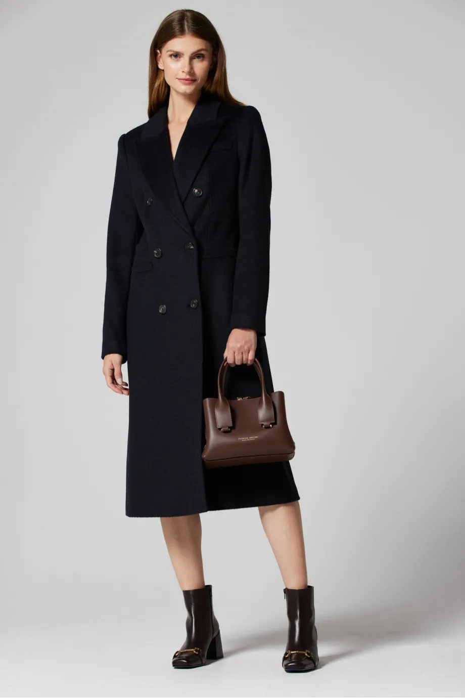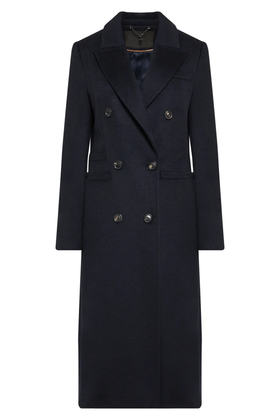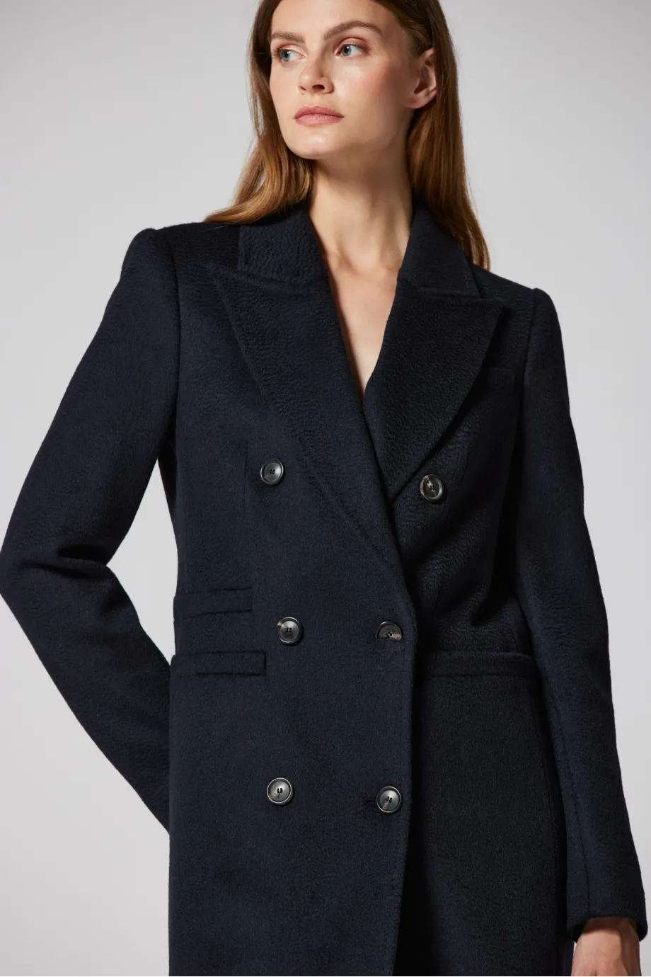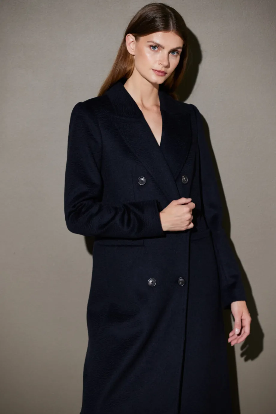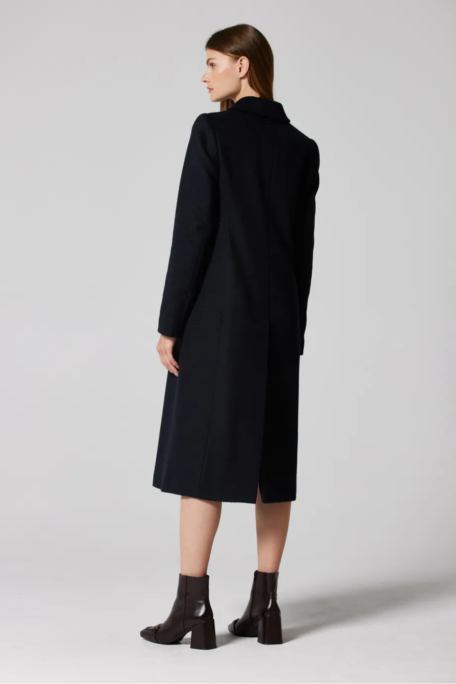Granatowy dwurzędowy płaszcz midi z rozcięciem, zapinany na guziki