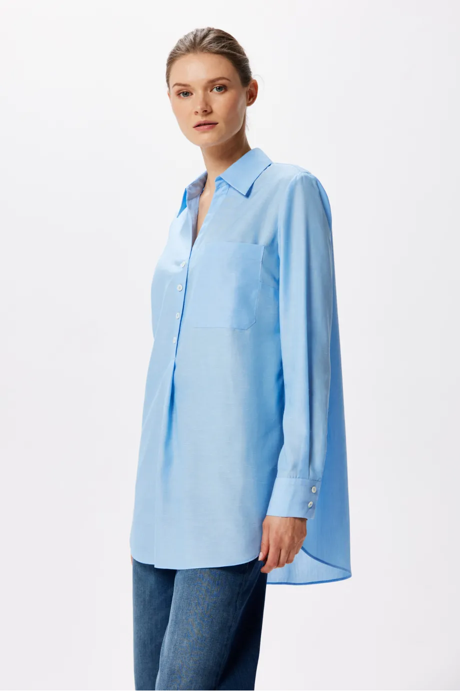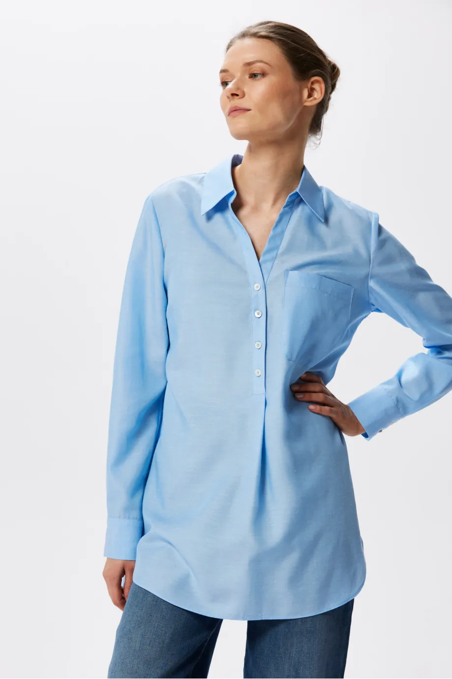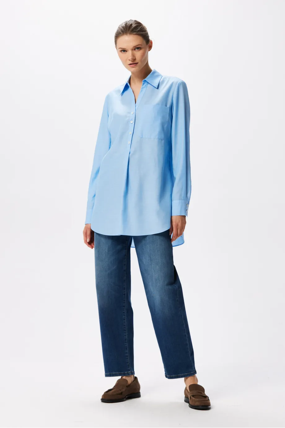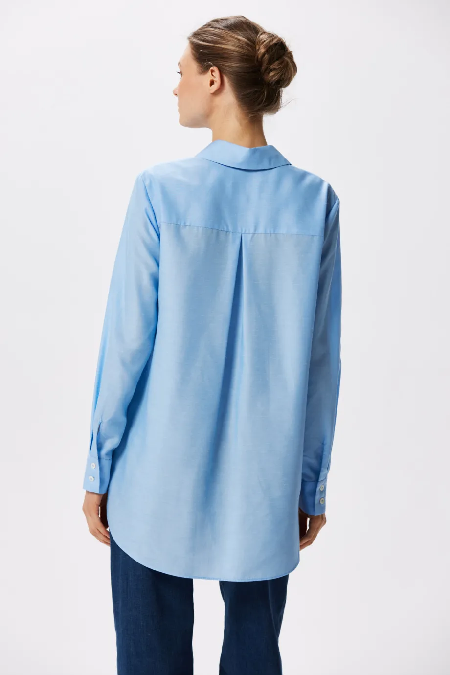 Ta luźna koszula ma lekko rozszerzaną formę, zaokrąglony dół i długość za pośladki. Możesz ją więc traktować nawet jako tunikę do dopasowanych spodni. Równie dobrze sprawdzi się w tradycyjnych stylizacjach, np. jako góra do cygaretek i pod żakiet lub warstwa pod wełnianą szmizjerkę bez rękawów. Ubranie wzbogacono także o otwartą kieszeń na piersi. Jego świeży błękitny odcień pasuje zarówno do każdego koloru podstawowego, jak i modnych w tym sezonie pudrowego różu, naturalnego denimu, kojącego taupe czy wszelkich tonów szarości.