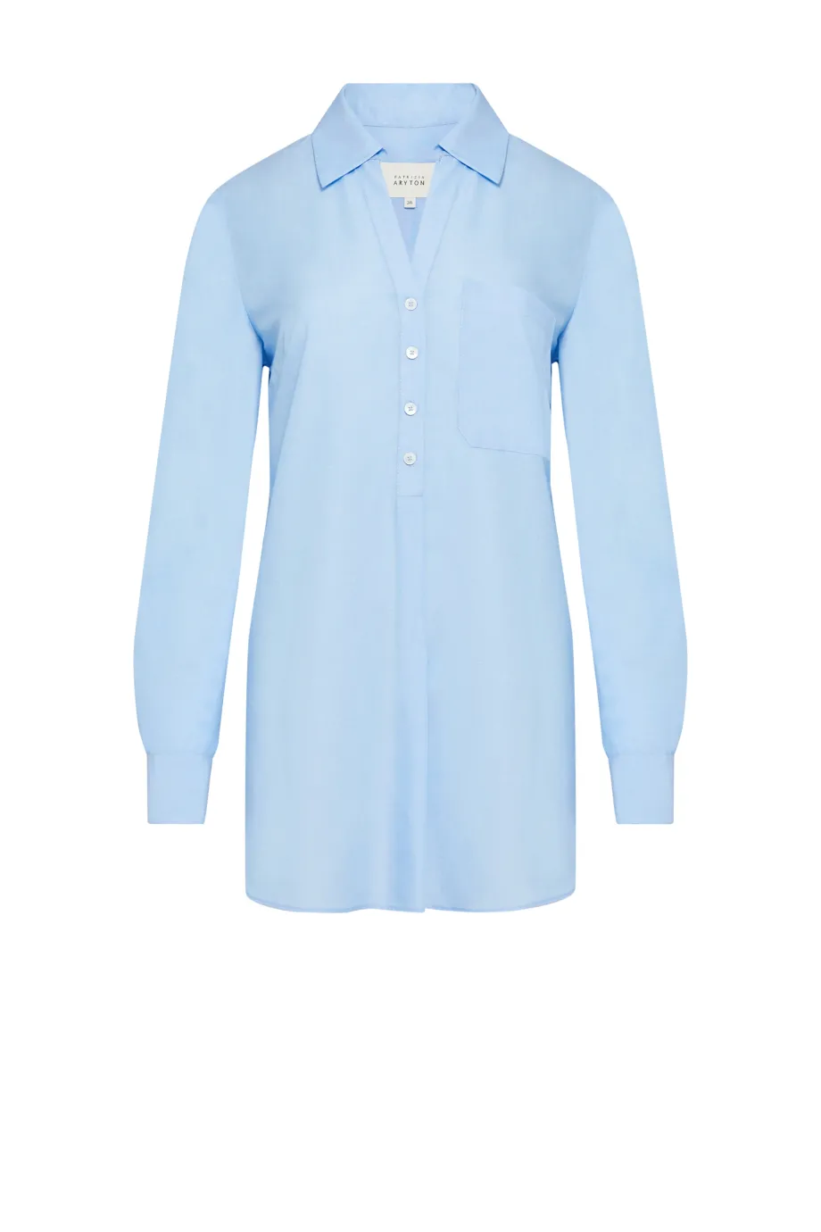 Błękitna koszula damska oversize powstała z przewiewnego i lżejszego od bawełny tencelu. Materiał jest przyjazny dla skóry i sprawia wrażenie chłodzącego skórę. Dodatek włókien pokrzywy poprawia trwałość ubrania i dyskretnie tonuje śliskość tkaniny. Trapezowa koszula błękitna Patrizia Aryton jest dostępna w siedmiu rozmiarach: od 34 do 46.