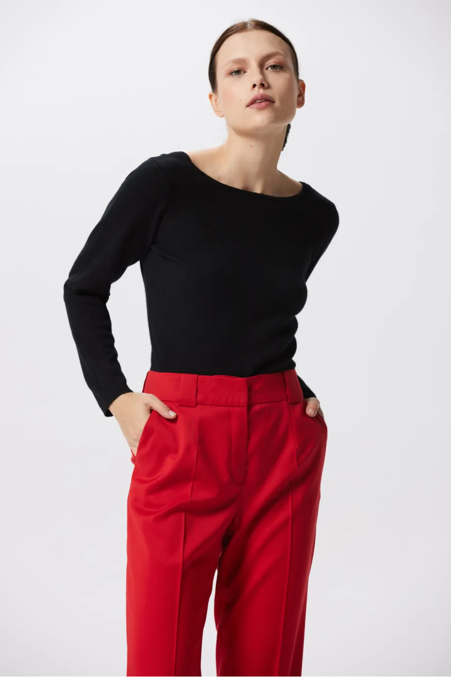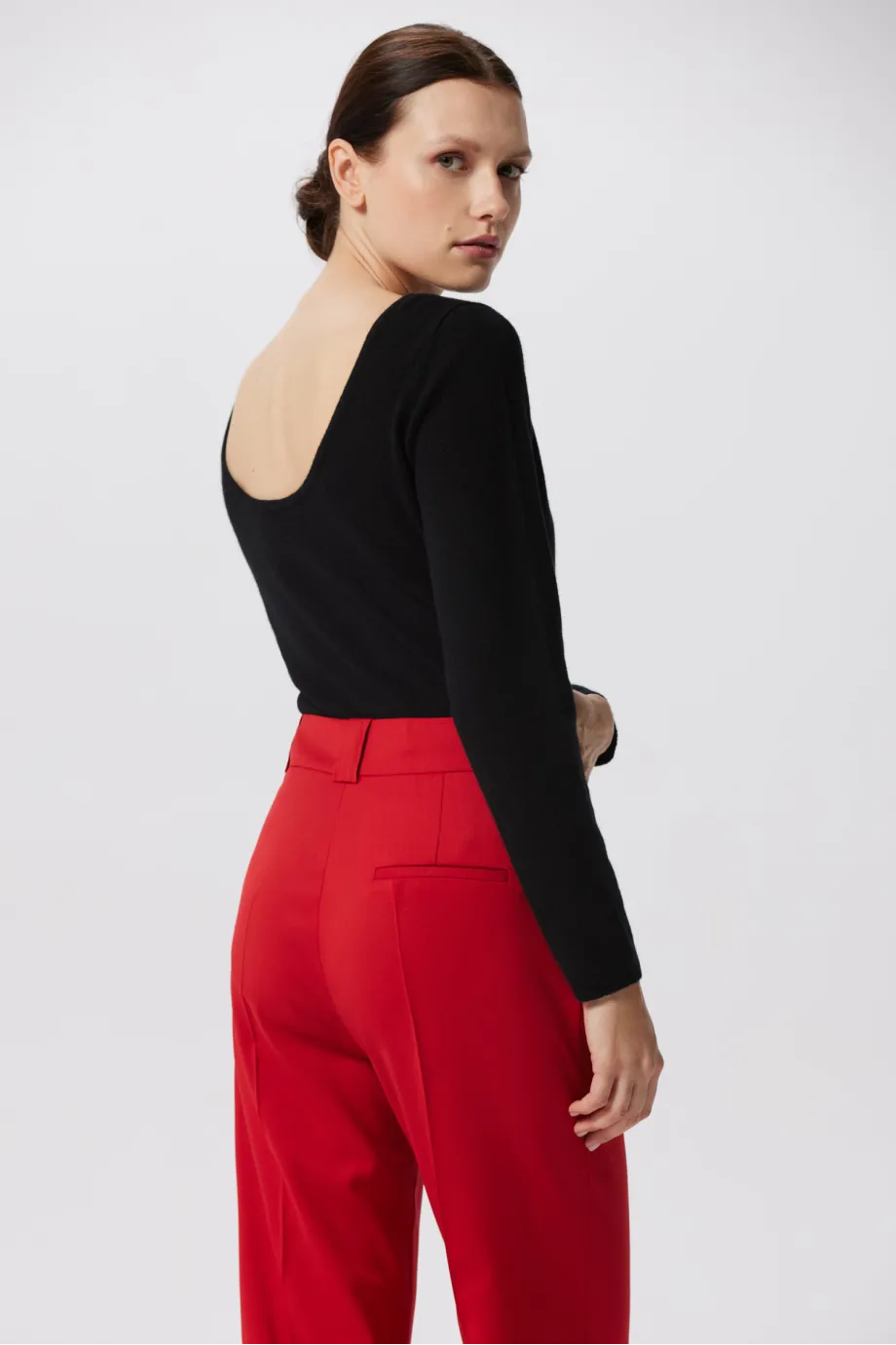 Eleganckie body z długim rękawem powstały z delikatnej w dotyku, otulającej dzianiny, wykonanej splotem single jersey na maszynie o uigleniu 12 GG. Materiał odznacza się dobrą elastycznością i perfekcyjnie dopasowuje się do kształtów ciała, dając mu jednocześnie przyjemny luz. Głębokie wycięcie z tyłu zamiast przedniego dekoltu sprawia, że ubranie możesz potraktować jako bazę zmiękczonych biznesowych stylizacji.