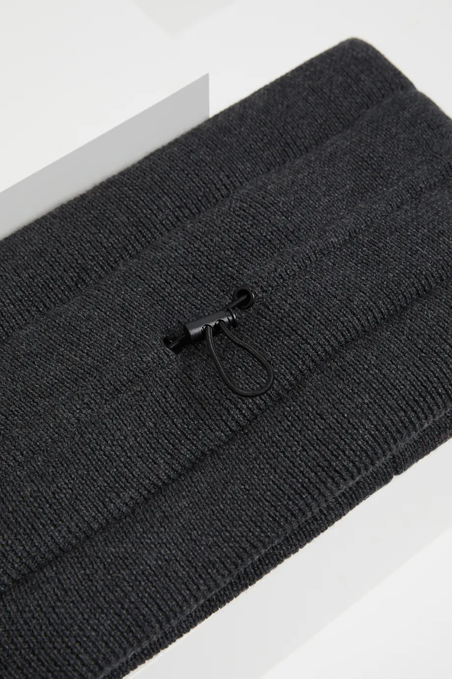 Popielaty komin wełniany Patrizia Aryton wykonano z miękkiej dzianiny powstałej na maszynie o uigleniu 12 GG. Materiał ma drobny i gęsty splot english rib, dlatego dobrze izoluje od zimna i wiatru. Produkt posiada poziome przeszycia a w środku poprowadzono gumowy sznurek, służący do regulacji szerokości celem jak najlepszego dopasowania.
