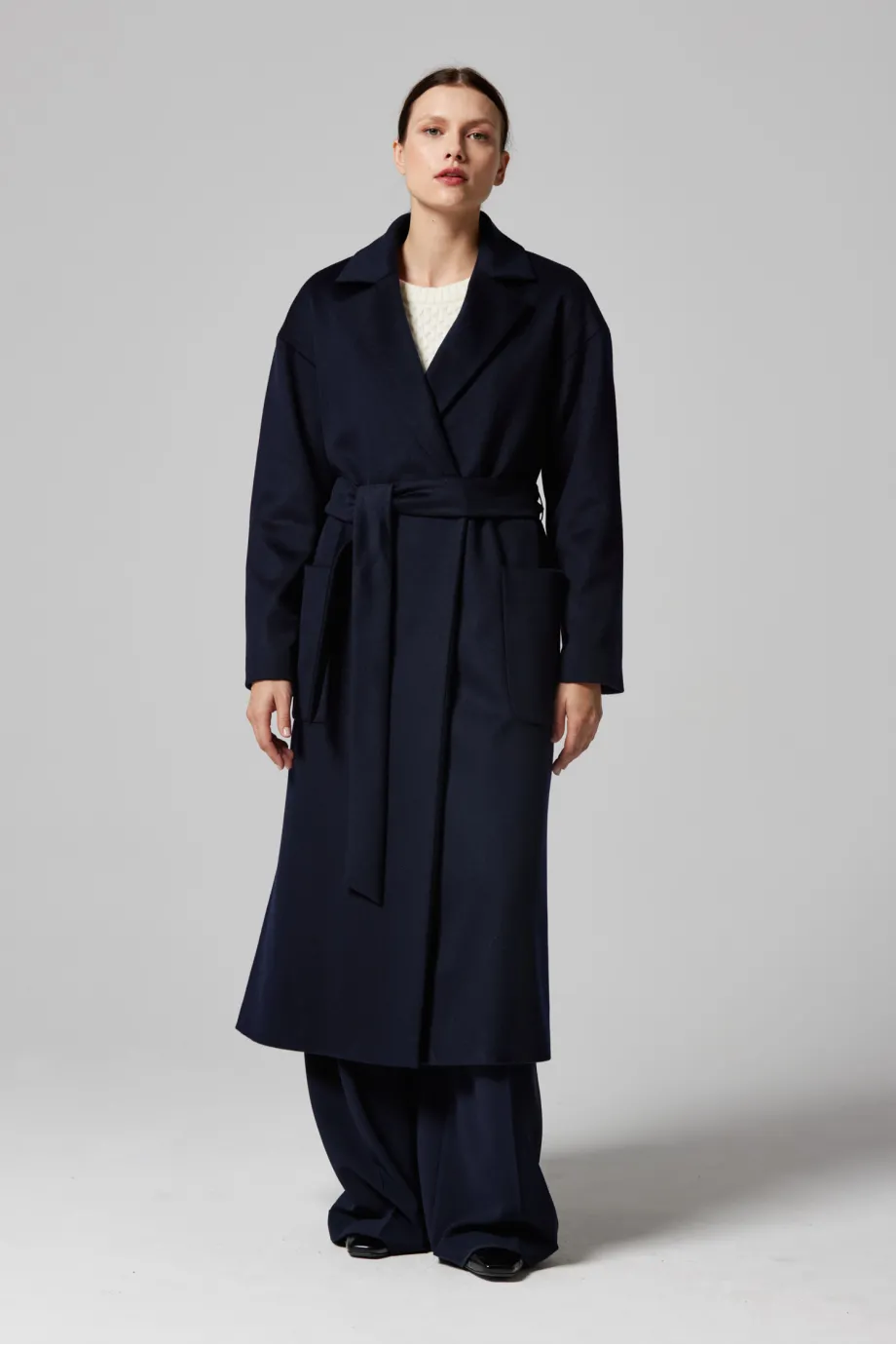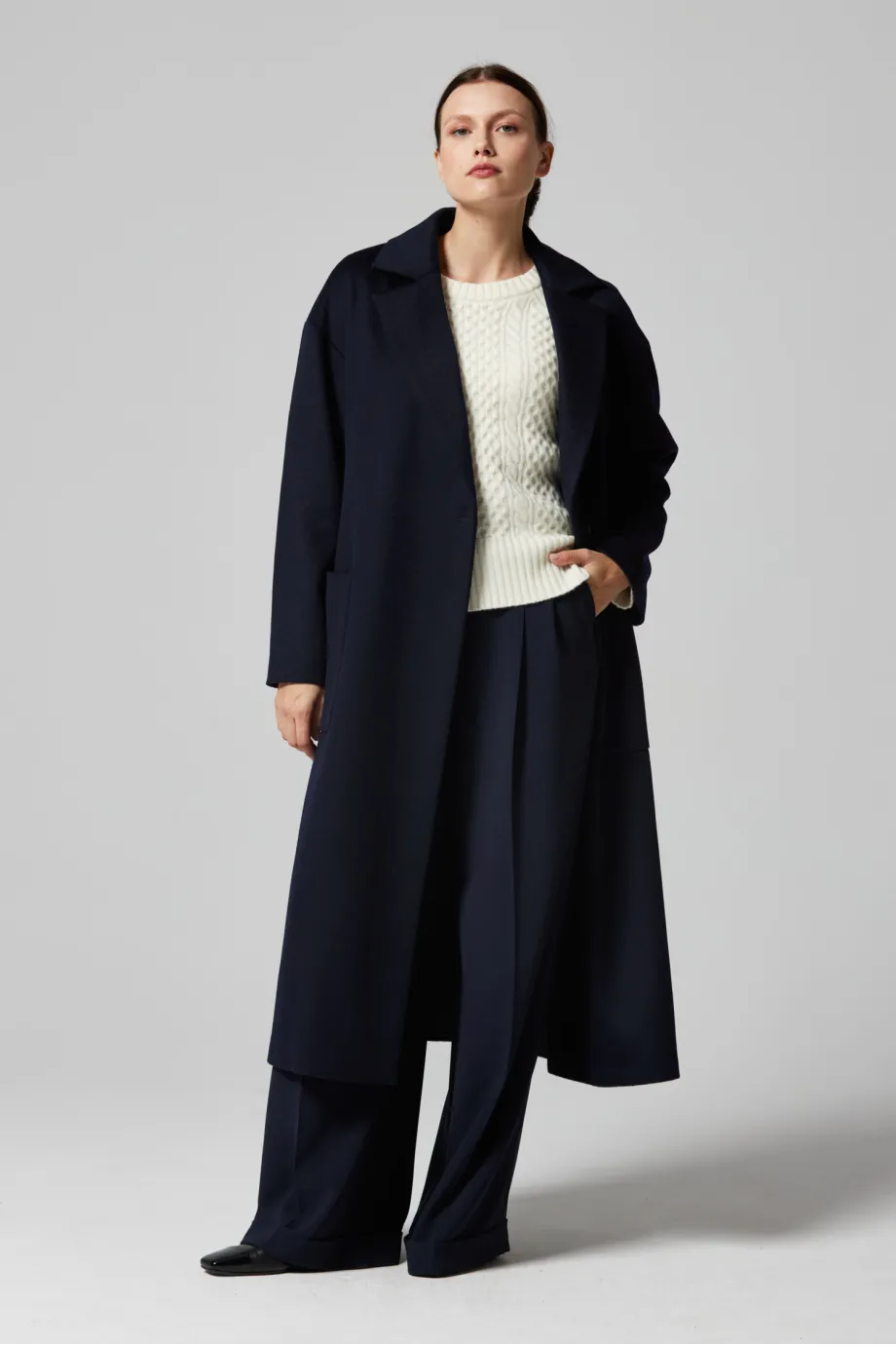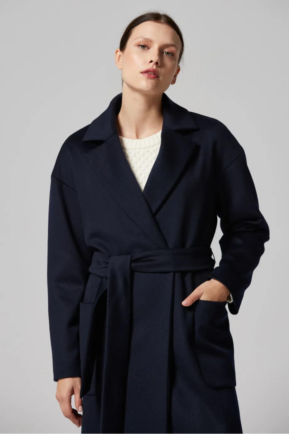Granatowy płaszcz z paskiem pochodzi z aktualnej kolekcji jesień-zima Patrizia Aryton. Okrycie to idealne rozwiązanie nawet na bardzo chłodne dni, dzięki doskonałym właściwościom termicznym wełny oraz przemyślanej konstrukcji. Model wyróżnia się uniwersalnym krojem, który pozwala na tworzenie różnorodnych stylizacji – od codziennych, po bardziej formalne.
