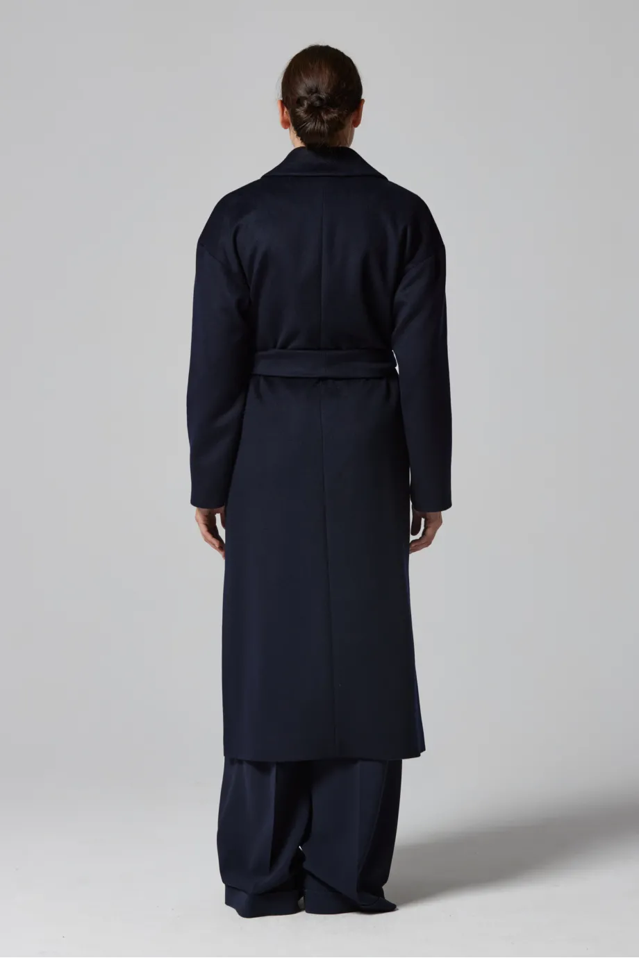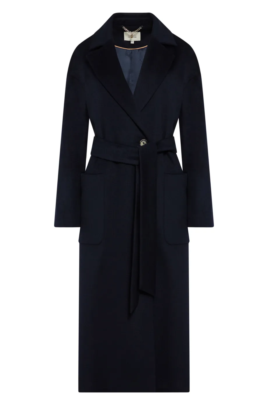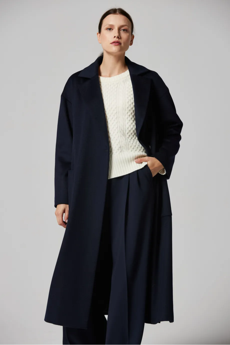 Granatowy płaszcz z paskiem pochodzi z aktualnej kolekcji jesień-zima Patrizia Aryton. Okrycie to idealne rozwiązanie nawet na bardzo chłodne dni, dzięki doskonałym właściwościom termicznym wełny oraz przemyślanej konstrukcji. Model wyróżnia się uniwersalnym krojem, który pozwala na tworzenie różnorodnych stylizacji – od codziennych, po bardziej formalne.