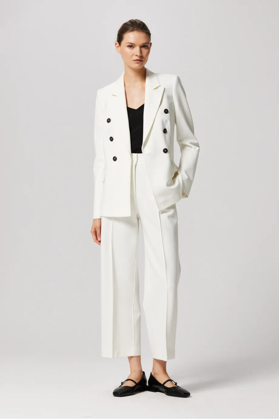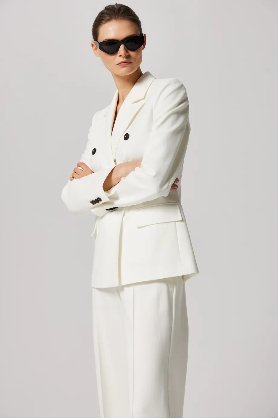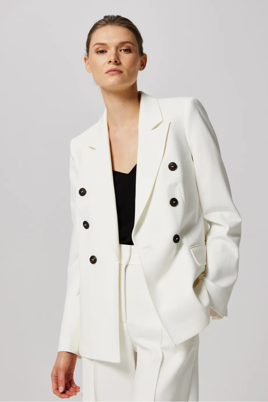 Nasz biały żakiet taliowany powstał z mięsistej dzianiny, która atrakcyjnie układa się na sylwetce, dopasowując się do jej kształtów. Marynarka posiada wszystkie cechy formalnego stroju, takie jak rękawy typu wstawianego, dwurzędowe zapięcie, kołnierz, rozcięcie z tyłu i kieszenie z klapkami. Guziki umieszczono w taki sposób, aby układały się w literę V, co pomaga optycznie wyszczuplić talię.