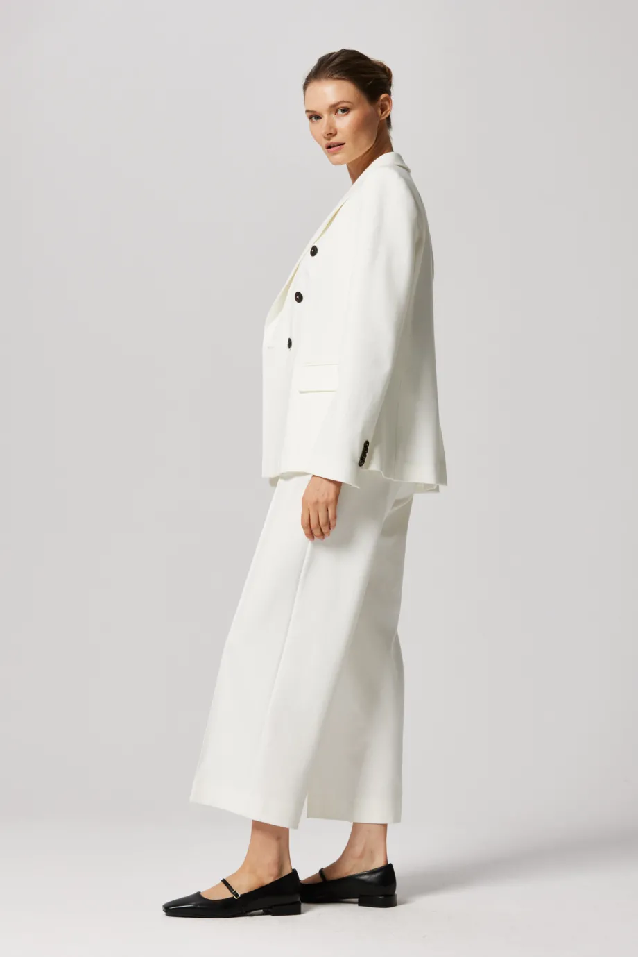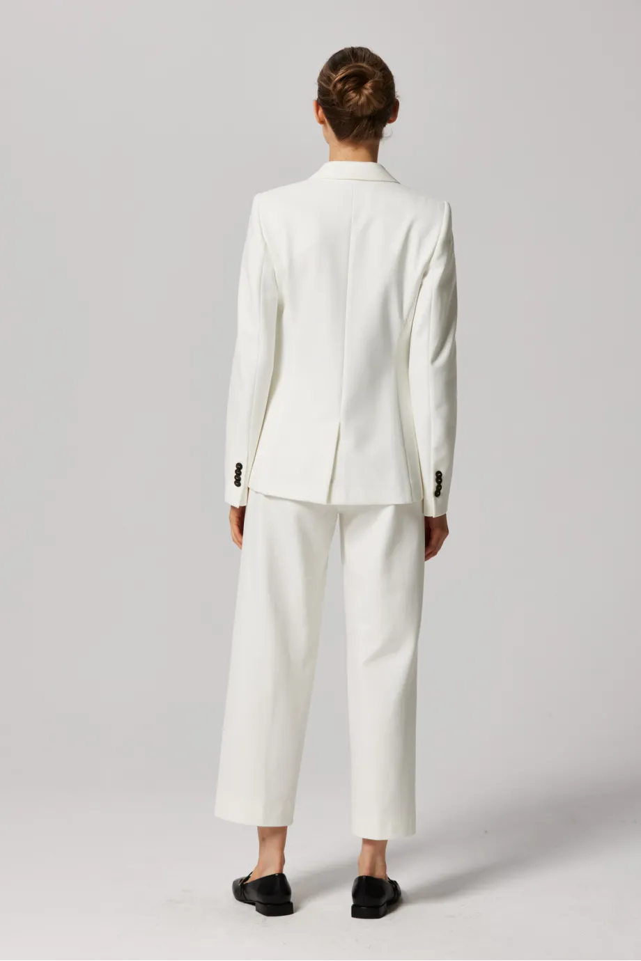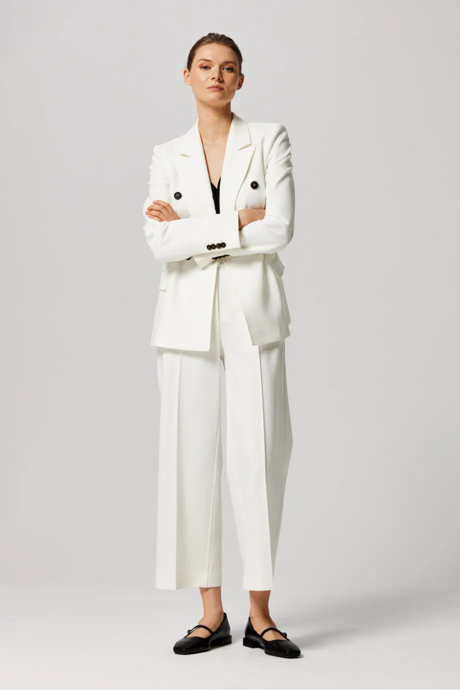 Nasz biały żakiet taliowany powstał z mięsistej dzianiny, która atrakcyjnie układa się na sylwetce, dopasowując się do jej kształtów. Marynarka posiada wszystkie cechy formalnego stroju, takie jak rękawy typu wstawianego, dwurzędowe zapięcie, kołnierz, rozcięcie z tyłu i kieszenie z klapkami. Guziki umieszczono w taki sposób, aby układały się w literę V, co pomaga optycznie wyszczuplić talię.