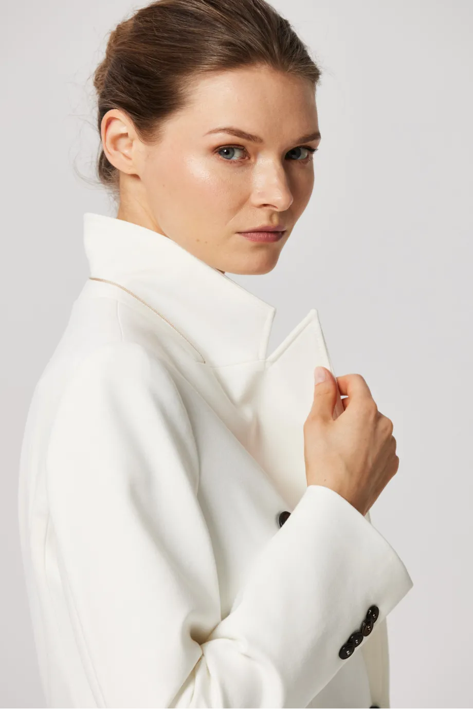 Nie sposób nie zwrócić uwagi na detale wykończenia, z precyzji którego słynie marka Patrizia Aryton. Kołnierz w szpic ozdobiono stebnowaniem, a wnętrze marynarki lamówką w kolorze chłodnego beżu. To dla Ciebie wskazówka, z którym odcieniem śmietanowy żakiet damski dwurzędowy warto łączyć w tym sezonie, aby zaakcentować jego piękno.