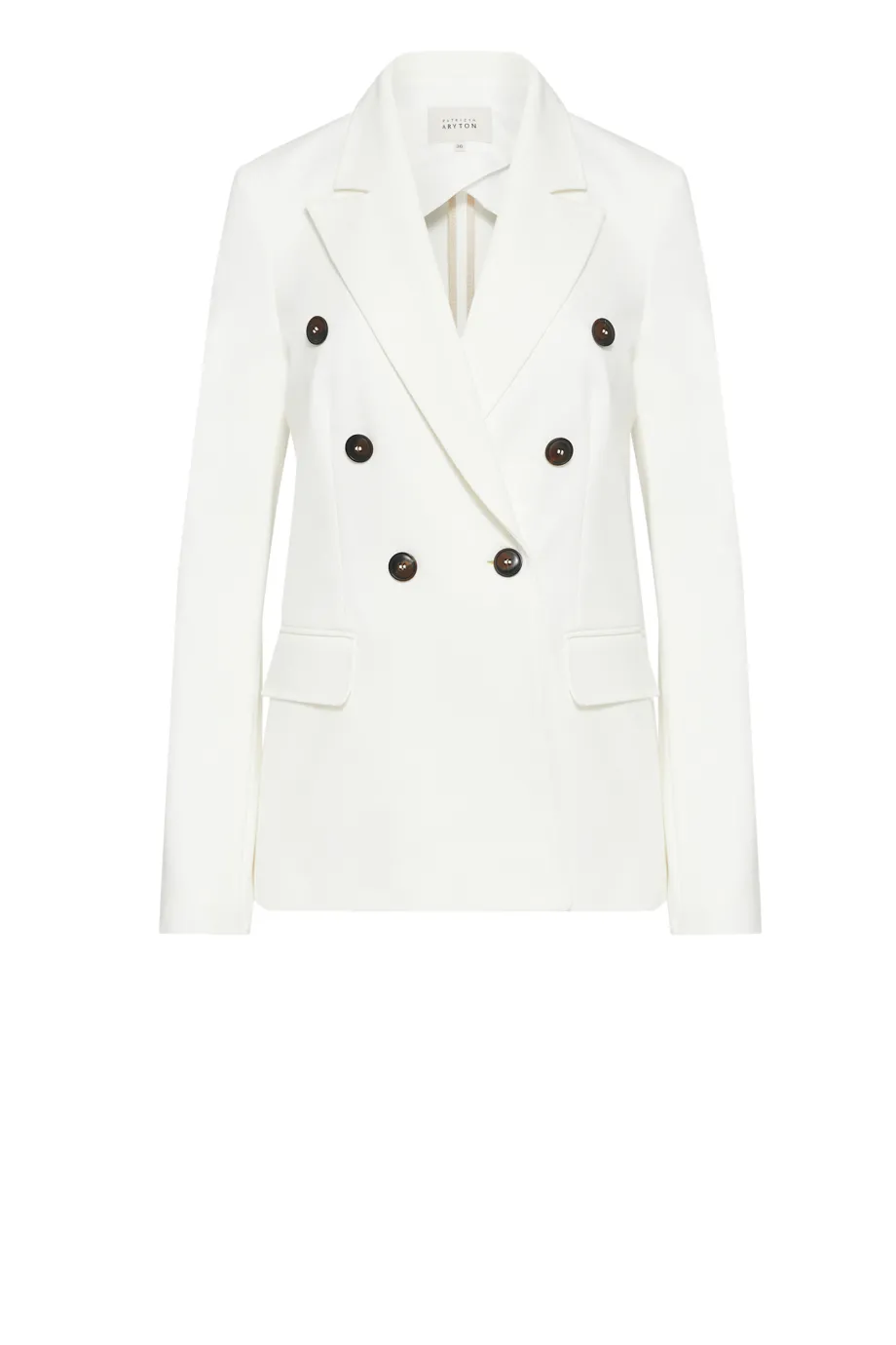 Żakiet długi taliowany Patrizia Aryton uszyto z dobrze znanej już miłośniczkom marki dzianiny, składającej się z przyjemnej wiskozy, funkcjonalnego poliamidu i nadającego sprężystość elastanu. Wierzchni materiał osadzono na półpodszewce. Guziki na rękawach i w klapach marynarki powstały z rogu bawolego, a dodatkowy wewnętrzny guzik, służący do pozycjonowania żakietu, z orzecha corozo. Biały żakiet z wiskozy kupisz w rozmiarach 34-46.