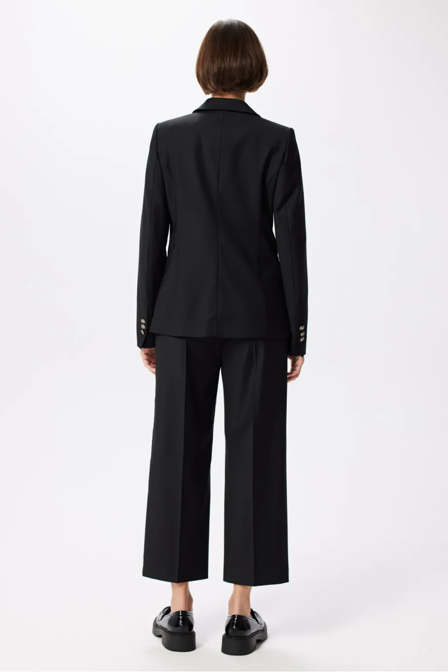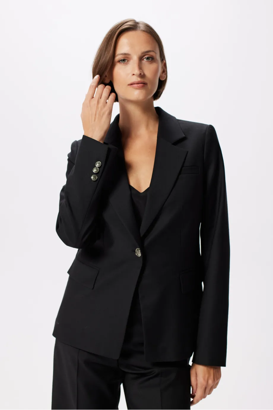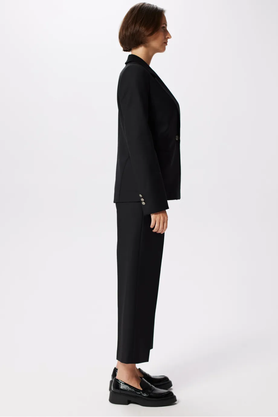 Wełniany żakiet damski Patrizia Aryton ma głęboki czarny odcień. Nadaje się do tworzenia modnych total looków oraz zestawiania z odzieżą w każdym innym kolorze. Jeśli kochasz podążać za trendami, wypróbuj hitowe obecnie połączenie czerni żakietu ze śmietaną, ciepłym beżem, granatem, cegłą, śliwkową czerwienią, militarną zielenią, błękitem, ciemną szarością lub taupe, występującymi na spodniach czy spódnicy.
