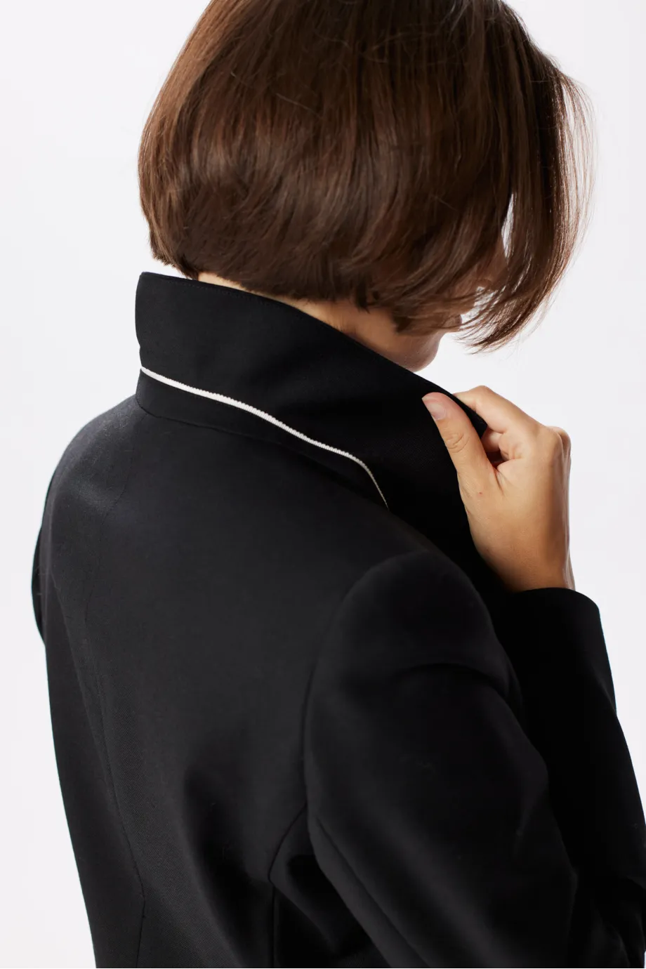 Nasz czarny żakiet taliowany posiada zapięcie na jeden guzik z emblematem. Jego mniejsze wersje znajdują się na zakończeniach długich rękawów typu wstawianego. Na uwagę zasługują detale wykończenia, takie jak ozdobny piping i lamowanie od wewnątrz w odcieniach beżu, a także kontrastowa biała lamówka pod kołnierzem. Dziękie niej, kołnierz po postawieniu prezentuje się niezwykle efektownie i oryginalnie. Do zestawu z żakietem polecamy spodnie z tej samej tkaniny, z szeroką nogawką ⅞.