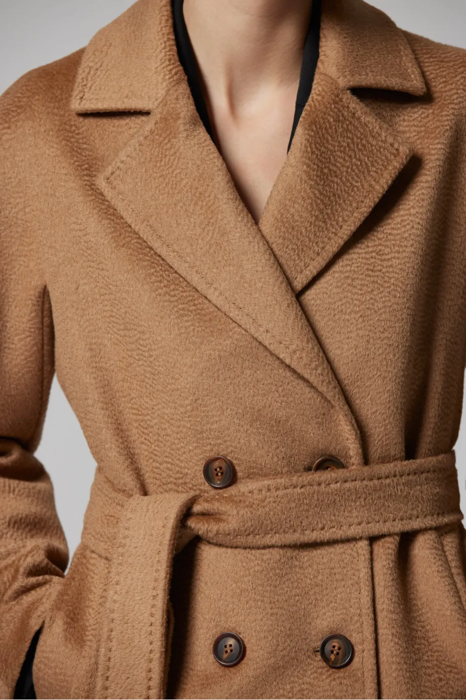 Ten wełniany płaszcz z paskiem został wykonany z najwyższej jakości wełny wielbłądziej, charakteryzującej się krótkim włosiem, które doskonale pozycjonuje sylwetkę. Tkanina premium, o delikatnym połysku i efekcie falistej struktury z wykończeniem zibellino, sprawia, że każdy Twój ruch w tym modelu stanie się wyrazem prawdziwej elegancji. Płaszcz w modnym kolorze camel nie tylko dopełni każdą stylizację, ale także stworzy harmonijną paletę kolorystyczną, podkreślając elegancję i subtelność.