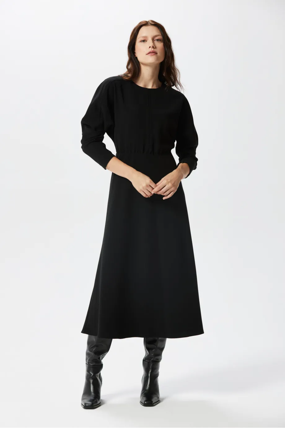 Sukienka midi rozkloszowana ma głęboką czarną barwę. Dobierz buty i torebkę w tym samym kolorze, a zbudujesz wysmakowany i supermodny total look. Dopasuj pozostałe elementy outfitu w dowolnym odcieniu bazowym, aby stworzyć ponadczasową, szykowną stylizację.