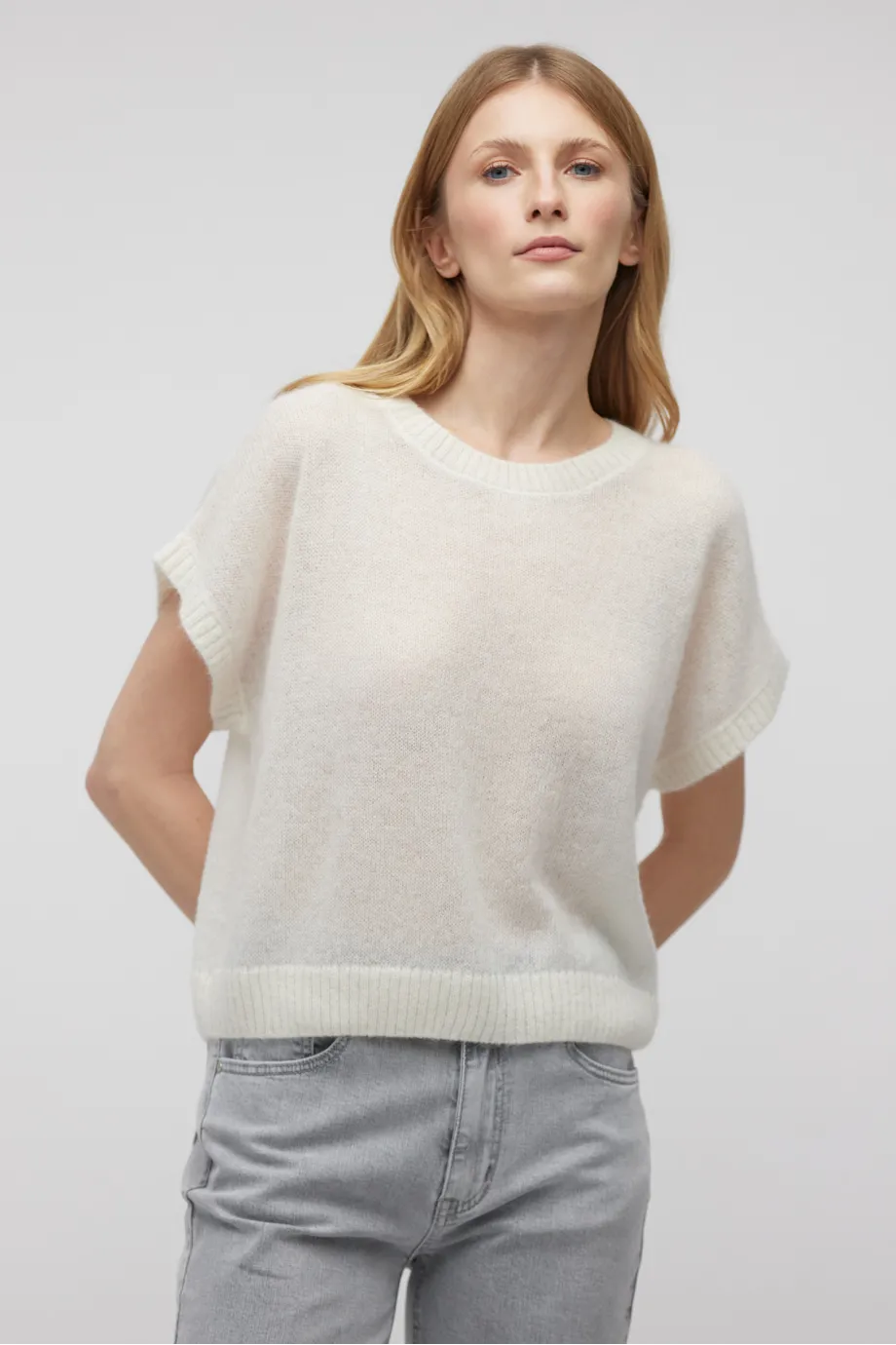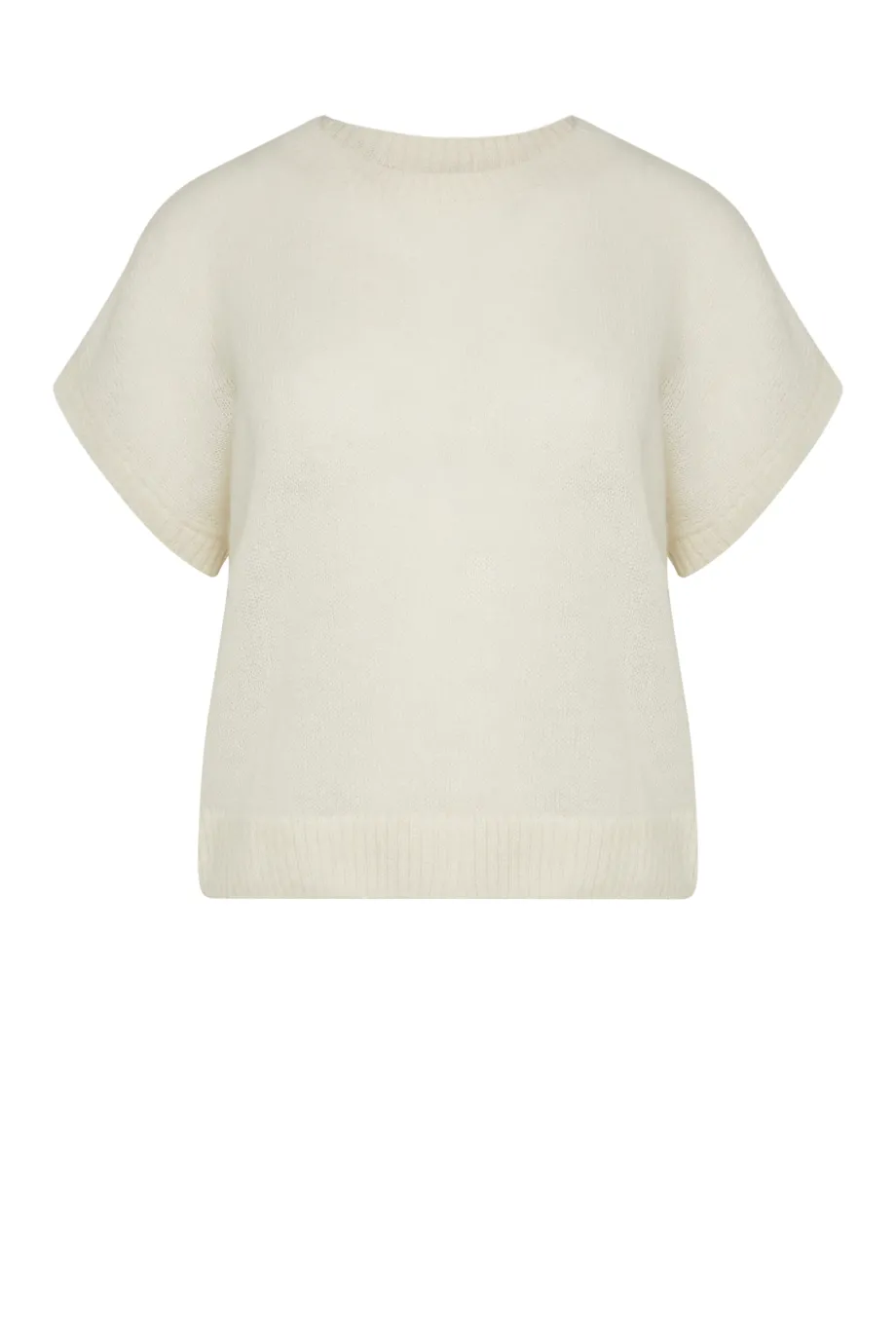 Śmietankowa bluzka sweterkowa z krótkim rękawem i okrągłym dekoltem