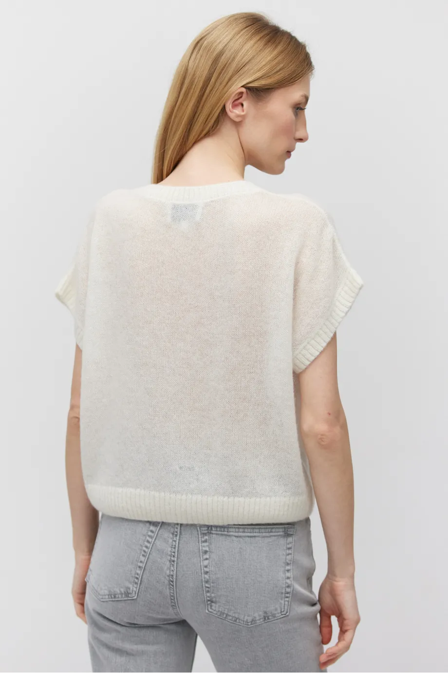 - Śmietankowa bluzka z krótkim rękawem i okrągłym dekoltem