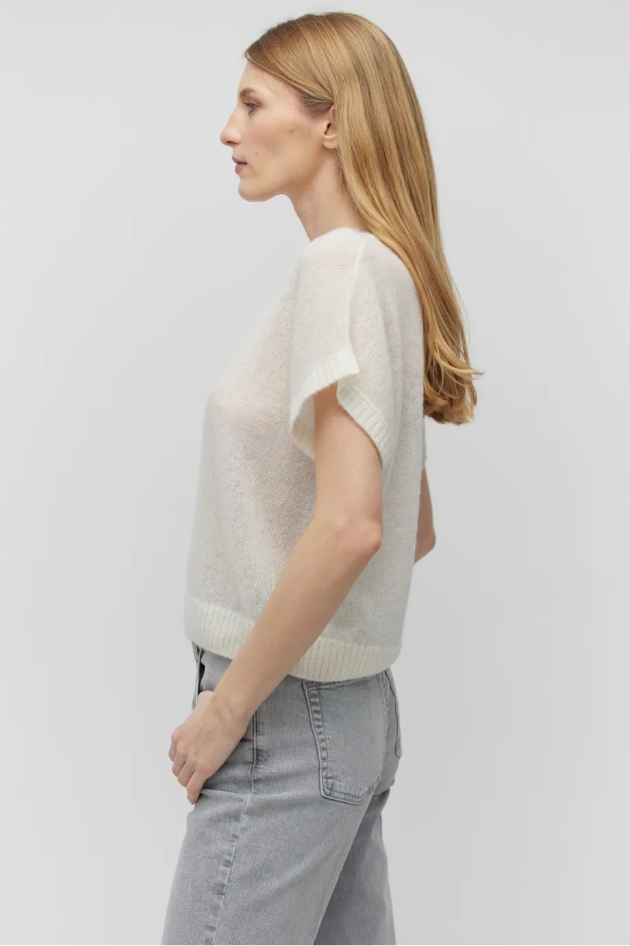 Lekka i elegancka śmietankowa bluzka z okrągłym dekoltem doskonale sprawdzi się zarówno w biurze, jak i podczas weekendowego wypadu do ulubionej kawiarenki – niezobowiązująca, a jednocześnie pełna klasy. Krótki rękaw oraz okrągły dekolt podkreślają subtelny, ale nowoczesny charakter tego modelu. Luźny fason zapewnia swobodę ruchu i doskonale układa się na sylwetce, tworząc nonszalancki, ale dopracowany look. Połączenie luźnego splotu jersey stitch z techniką rib 2x2 nadaje jej unikalnej struktury, co sprawia, że nasza dzianinowa bluzka z krótkim rękawem jest nie tylko wygodna, ale i niezwykle stylowa.