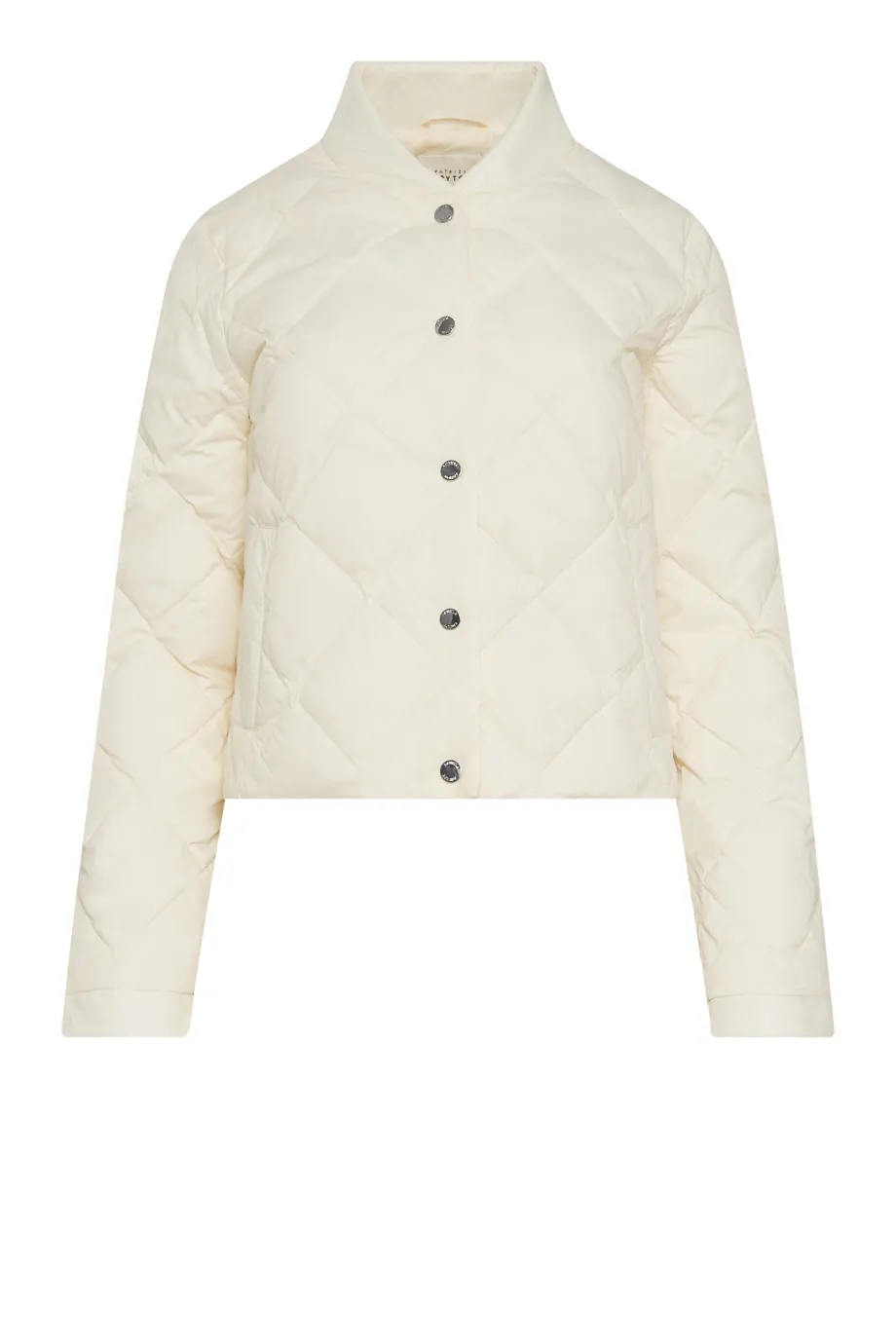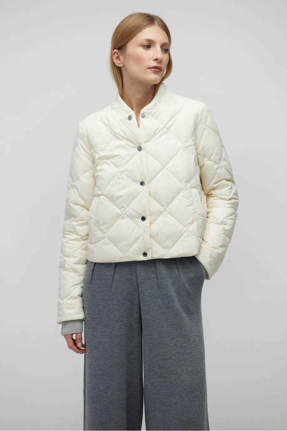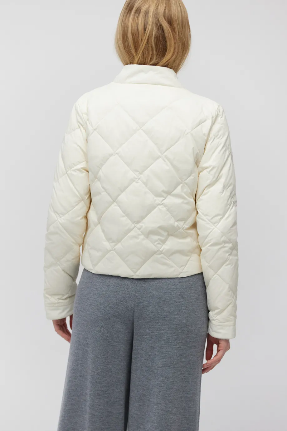 - Krótka kurtka w kolorze śmietankowej bieli, z naturalnym puchowym wypełnieniem