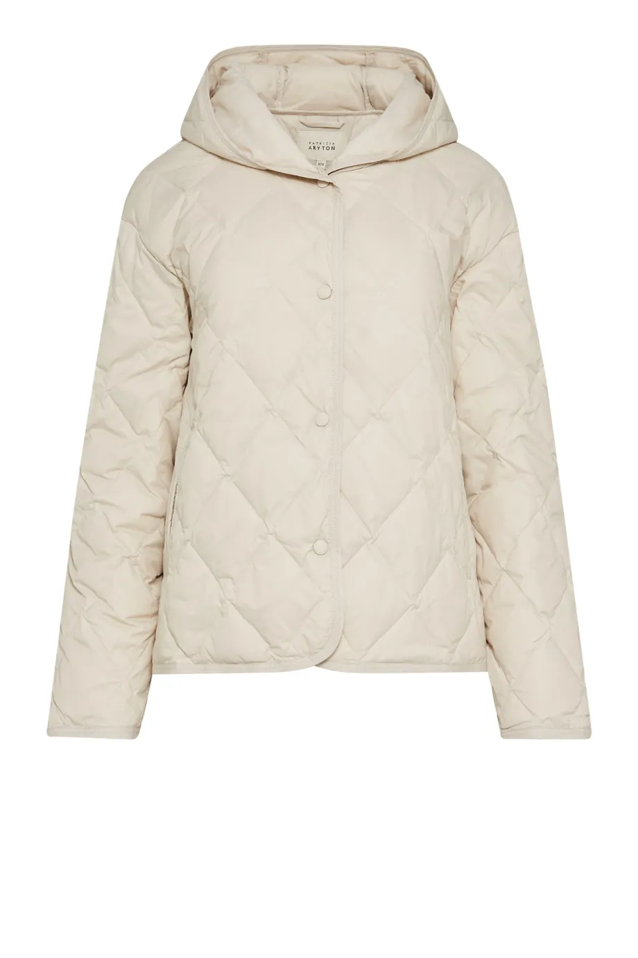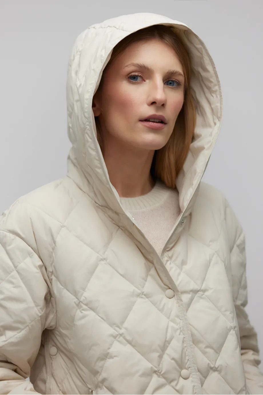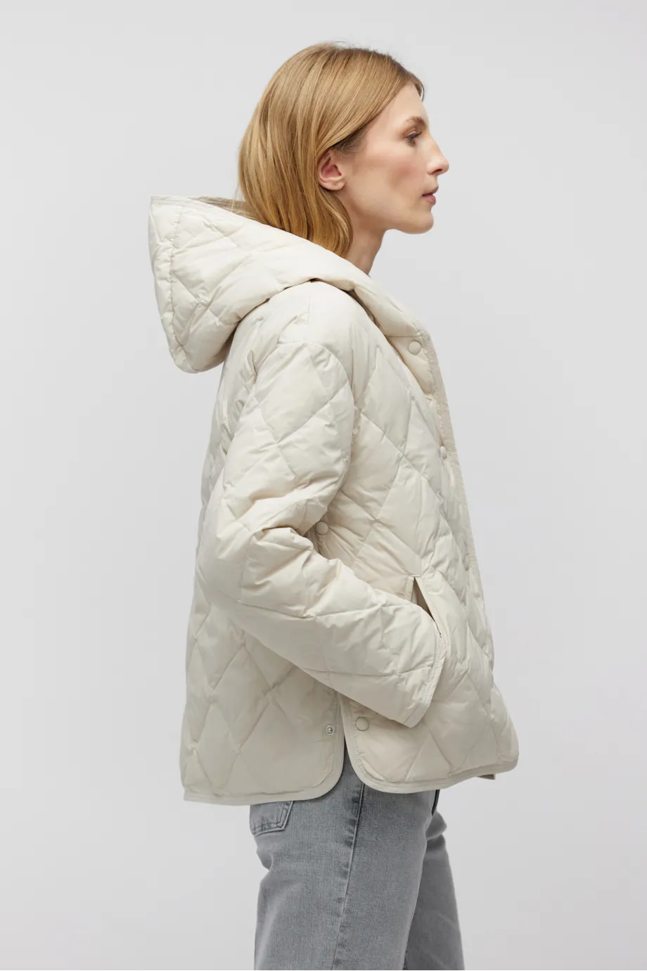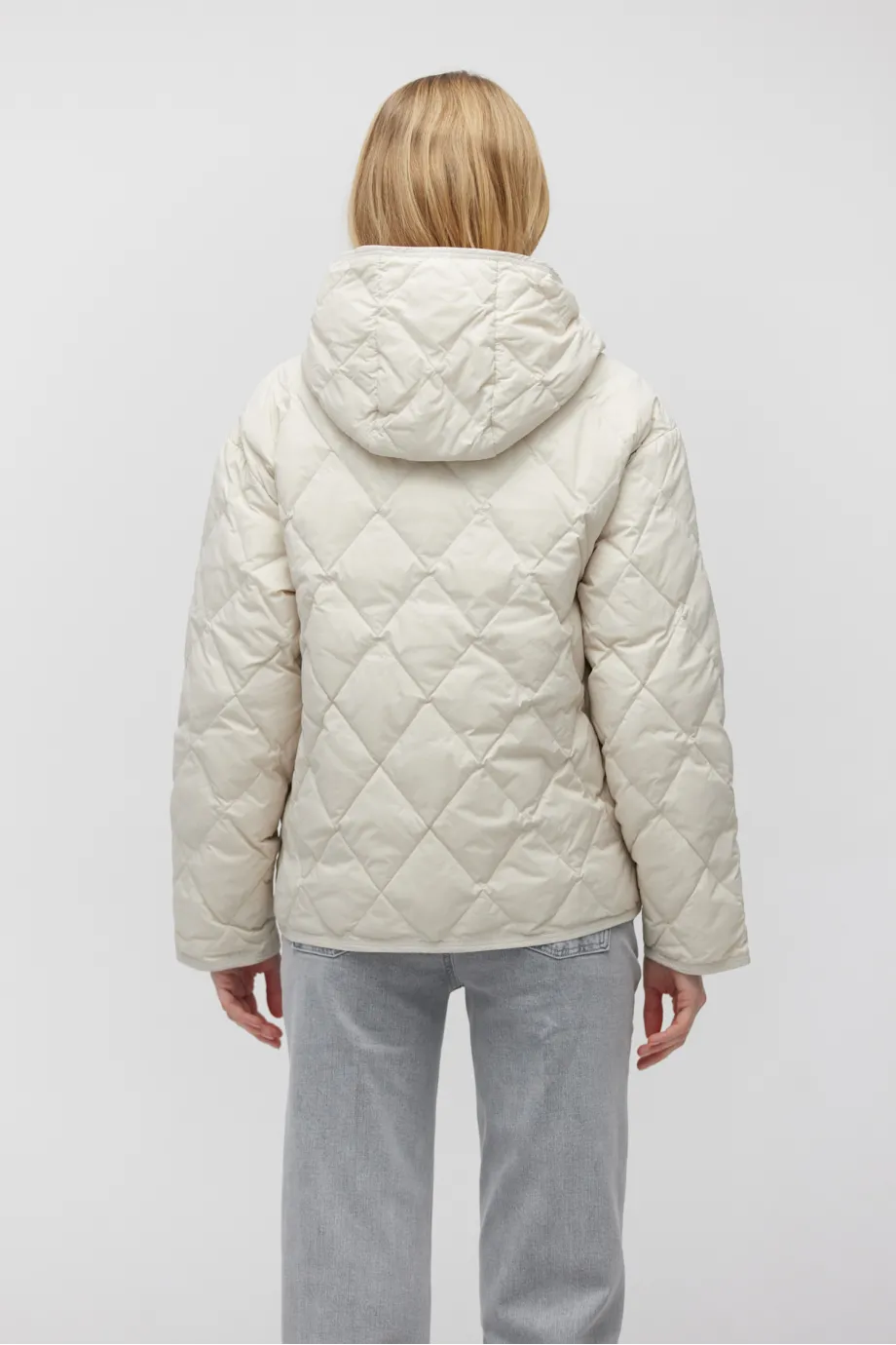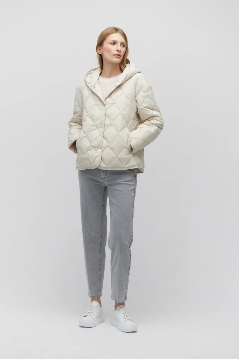 - Krótka kurtka z kapturem w chłodnym odcieniu beżu, z naturalnym puchowym wypełnieniem