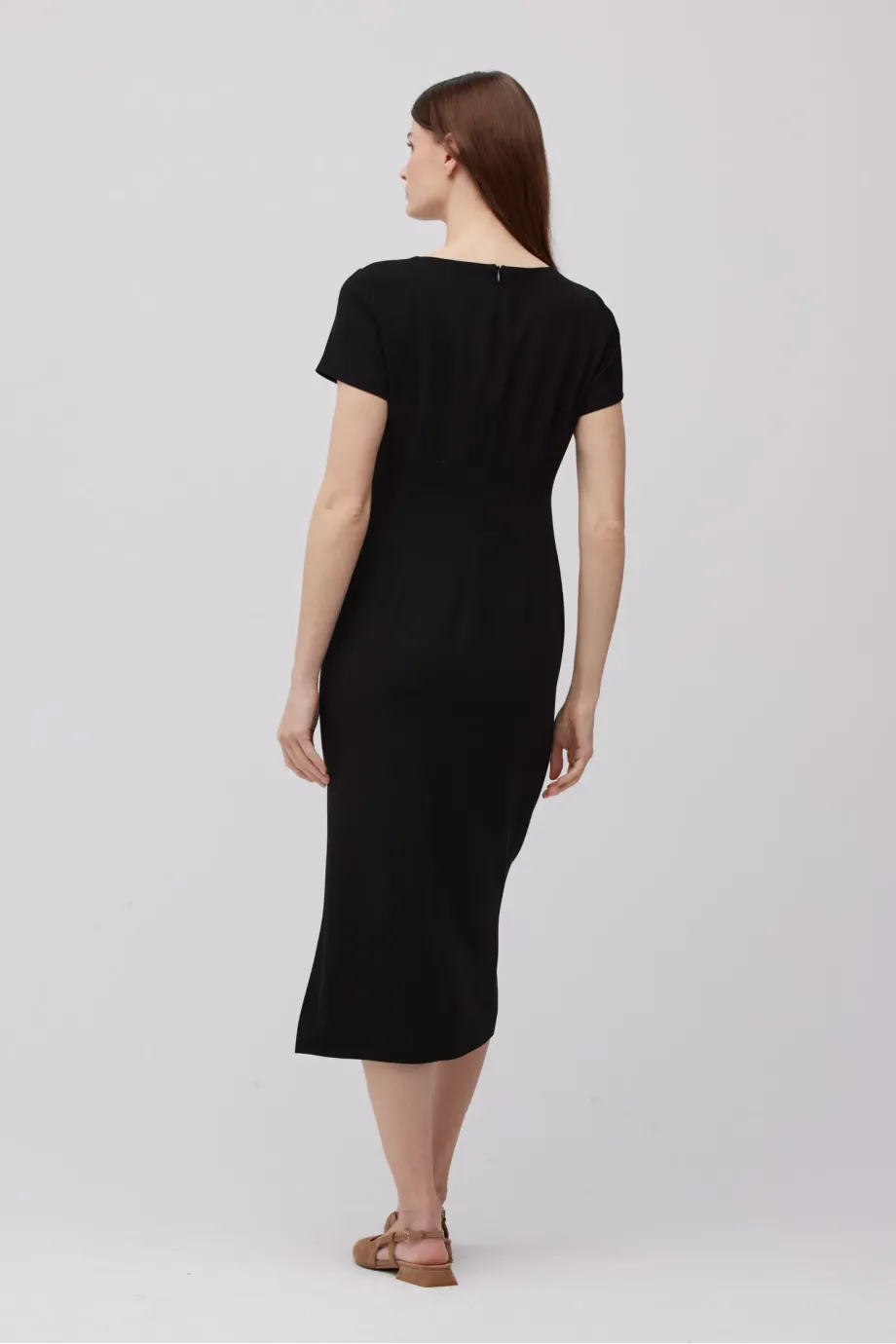 - Czarna sukienka midi z krótkim rękawem i okrągłym dekoltem
