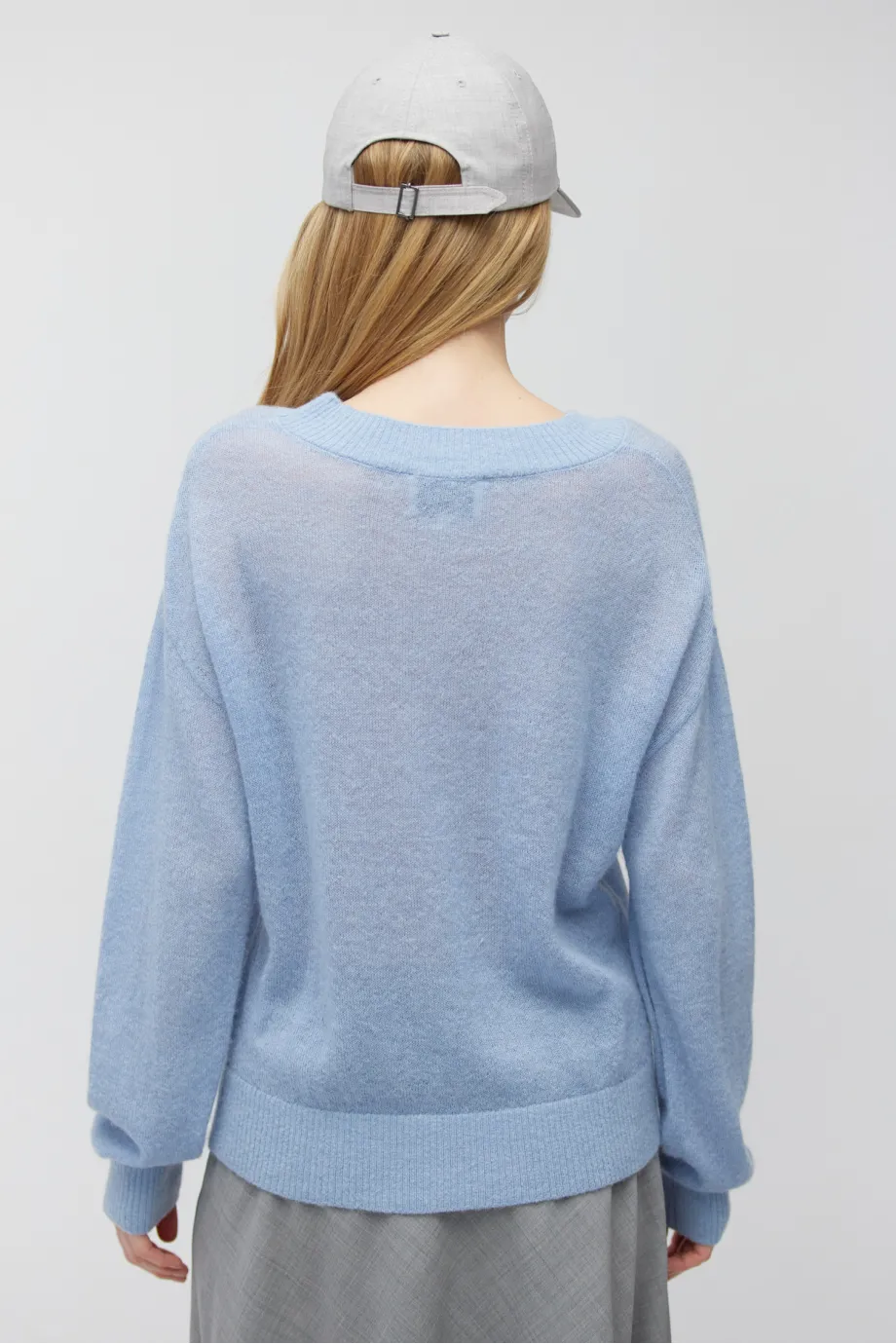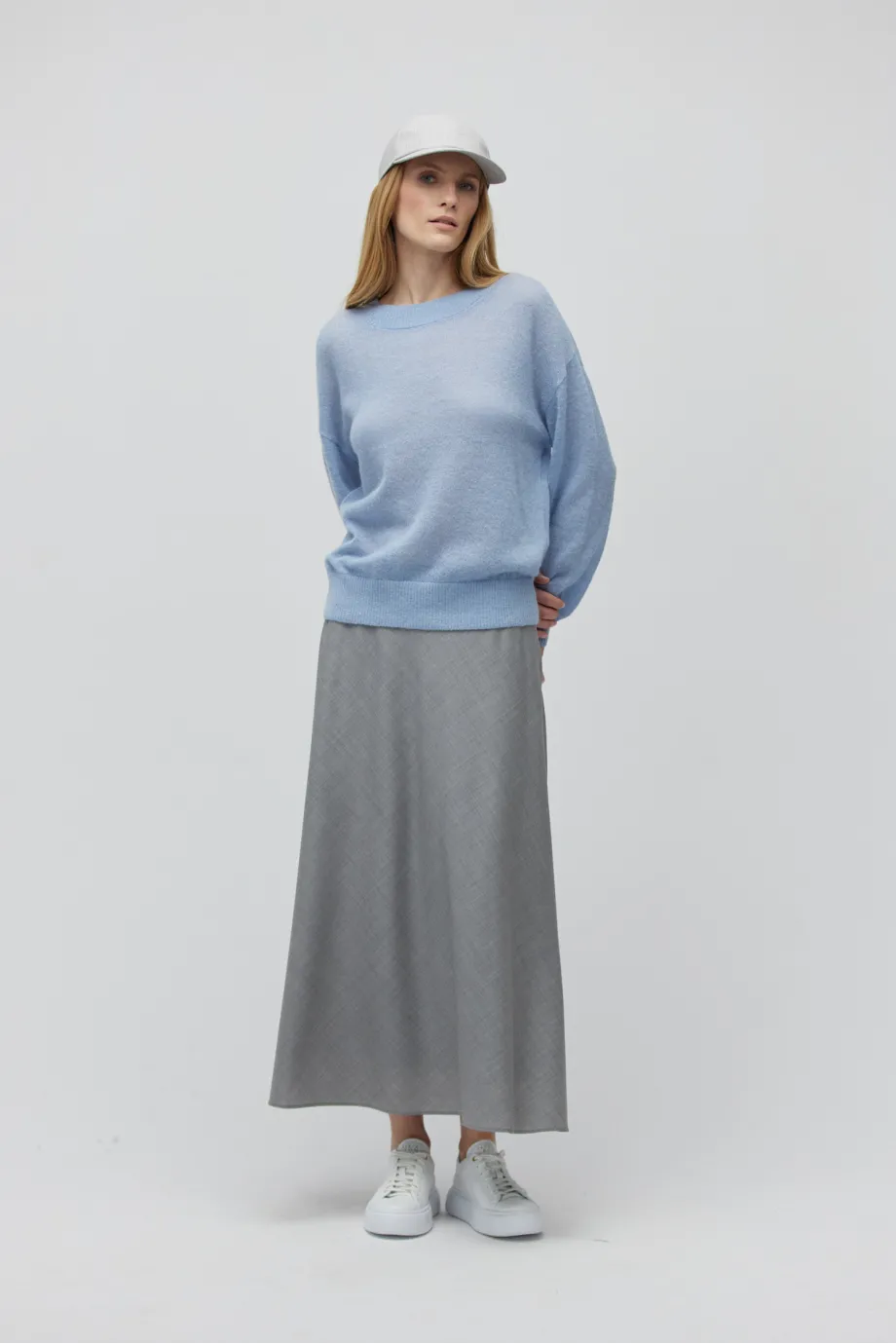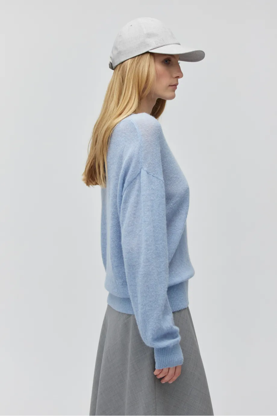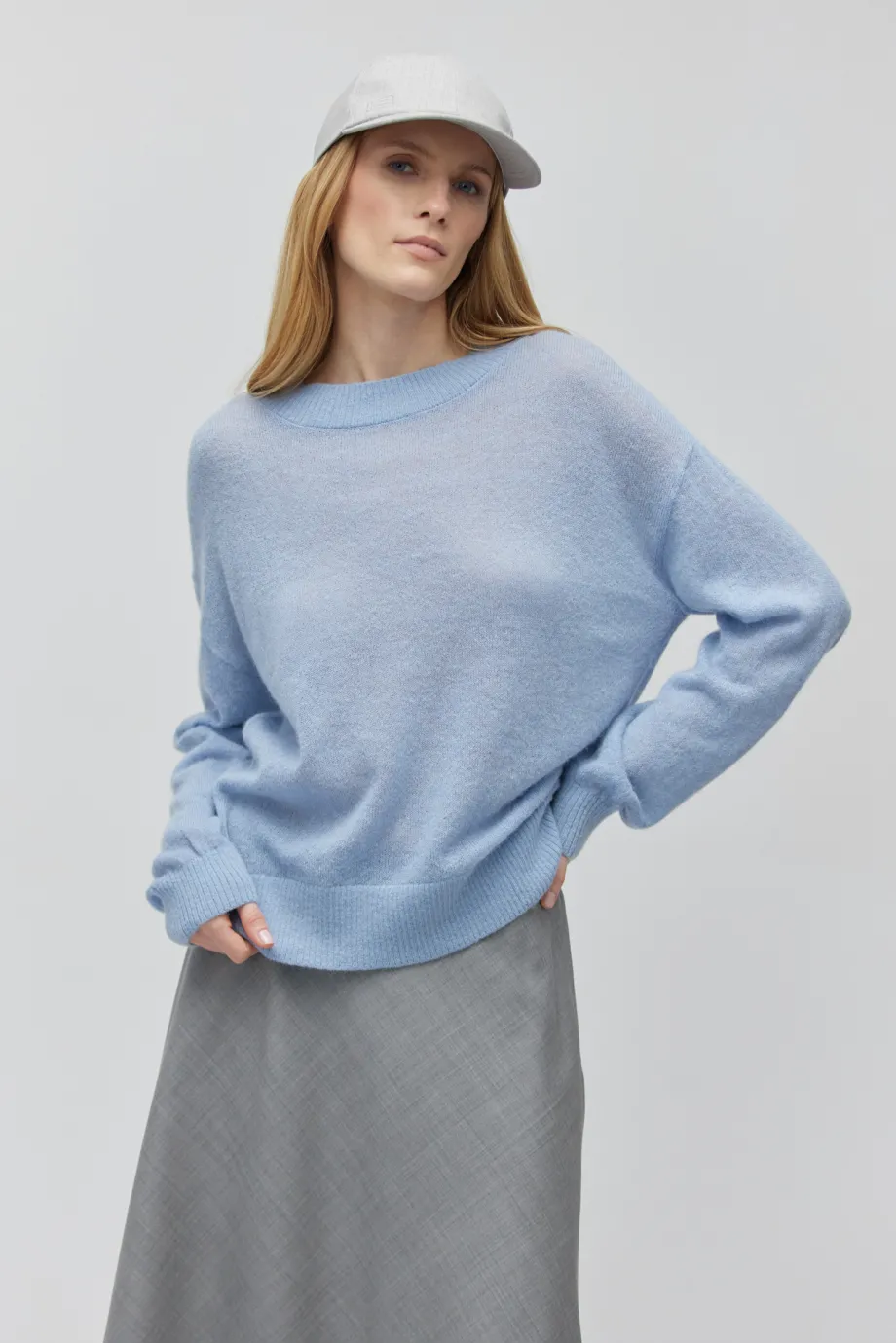- Błękitna bluzka z wełną alpaki, z długim rękawem i okrągłym dekoltem