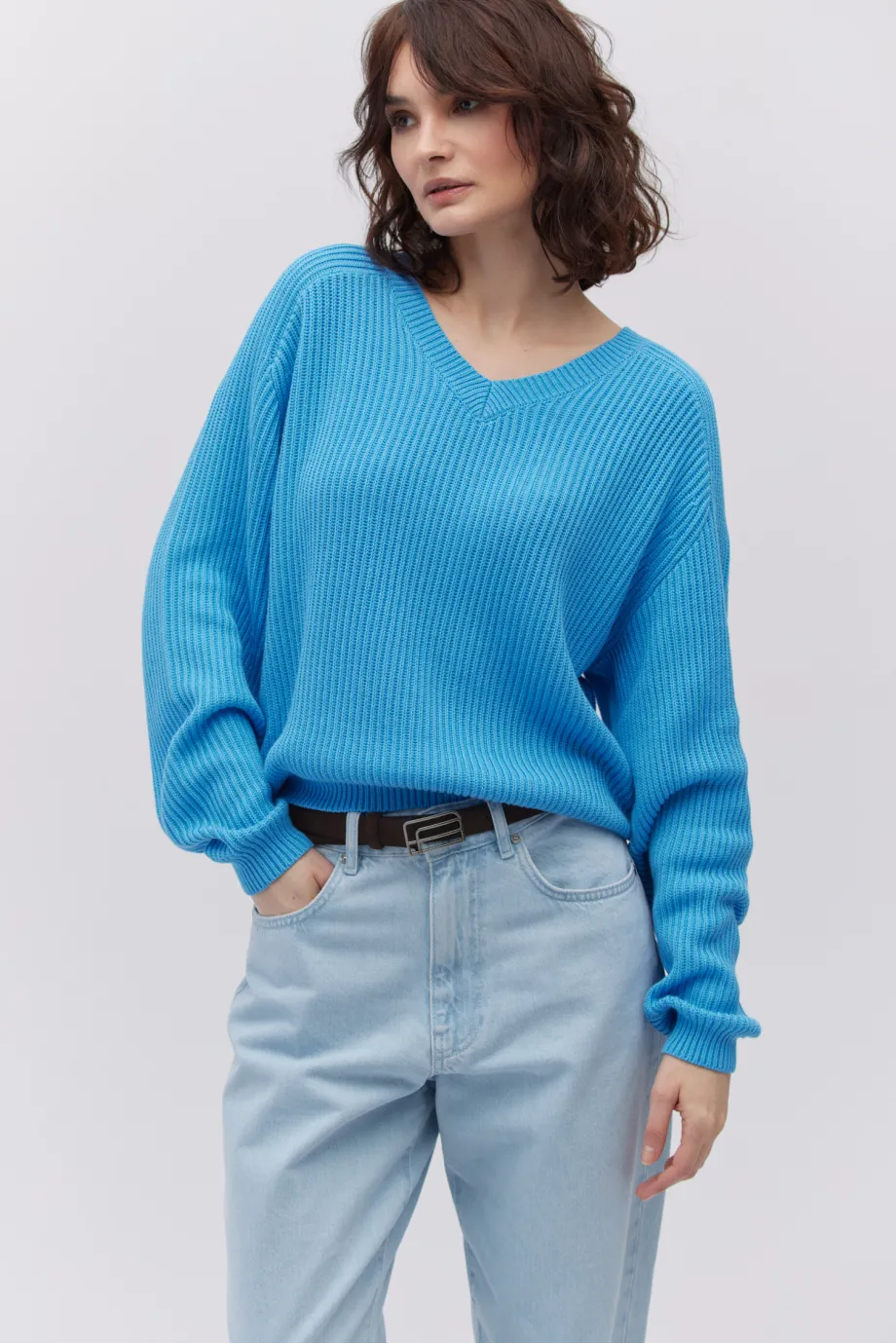 Niebieski sweter damski w serek ma również ciekawą fakturę. Został wykonany z dzianiny w splocie full cardigan, która powstała na maszynie o uigleniu 7GG. Cechuje go więc trójwymiarowość powierzchni, ale i lekkość. Noś go tak jak lubisz, nadając mu pożądany charakter – casualowo z jeansami lub dresowymi spodniami, sportowo z joggerami i sneakersami lub smart casualowo z elegancką spódnicą lub cygaretkami.